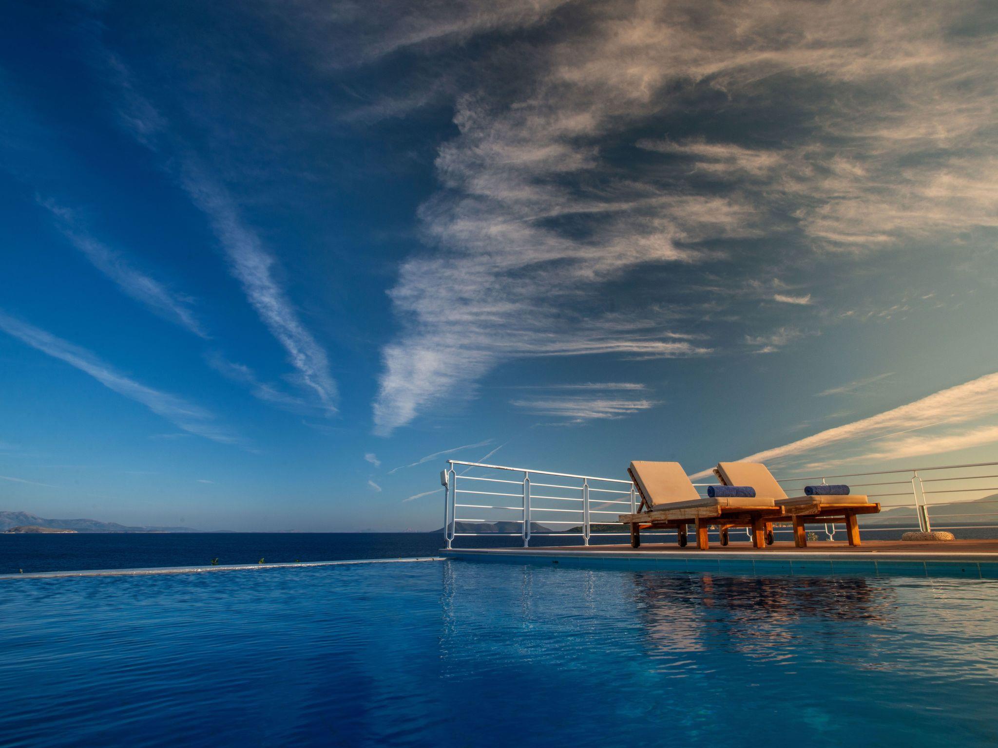 Karavi Villa (Seafront Panorama) stands out for its panoramic 270° views over the Ionian Sea and neighboring islands, evoking the feeling of relaxing on a ship’s deck. It invites families and friends to reconnect under sunny skies and star-filled nights, in a sanctuary of comfort and sophistication.
