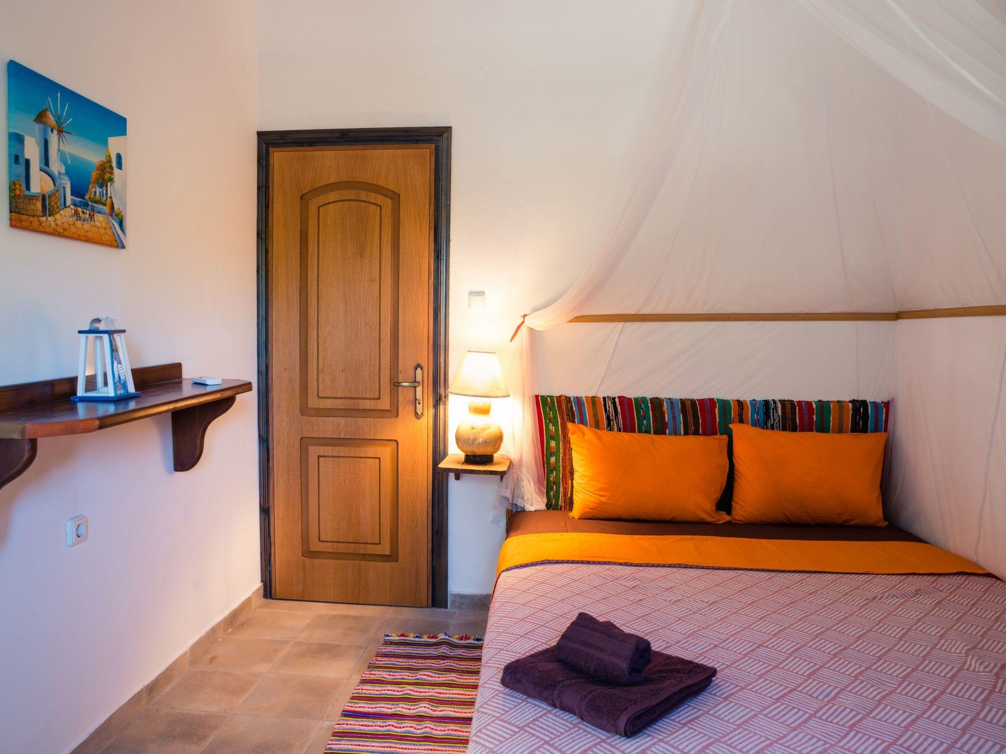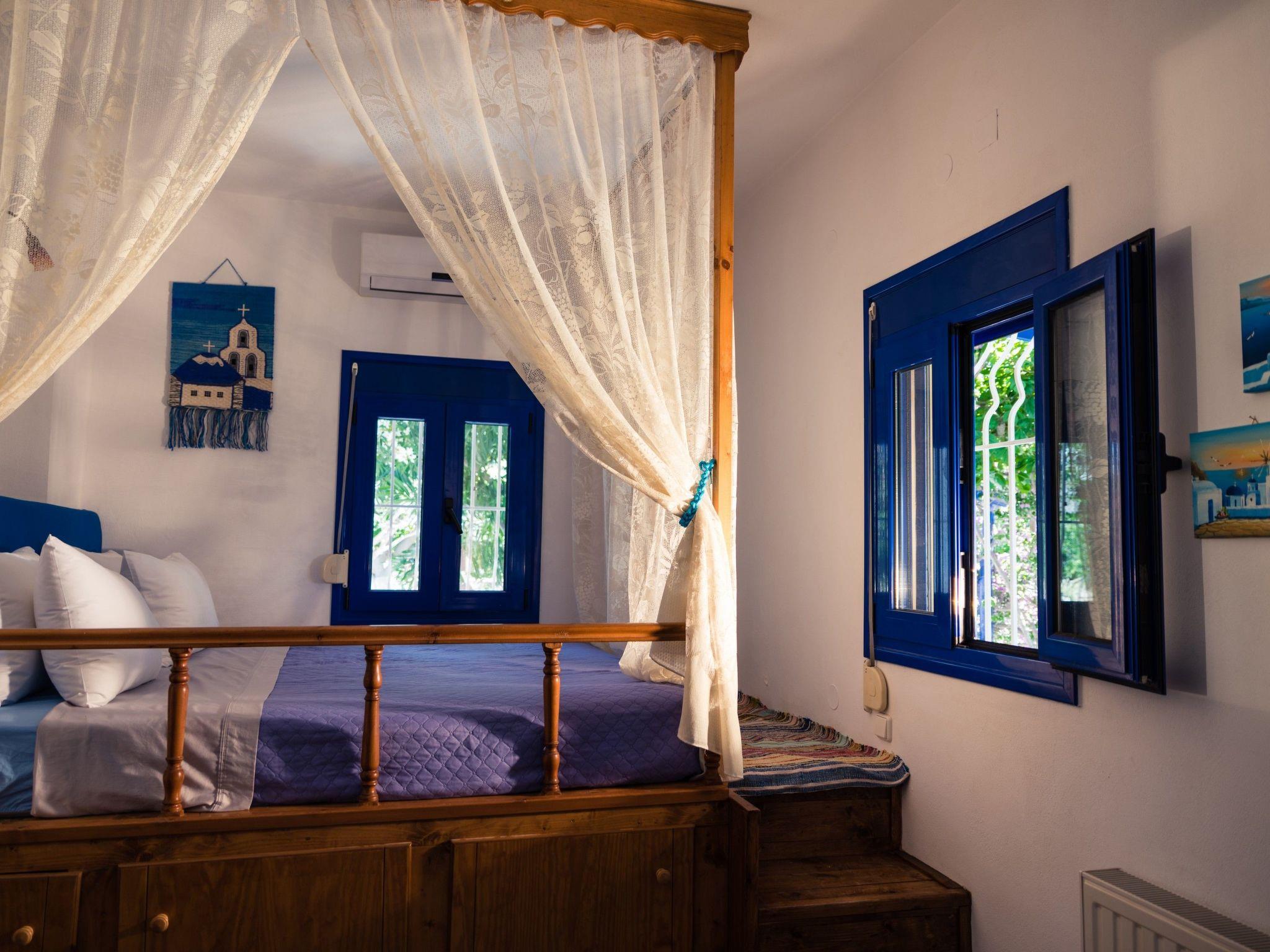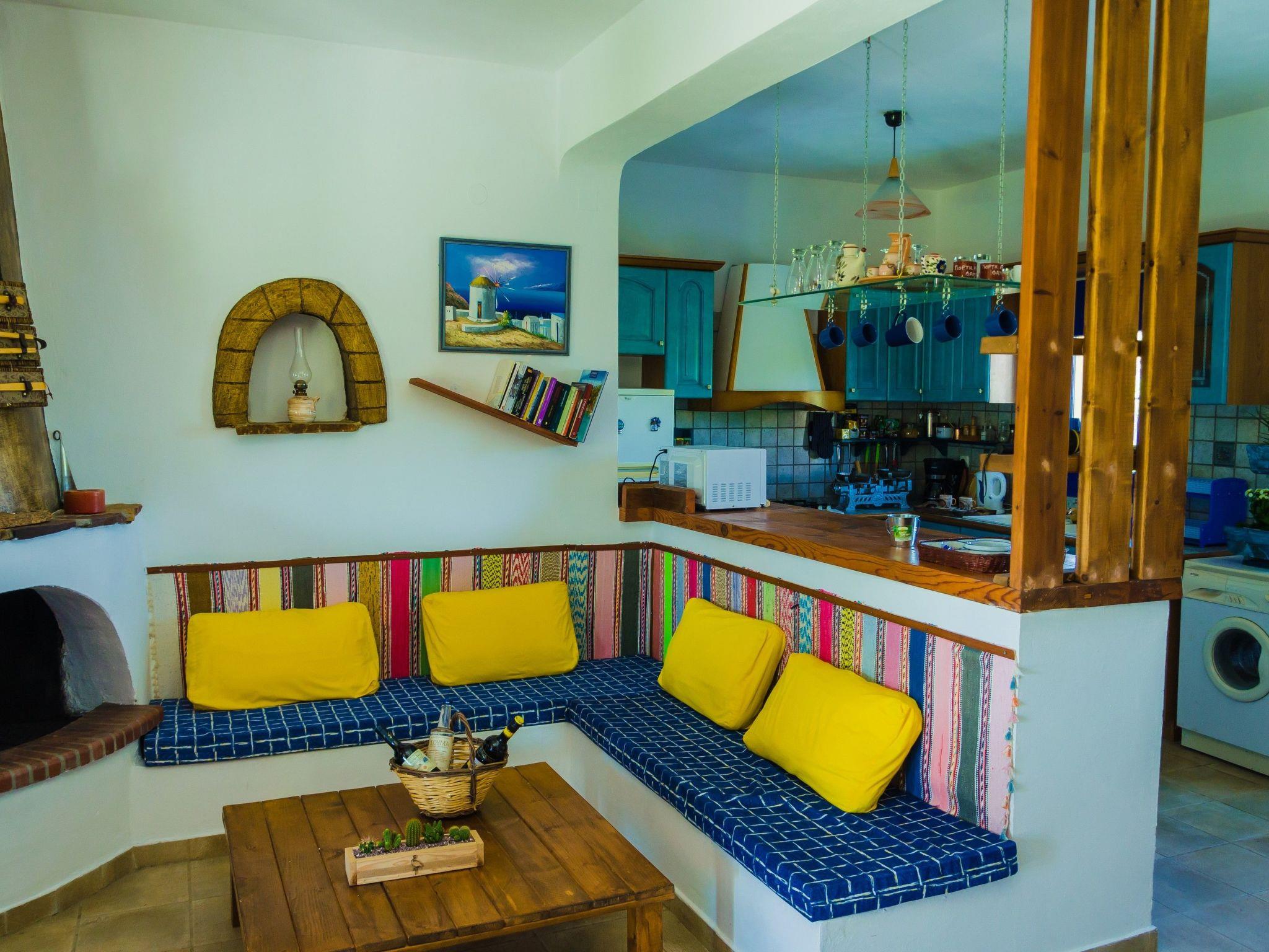 The interior of Villa Marqua includes two enchanting bedrooms fashioned in the customary island style with traditional handmade king size beds offering their occupants the tranquility and rest they need on their vacation. An open-plan room includes a spacious lounge area with fireplace, stereo sound system and flat screen television for countless moments of relaxation, as well as a fully equipped country style kitchen where our guests are invited to try out their culinary skills. A cozy rustic dining area is located in the same space.