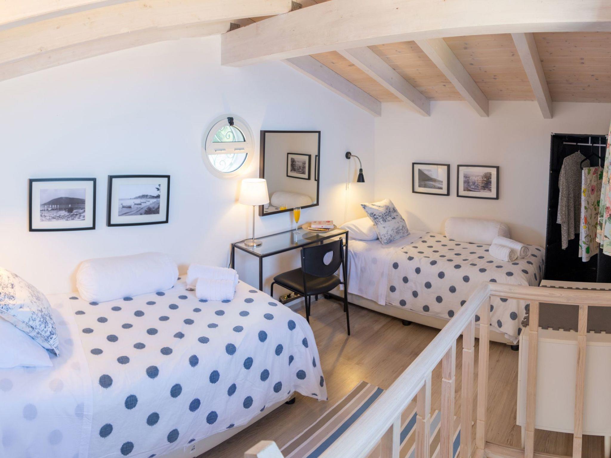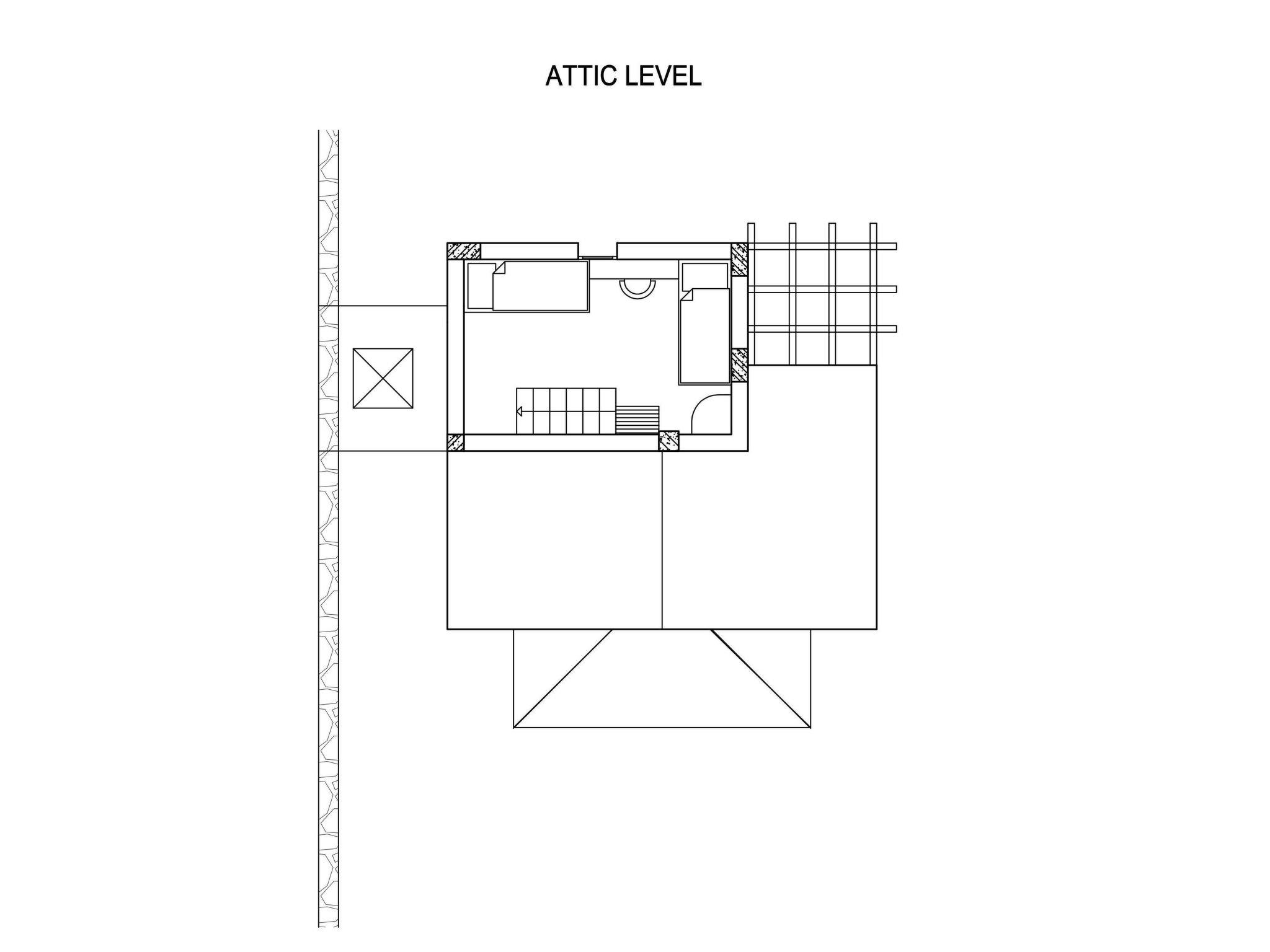 The villa counts approx. 100 m² split in two main levels and an attic, with 2 bedrooms, 2 bathrooms & 1 w.c with a shower, plus the attic as a third bedroom. Entering the villa the main entrance level has an open plan living/dining/kitchen area. The living area has a fire-place and French windows that open onto a wide canopy balcony to the sea views. The dining area has French windows open onto the large swimming pool terrace. Next to the kitchen are the stairs leading up to the attic and down to the bedrooms .There is also one bathroom with shower in common use for this floor and the attic. Staircase leads down to one double bedroom, with en-suite spacious bathroom, leading to big open terrace and one twin bedded room, leading to the same open terrace, next to another bathroom with shower. From the main level, an open staircase leads up to the attic ,as a third bedroom with two single beds.