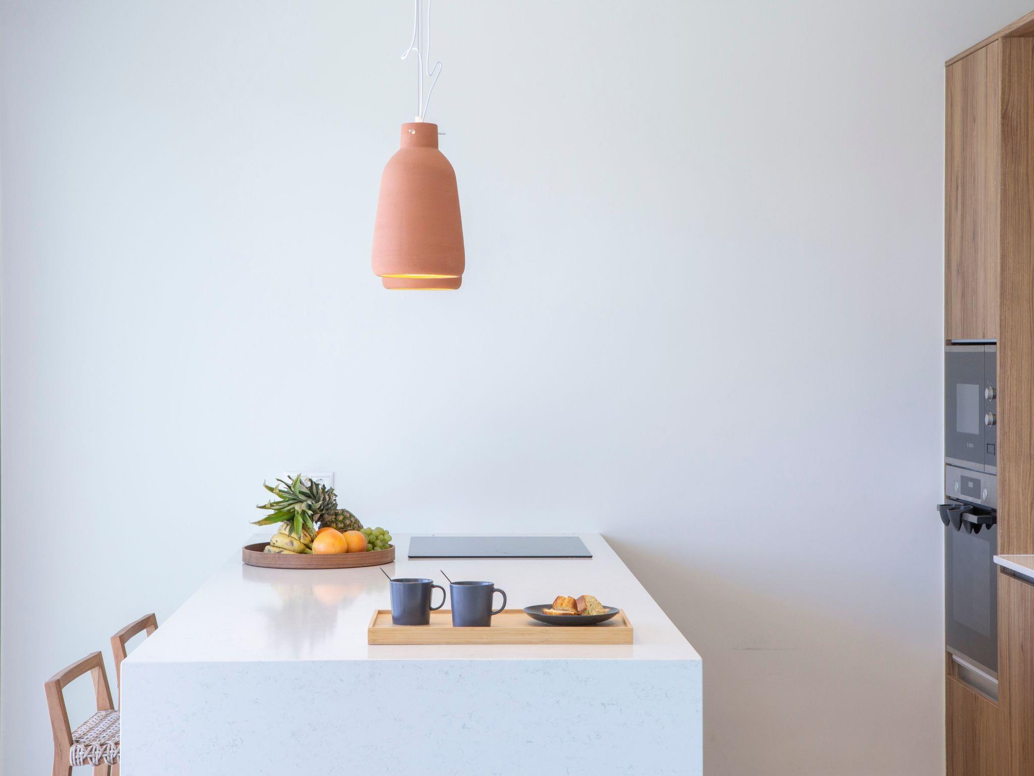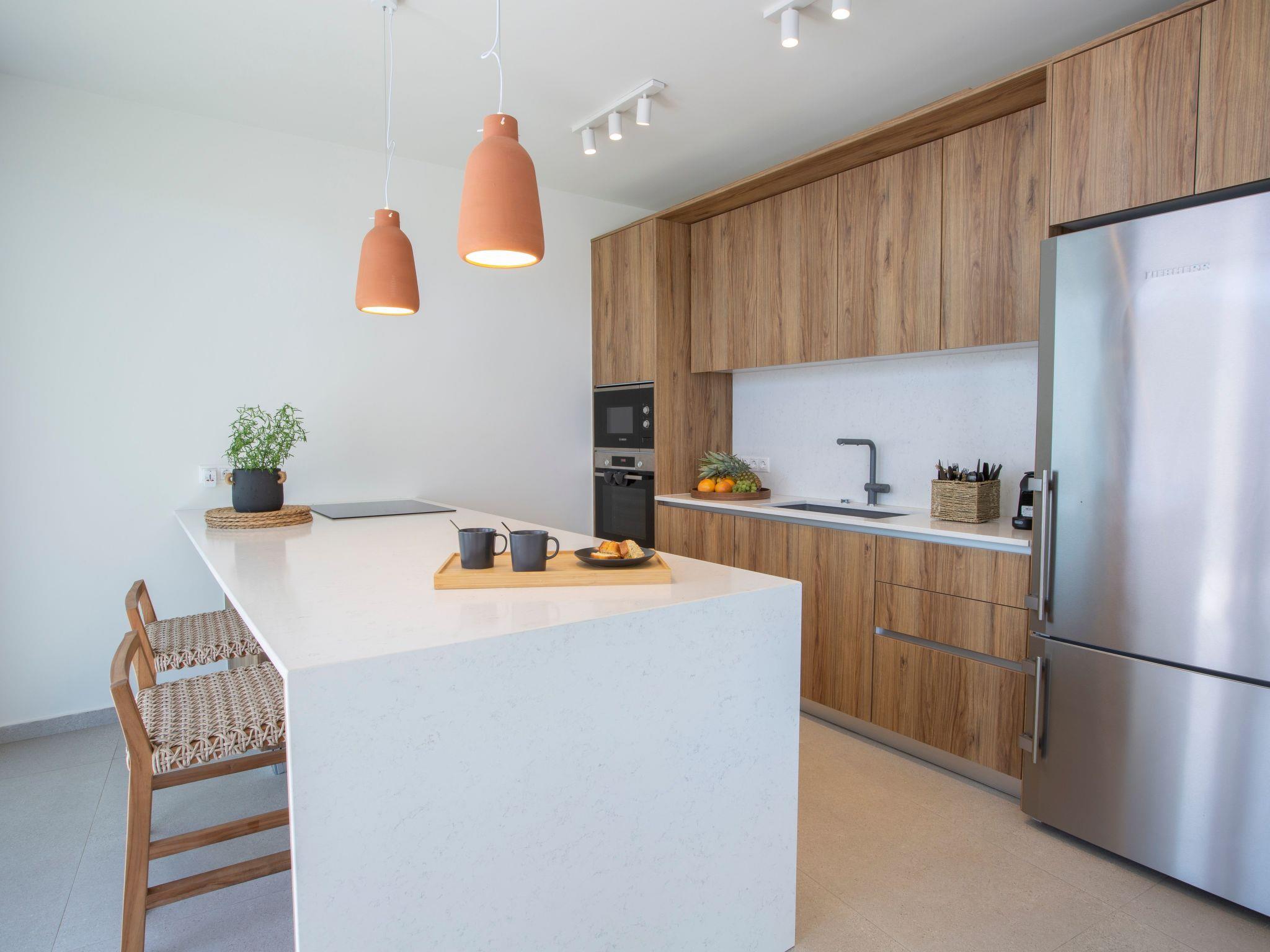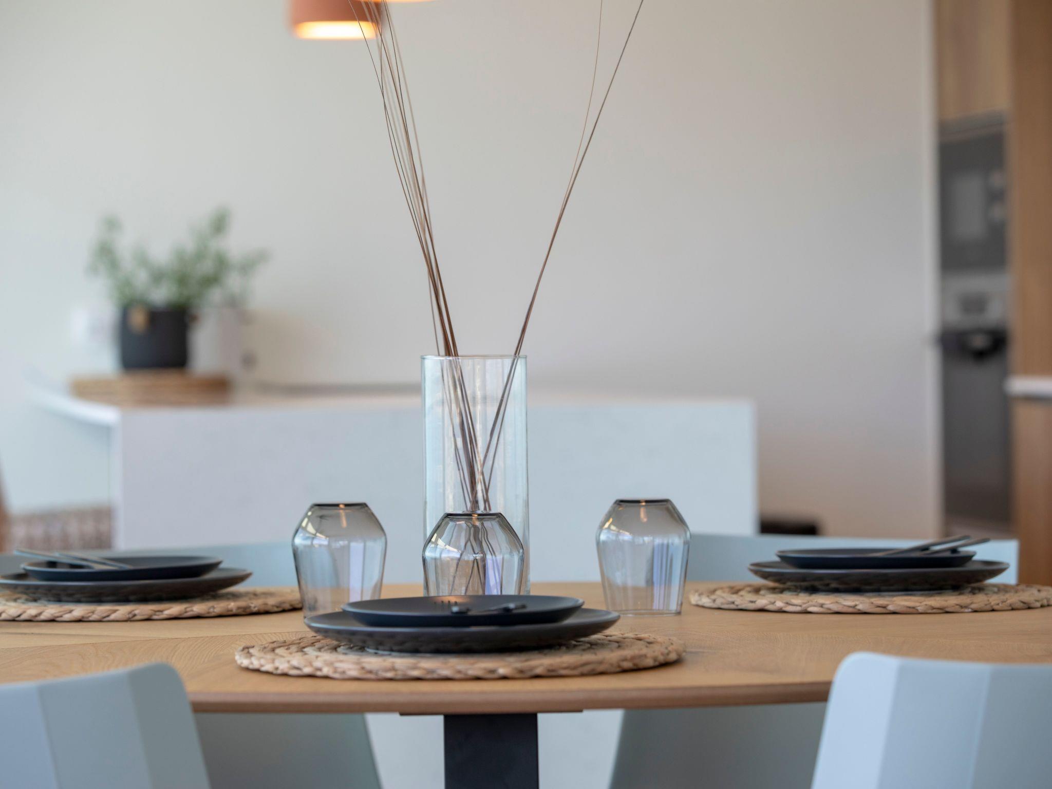 The fully equipped kitchen includes high-end appliances such as a refrigerator, oven, stove, microwave, and dishwasher. A stylish dining area with a large table invites guests to enjoy meals together in comfort.