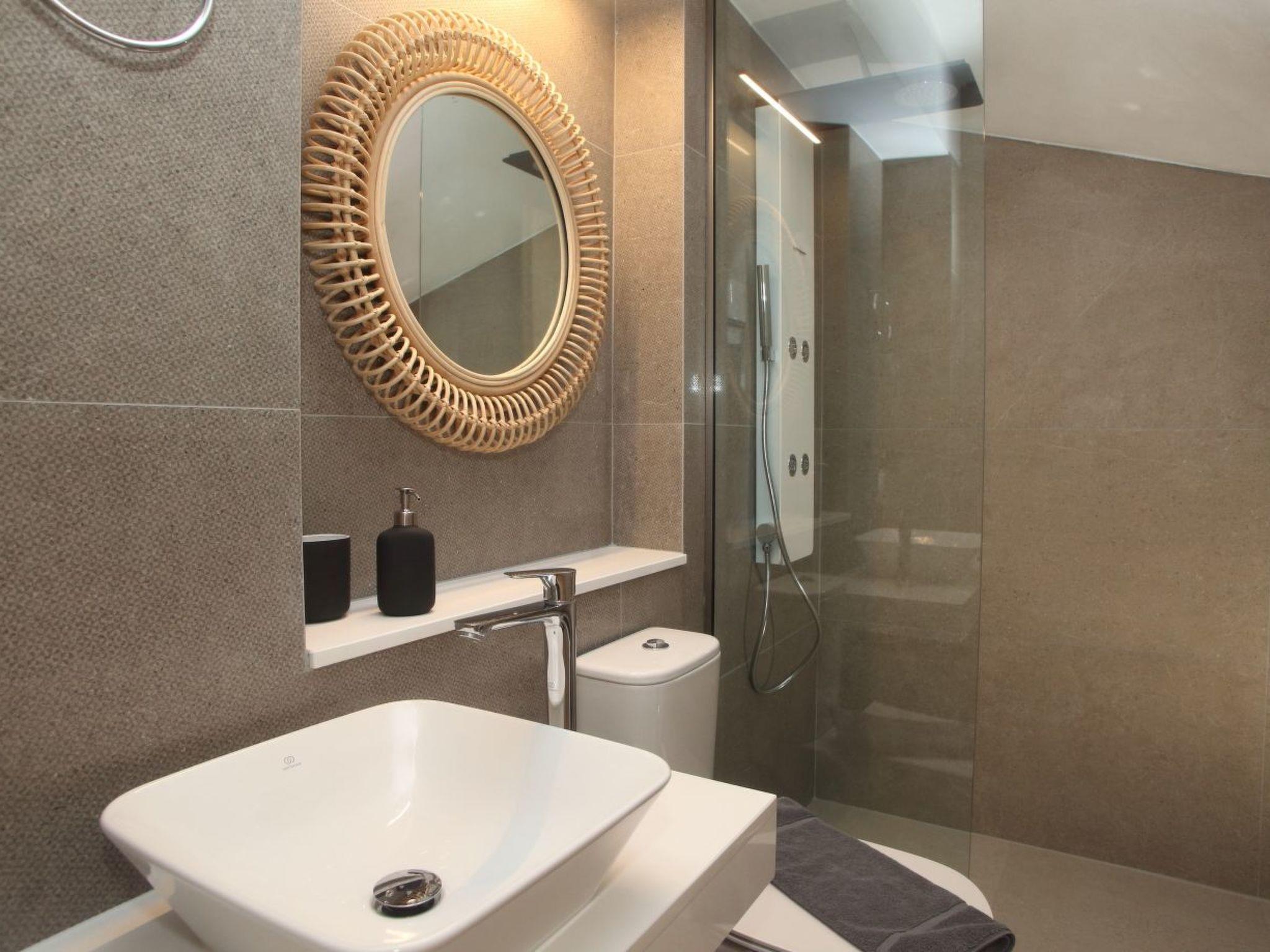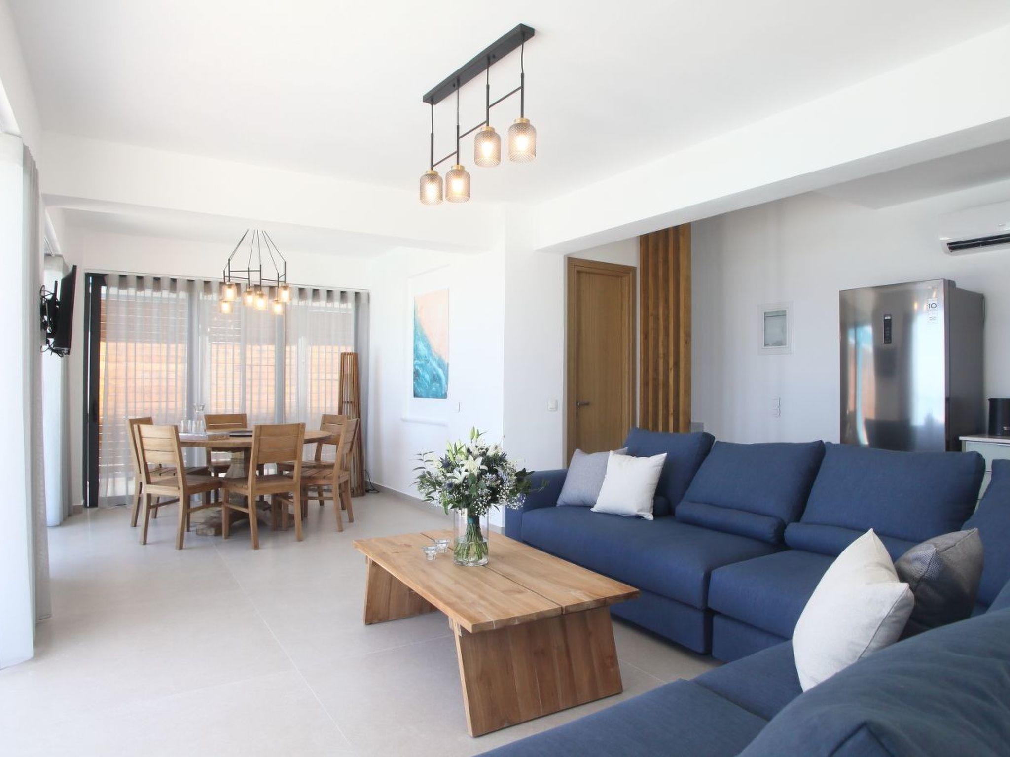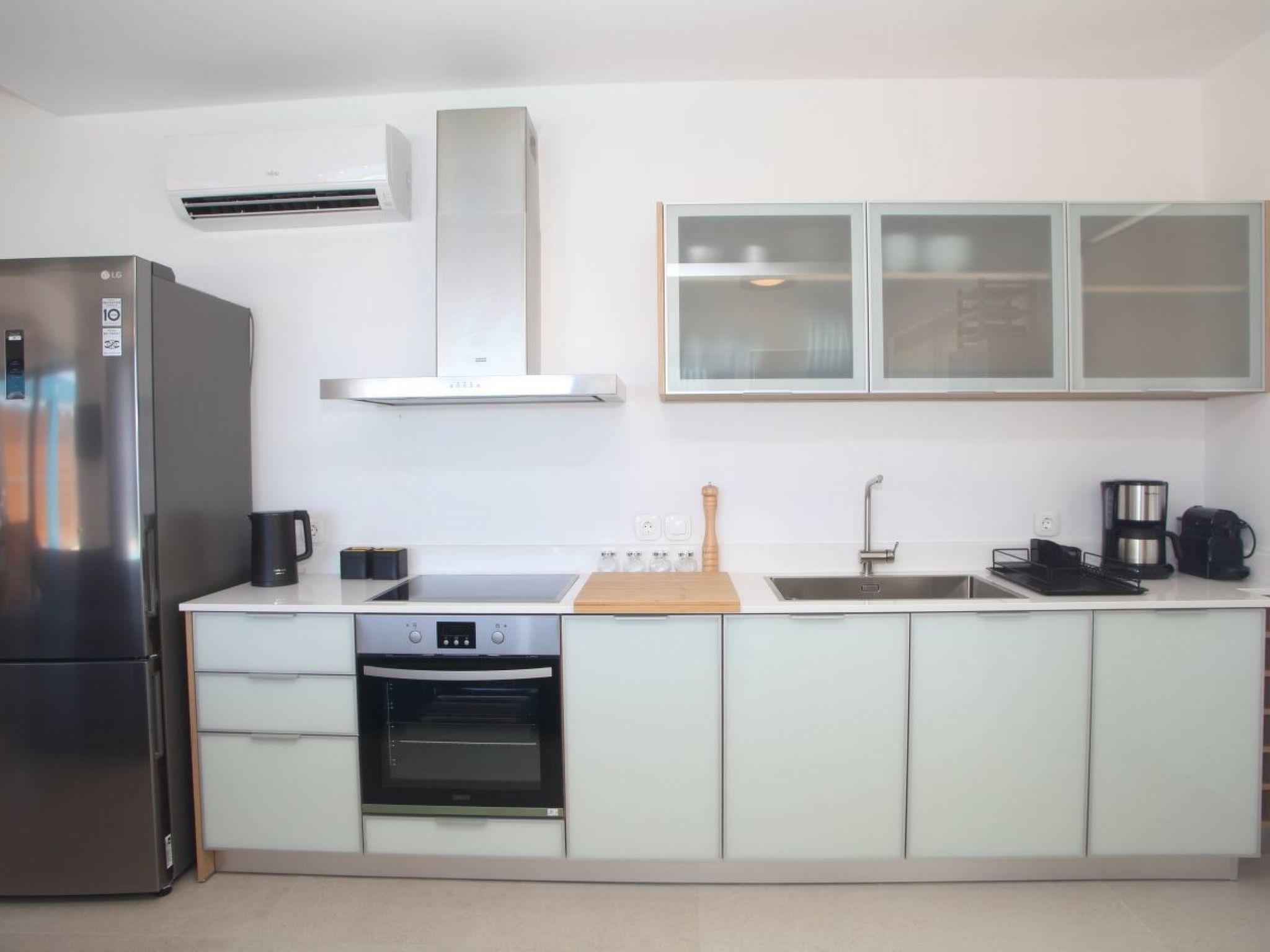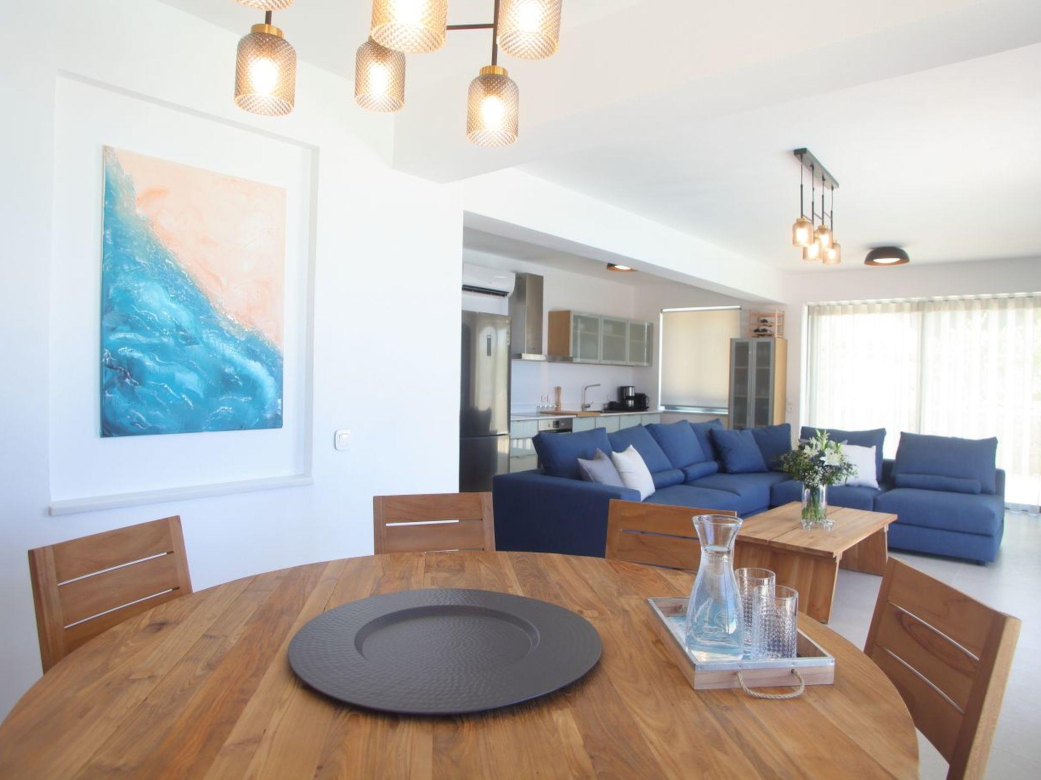 With is contemporary interior and highly practical and generously proportioned exterior space ,this villa is aesthetically pleasing to the eye from whatever angle you favor your holiday choice from. It has been carefully designed as a spacious and comfortable holiday home leaving guests feeling refreshed by its bright and airy design. The first thing you notice when you enter this fantastic home is the spacious living room decorated with high quality furniture and large glass windows around that allow you to enjoy the infinite blue of the sea and the beauty of the Greek sky. Also on the ground floor there is a modern kitchen which leads directly off the dining area and is fully equipped with everything a comfortable home needs.