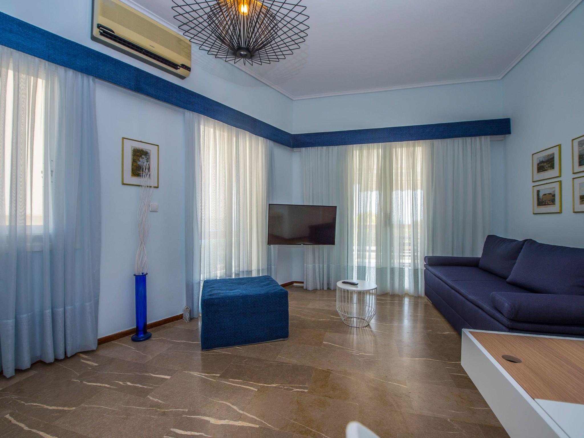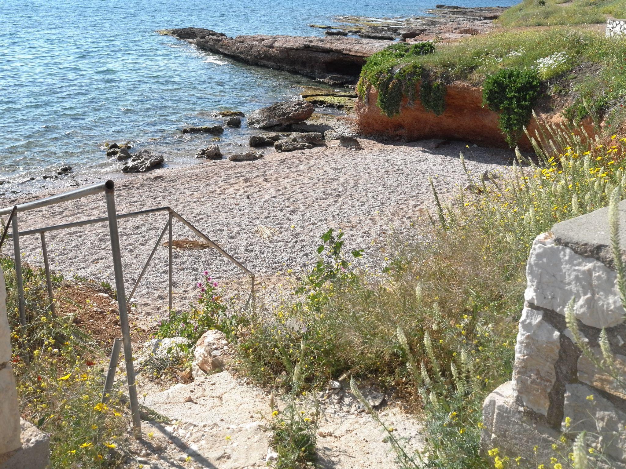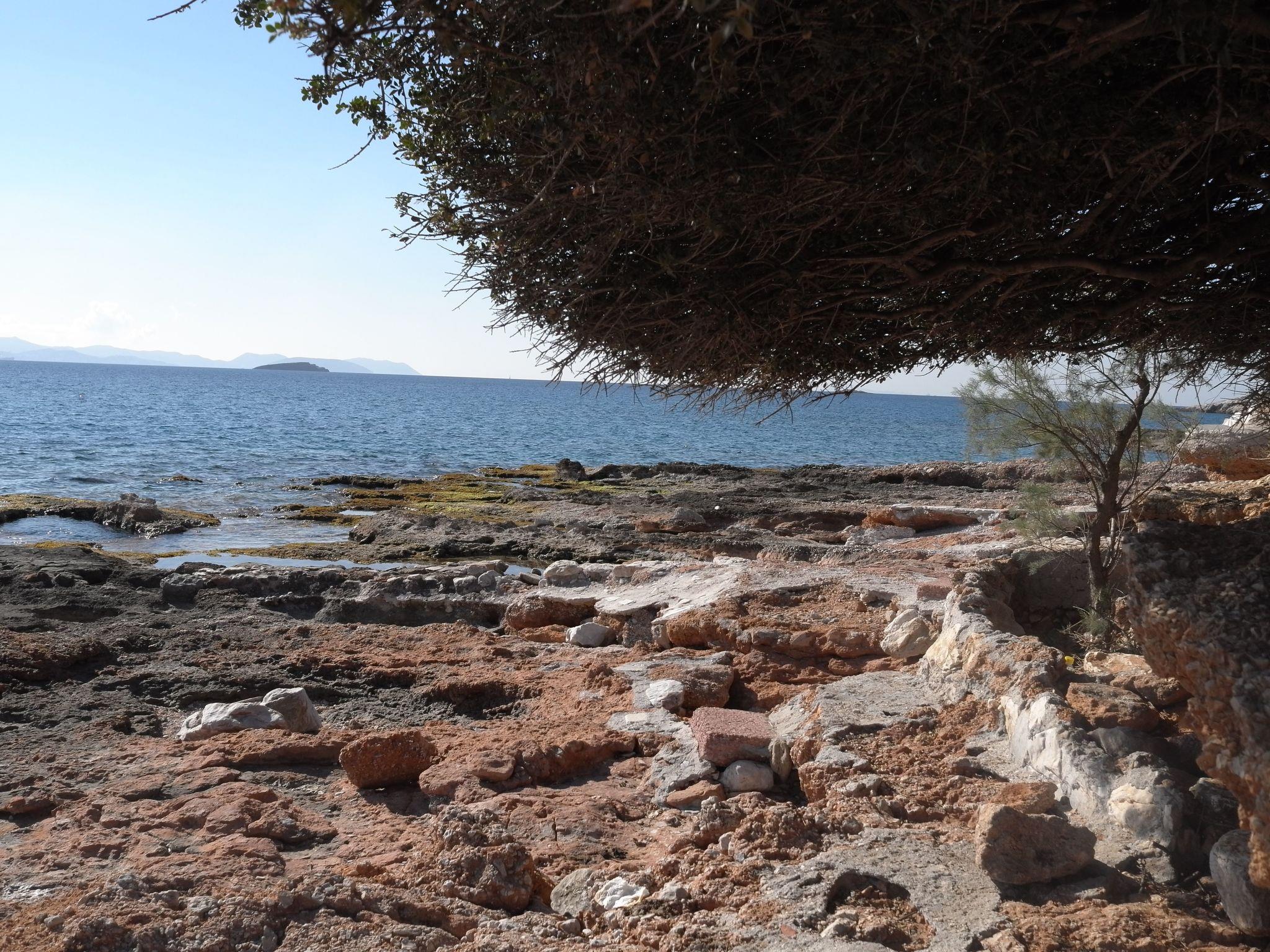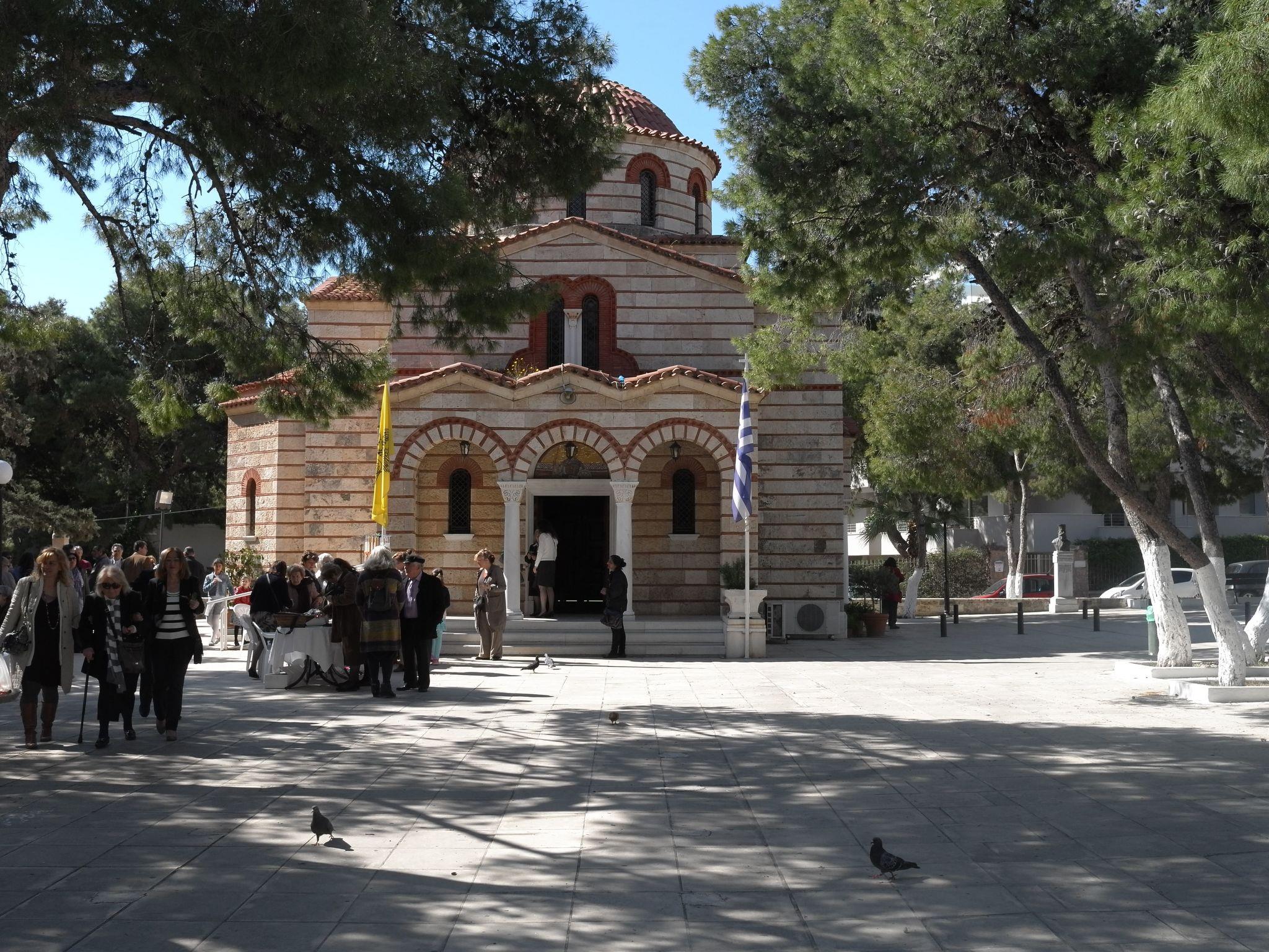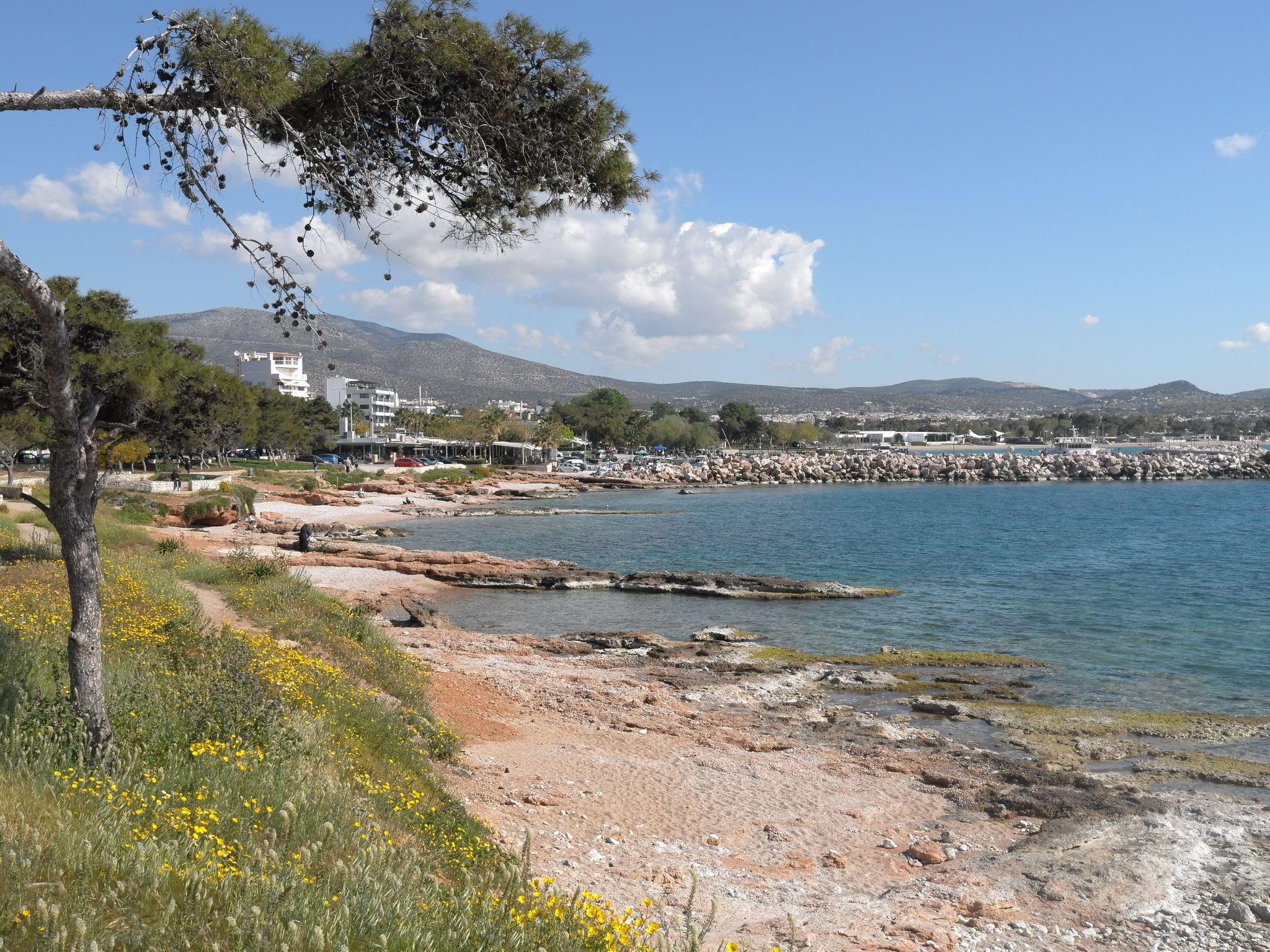 The apartment house is situated on the edge of a park, with the church Naos Kimiseos Theotokou in the middle. The house is 90 metres from the sea and accessed along Poseidonos Avenue. The apartment is on the 3rd (top) floor of the house and faces south-east. It is accessed up stairs or by lift.