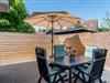 Ihre eigene private Terrasse hinter dem Haus ist ein herrlicher Ort zum Genießen. Diese ist mit einer vierteiligen Gartengarnitur mit Kissen und einem Sonnenschirm für heiße Tage ausgestattet. Sie können hier auch Ihre Fahrräder abstellen.