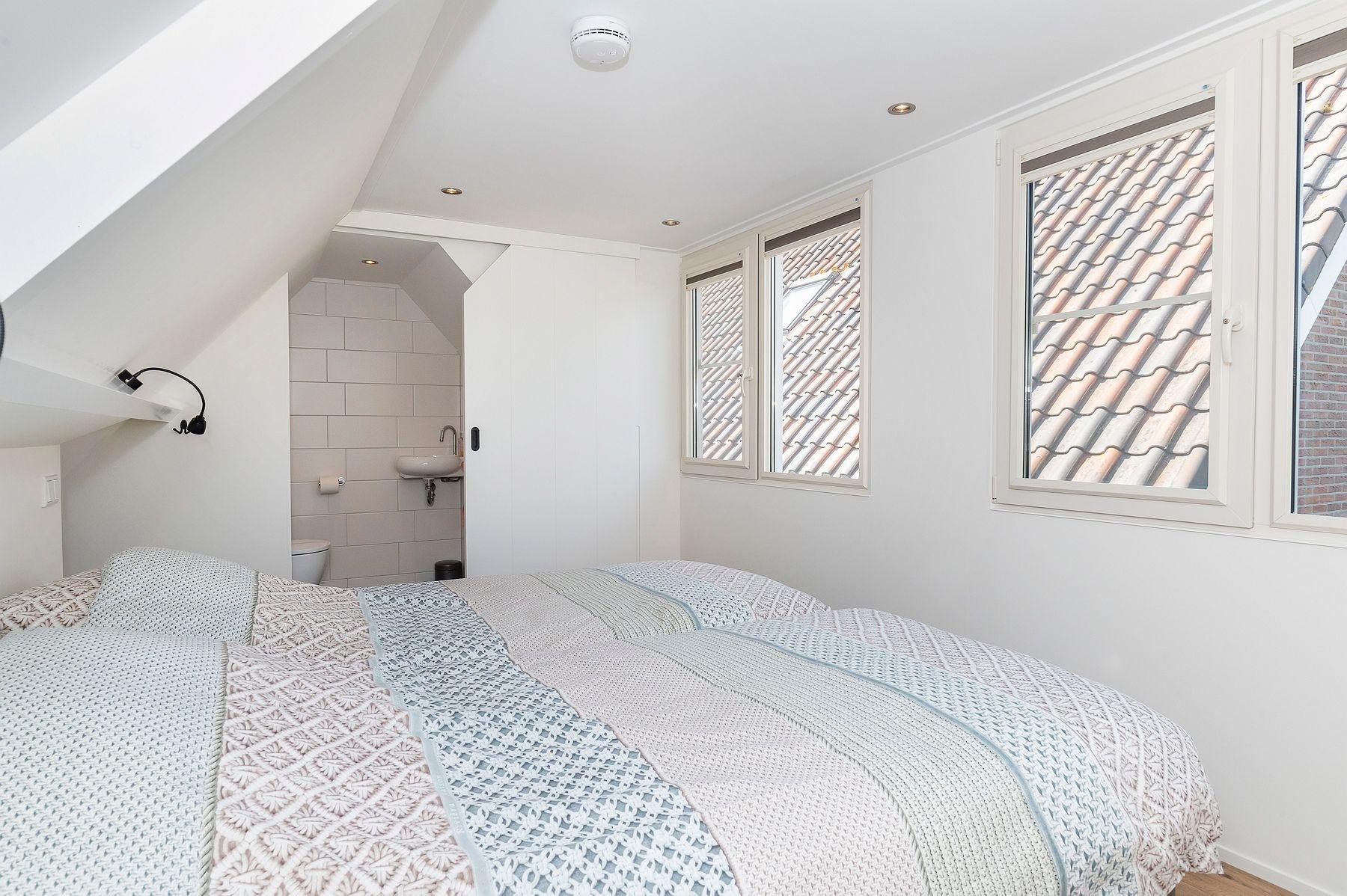 Das Schlafzimmer mit Klimaanlage hat 2 schöne 90 x 200 cm Boxspringbetten und bei Ihrer Ankunft ist Ihr Bett gemacht. Unter der Schräge gibt es Platz für Ihre Tasche oder Ihren Koffer. Für Ihre Kleidung gibt es einen offenen Kleiderschrank mit Hänge- und Liegefläche. Am Kopfende des Bettes befinden sich Steckdosen und Leselampen. Das Zimmer hat Verdunklungsvorhänge und Insektenschutzgitter vor den Fenstertüren. Eine Schiebetür führt in die angrenzende Toilette.