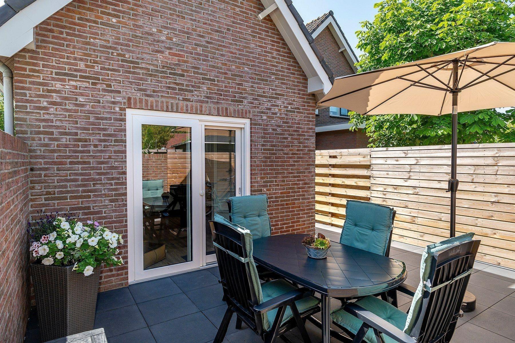 Vom Wohnzimmer aus führt eine Schiebetür mit Moskitonetz auf Ihre eigene private Terrasse mit Sonnenschirm und Gartenmöbeln. Diese Terrasse ist auch über das Gartentor an der Vorderseite zugänglich. Sie haben einen eigenen freien Hintereingang.
