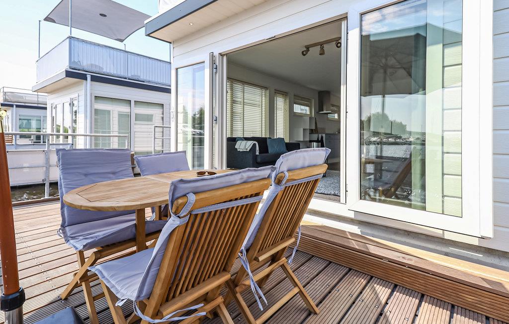 På dejlige dage vil I sandsynligvis tilbringe en masse tid udendørs, og I kan vælge mellem to terrasser. Den mindre terrasse i stueetagen er perfekt til morgenmad og frokost. På det store øverste dæk kan I nyde solen og den uafbrudte udsigt over Westeinderplassen og lystbådehavnen. Denne terrasse med lounge møbler kan nås via en trappe foran huset.
