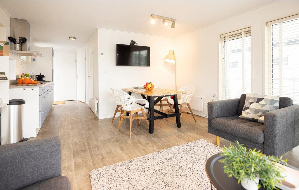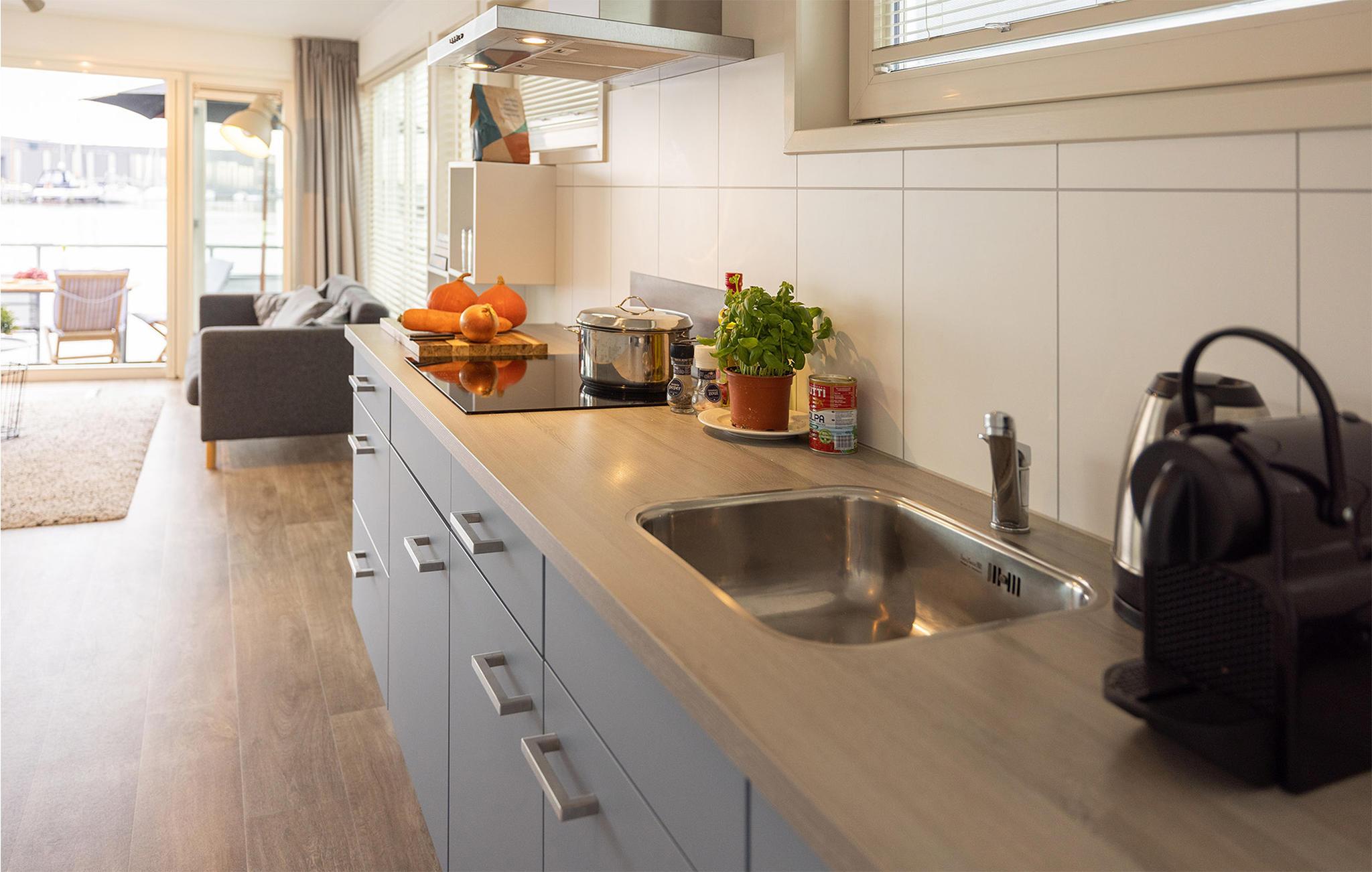 Det åbne køkken er fuldt udstyret. En kaffemaskine og fire kogeplader sikrer, at du nemt kan tilberede et lækkert måltid til familie eller venner. Badeværelset har toilet, bruser og håndvask.