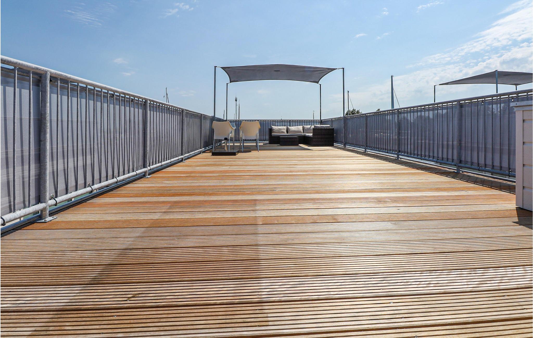 Stuen er moderne møbleret og har store vinduer, så der kommer meget lys ind. Fra stuen kigger du ud over vandet fra alle sider mod Westeinderplassen eller havnen. Hvis du står på den store tagterrasse, der er i samme størrelse som selve huset, har du en smuk udsigt over omgivelserne. I stueetagen er der en mindre terrasse ideel til morgenmad eller frokost i solen.