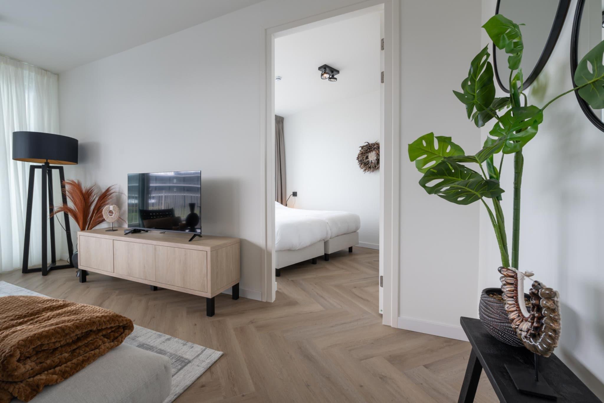 Luksus og komfort er i højsædet ved Veerse Wende-lejlighederne. Den unikke beliggenhed ved Veerse Meer, den private lystbådehavn og disse lejligheders eksklusivitet gør dette sted til den perfekte base for en ferie i Zeeland. Læg dertil den betagende udsigt, og du vil aldrig hjem igen! Denne lejlighed er udstyret til 6 personer og ligger på anden sal i komplekset. Entréen giver adgang til to rummelige soveværelser og et luksuriøst badeværelse. Soveværelserne er hver udstyret med en dobbeltseng. Det store soveværelse har eget badeværelse med håndvask og bruseniche. Det store luksuriøse badeværelse er udstyret med walk-in regnbruser og håndvask. I hallen er der separat gæstetoilet. Den lyse og smagfuldt indrettede stue har et behageligt opholdsområde og et Smart TV med udenlandsk pakke. Fra stuen har du udgang til den rummelige altan, hvor du kan nyde en betagende udsigt over det store Veerse Meer hele dagen lang. Bådene sejler forbi her til de tidlige timer, mens du nyder et glas vin. Du kan også nå et tredje soveværelse med dobbeltseng fra stuen. Det rummelige, luksuriøse køkken er udstyret med indbyggede hårde hvidevarer såsom opvaskemaskine, kombiovn, induktionskomfur og køleskab med fryser. Der er en Nespresso kaffemaskine til den rigtige kaffeelsker. Ved det attraktive spisebord kan du nyde lange aftener med spisning med hele din gruppe. I depotrummet har du adgang til vaskemaskine og tørretumbler. Dit kæledyr er meget velkommen i denne lejlighed! Lejligheden har en privat parkeringsplads. Der er også en privat fortøjning i marinaen, så du til enhver tid kan fortøje din båd ved din lejlighed og sejle ind på Veerse Meer for en dagstur til Middelburg eller maleriske Veere. Billederne giver et indtryk af, hvilken type bolig du booker. Vi vil tildele en bolig baseret på tilgængelighed.
