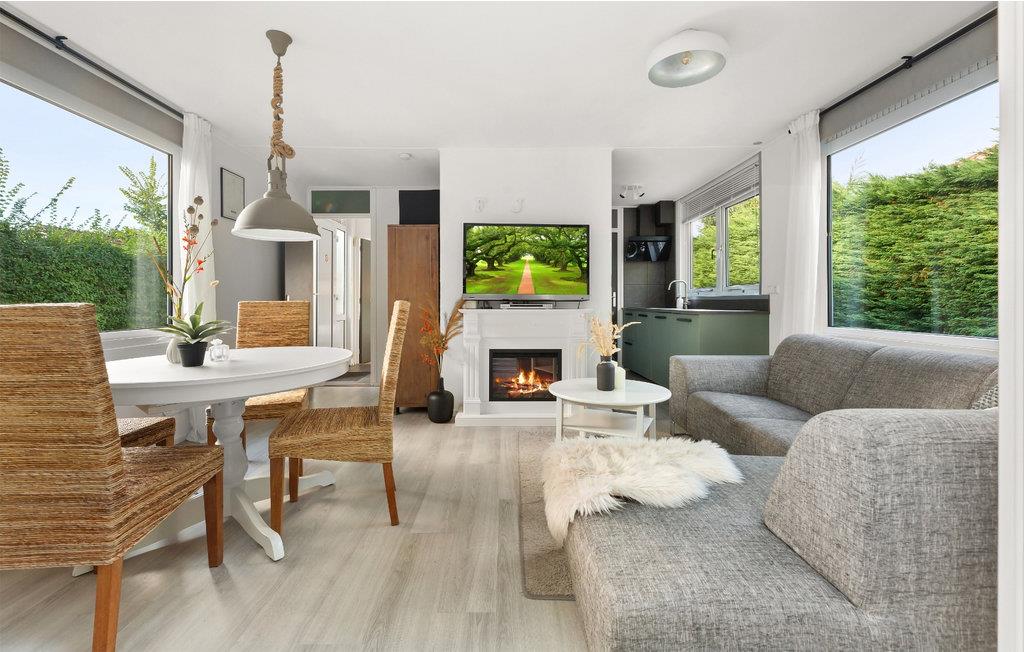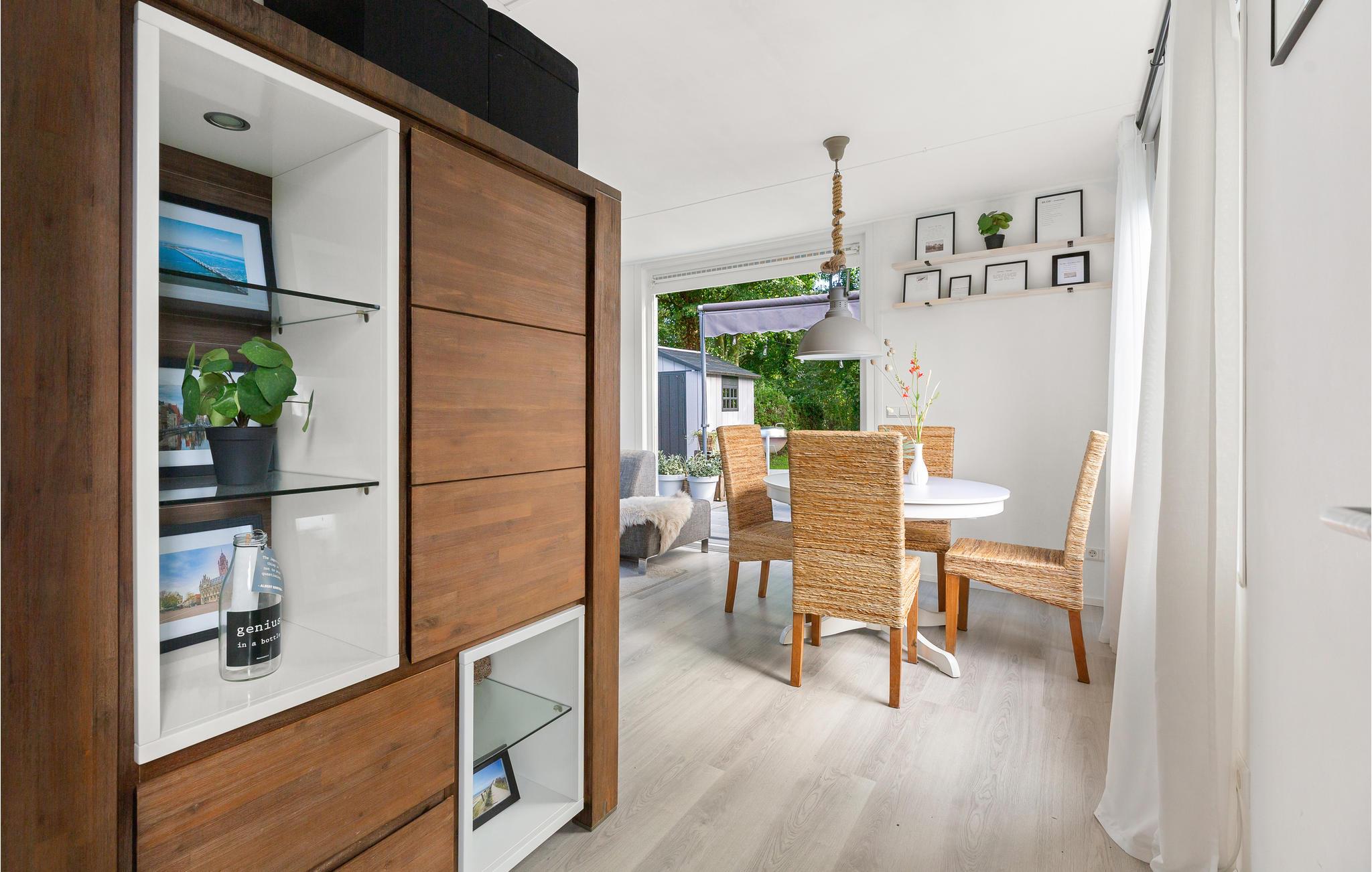 Hele feriehuset er nænsomt indrettet, alle værelser ligger i stueetagen. Stuen er indrettet med hjørnesofa, spisebord og stort fladskærms-tv uden kanaler, som I streame programmer på via jeres telefoner. Det fuldt udstyrede køkken har køleskab, fryser, opvaskemaskine og miniovn. Udover dobbeltsengen i skurvognen har feriehuset to soveværelser, et soveværelse med dobbeltseng og et soveværelse med køjeseng.