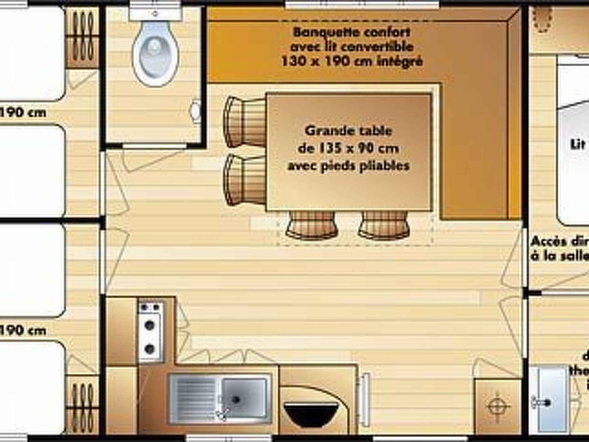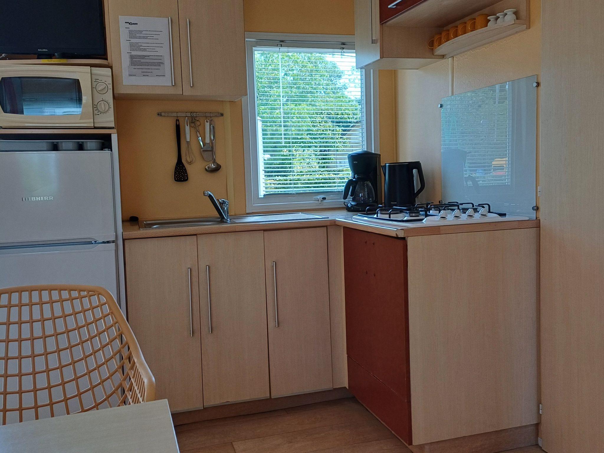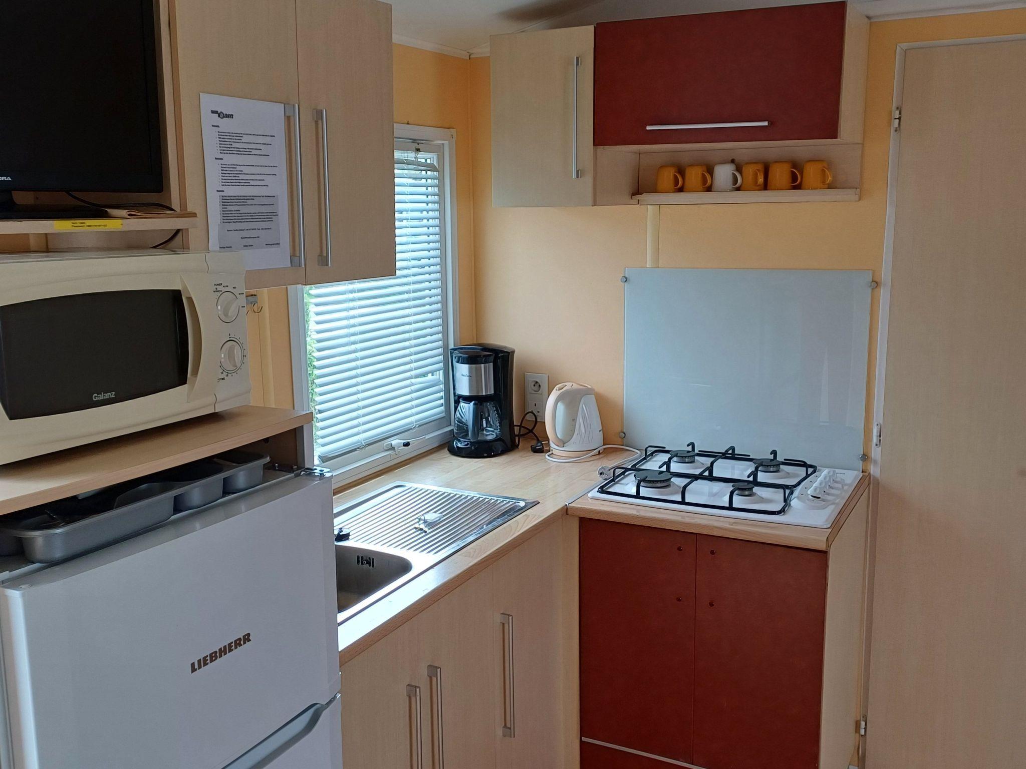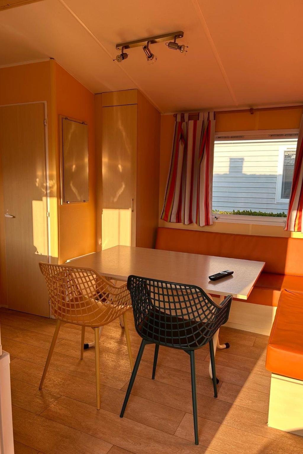 The IRM Budget mobile home is a comfortable accommodation suitable for up to 6 people. With 3 bedrooms—one with a double bed and two with single beds—it offers space and comfort for everyone. The living room cannot be converted into an additional sleeping area. The bathroom is equipped with a shower cabin and a washbasin and a separate toilet is also available. The kitchen is fully equipped and includes a refrigerator with freezer compartment and a microwave, allowing you to enjoy your meals just like at home. There is no oven in the accommodation. There is no coffee pad machine available, only a filter coffee machine. Duvets, pillows and even a high chair are included as standard.