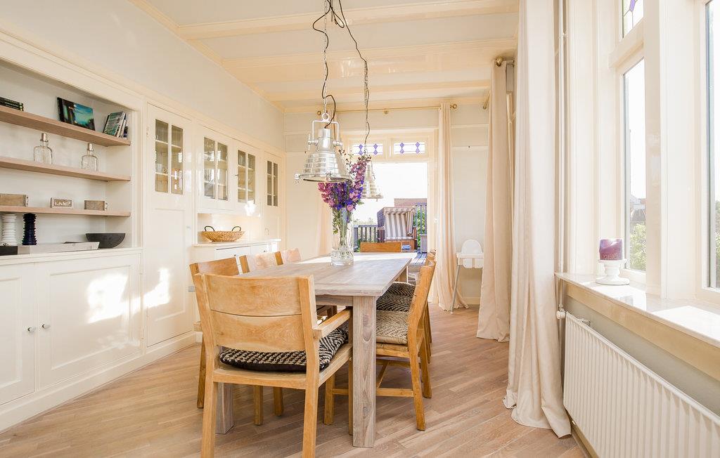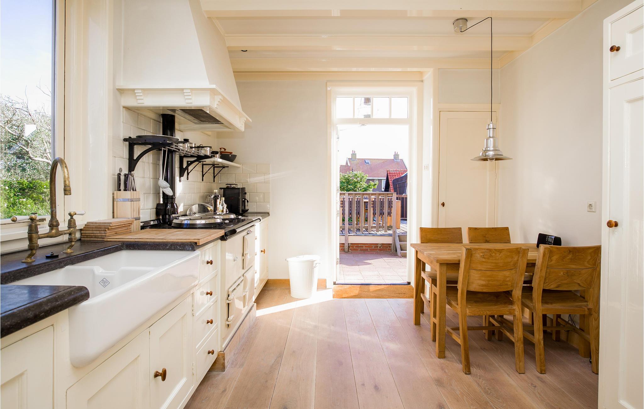 Det rummelige køkken består af et separat køkkenbord med siddepladser, gode faciliteter og gammelt hollandsk design. I stueetagen er der dobbelt entré og et gæstetoilet. På første sal finder I tre soveværelser, hver med dobbeltsenge og brede madrasser (180x200) samt enkeltdyner. 1 værelse har en vask.