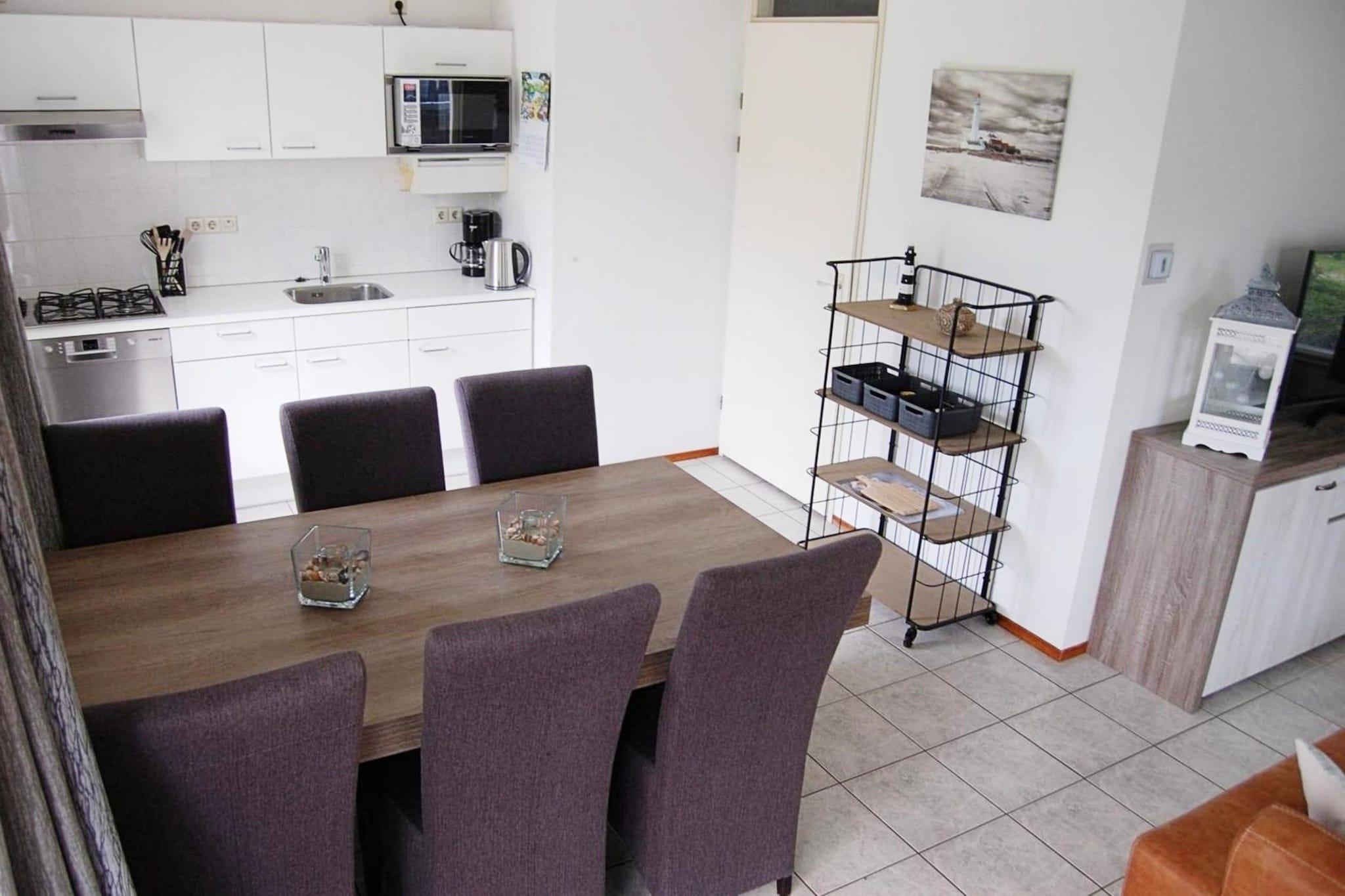 Velkommen til et charmerende fritliggende feriehus beliggende i den fredelige Strandpark Schoneveld, perfekt til op til 6 gæster. Dette fuldt møblerede, røgfri oase tilbyder komfort, moderne bekvemmeligheder og er energineutralt takket være solpaneler - hvilket gør det både hyggeligt og miljøvenligt. Den indbydende stue, der er udstyret med et Smart TV, forbindes problemfrit med et åbent køkken med alt det nødvendige for et afslappende ophold, inklusive en opvaskemaskine, køleskab med fryser, mikroovn, 4-brænder komfur med emhætte, elkedel, filterkaffemaskine og Senseo-maskine. Skydedøre åbner til en solrig, sydvendt terrasse med fast overdækning, der fører til en rummelig, indhegnet have - ideel til kæledyr og udendørs spisning eller afslapning. Stueetagen indeholder et soveværelse med to enkeltsenge, et separat toilet og direkte adgang til haven. Ovenpå finder du det store soveværelse med en dobbelt boxmadras og barneseng, plus endnu et soveværelse med to enkeltsenge. Badeværelset har en termostatisk badehane og et ekstra toilet. Familier vil sætte pris på KinderPlusPakket, som har en tremmeseng, trappelåge, babybadekar, kravlegård, høj stol, børnesikre stikkontakter og blødt lukkede toiletsæder. Yderligere højdepunkter omfatter gratis Wi-Fi, parkering ved siden af, en spillekonsol, et Hi-Fi-sæt, CD-afspiller og udendørs opbevaring med liggestole, parasol og havemøbler. Med stranden kun 800 meter væk og et supermarked inden for 1 km, tilbyder dette hjem en perfekt blanding af komfort, privatliv og bekvemmelighed til din kystferie.