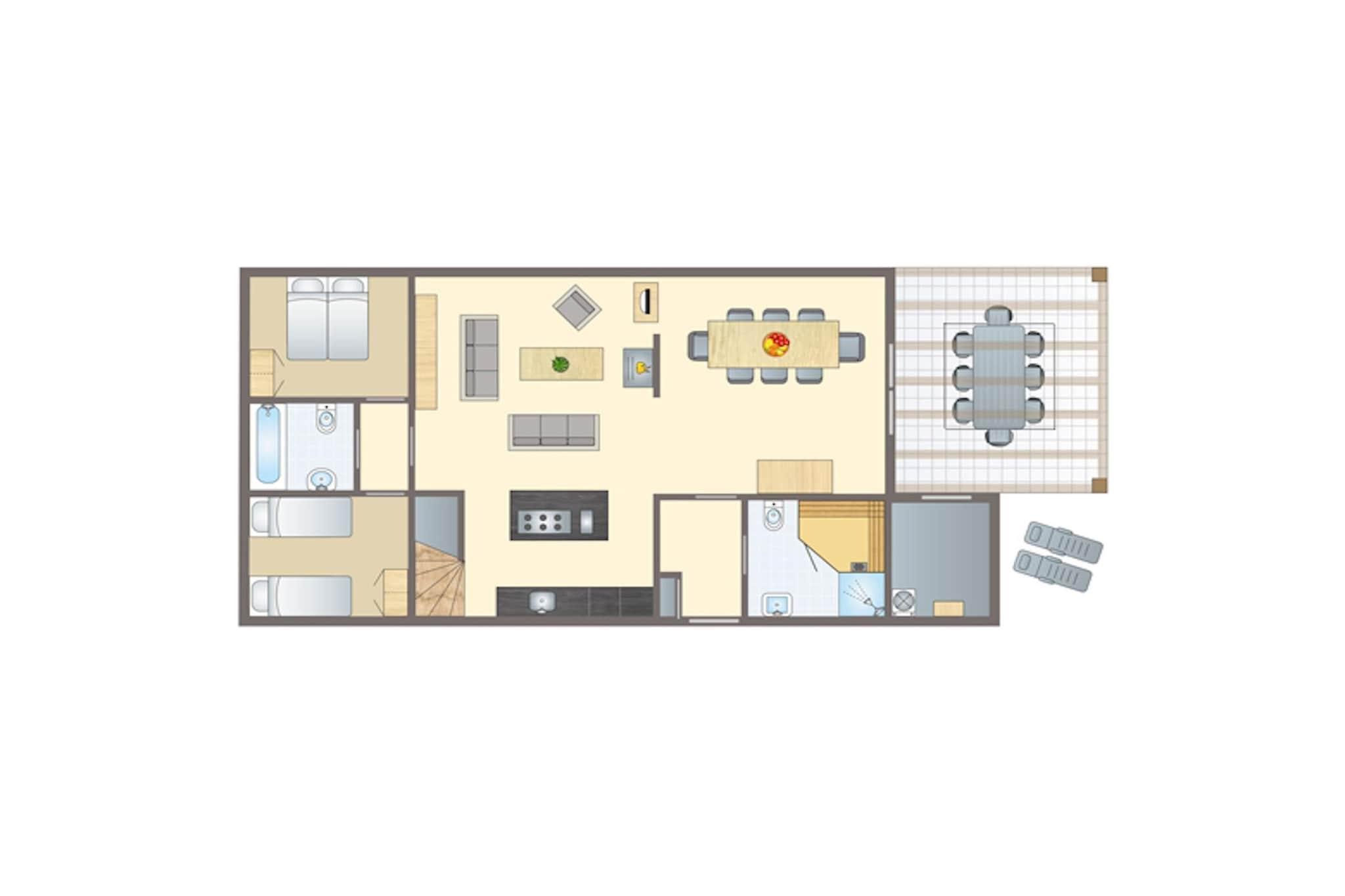 Stueetage: (entre, Stue(Fjernsyn, radio, hyggespil, Chromecast), åbent køkken(elkedel, brødrister, komfur(elektrisk), kaffemaskine(kaffetragt, kaffepude), mikrobølgeovn, opvaskemaskine , køle-fryseskab), soveværelse(dobbeltseng eller 2 enkeltsenge Senge), soveværelse(enkeltseng, enkeltseng), badeværelse(badekar, håndvask, toilet), badeværelse(bruser med lysterapi, sauna, håndvask, toilet), pulterkammer(vaskemaskine)) På 1. etage: (soveværelse(enkeltseng, enkeltseng), soveværelse(enkeltseng, enkeltseng), Repos) terrasse, have, havemøbler, parkering, liggestole, swimmingpool(deles med andre gæster, overdækket), barneseng, barnestol