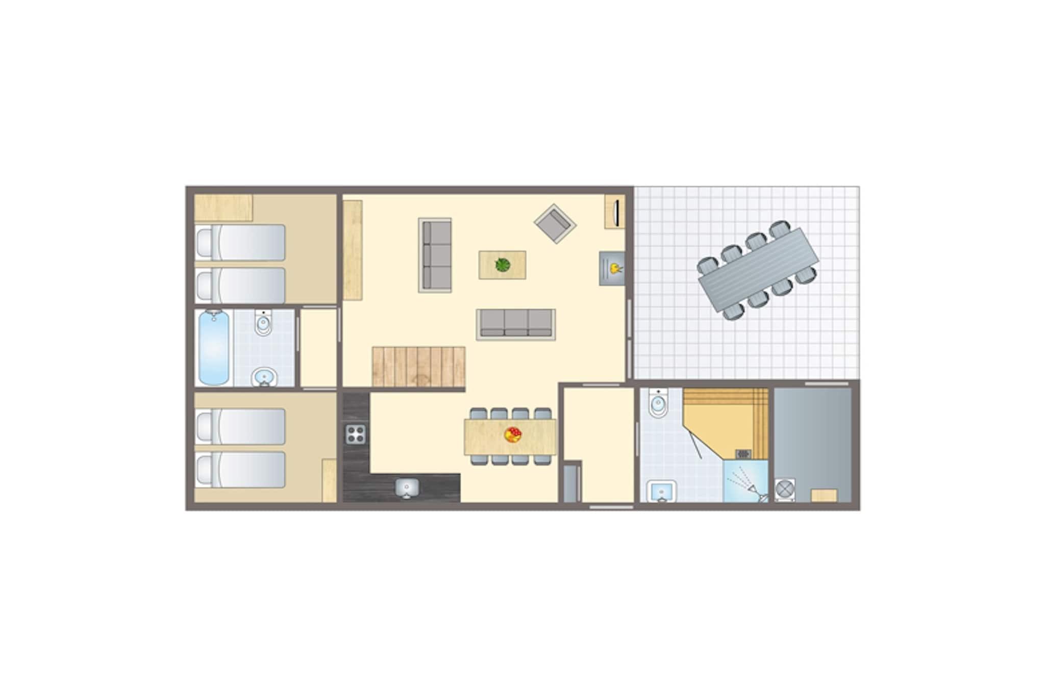 Dette fritliggende feriehus med sauna ligger i den rummelige feriepark Parc Port Greve. Ferieparken ligger ved den smukke Grevelingenmeer, i udkanten af byen Brouwershaven, ikke langt fra Brouwersdam. Feriehuset er komfortabelt, fuldt møbleret og strækker sig over to etager. I stueetagen finder I en stue med tv med Chromecast og en sjov spillekasse. Det åbne køkken har mikrobølgeovn og opvaskemaskine. Der er to soveværelser, hver med to enkeltsenge med boxmadras. I det ene soveværelse er sengene opstillet som en dobbeltseng. Der er også to badeværelser, det ene med badekar eller bruser og toilet, og det andet med bruser, toilet og en dejlig sauna. Her kan I slappe af og nyde jeres velfortjente ferie. Der er yderligere to soveværelser på første sal, hver med to enkeltsenge med boxmadras. Standardudstyret inkluderer et opbevaringsrum med vaskemaskine, trappegitre, en barneseng og en høj stol. Udenfor er der en have med terrasse med havemøbler. Der er parkeringsplads til to biler ved feriehuset. Der er også centrale parkeringspladser ved ferieparken. På ferieparken Parc Port Greve kan du reservere forskellige feriehuse, bungalows og lejligheder til fire til tolv personer. Bemærk venligst: Den indendørs pool vil være lukket fra mandag den 5. januar 2026 indtil videre varsel. Vi beklager eventuelle ulemper, dette måtte forårsage, og sætter pris på din forståelse.