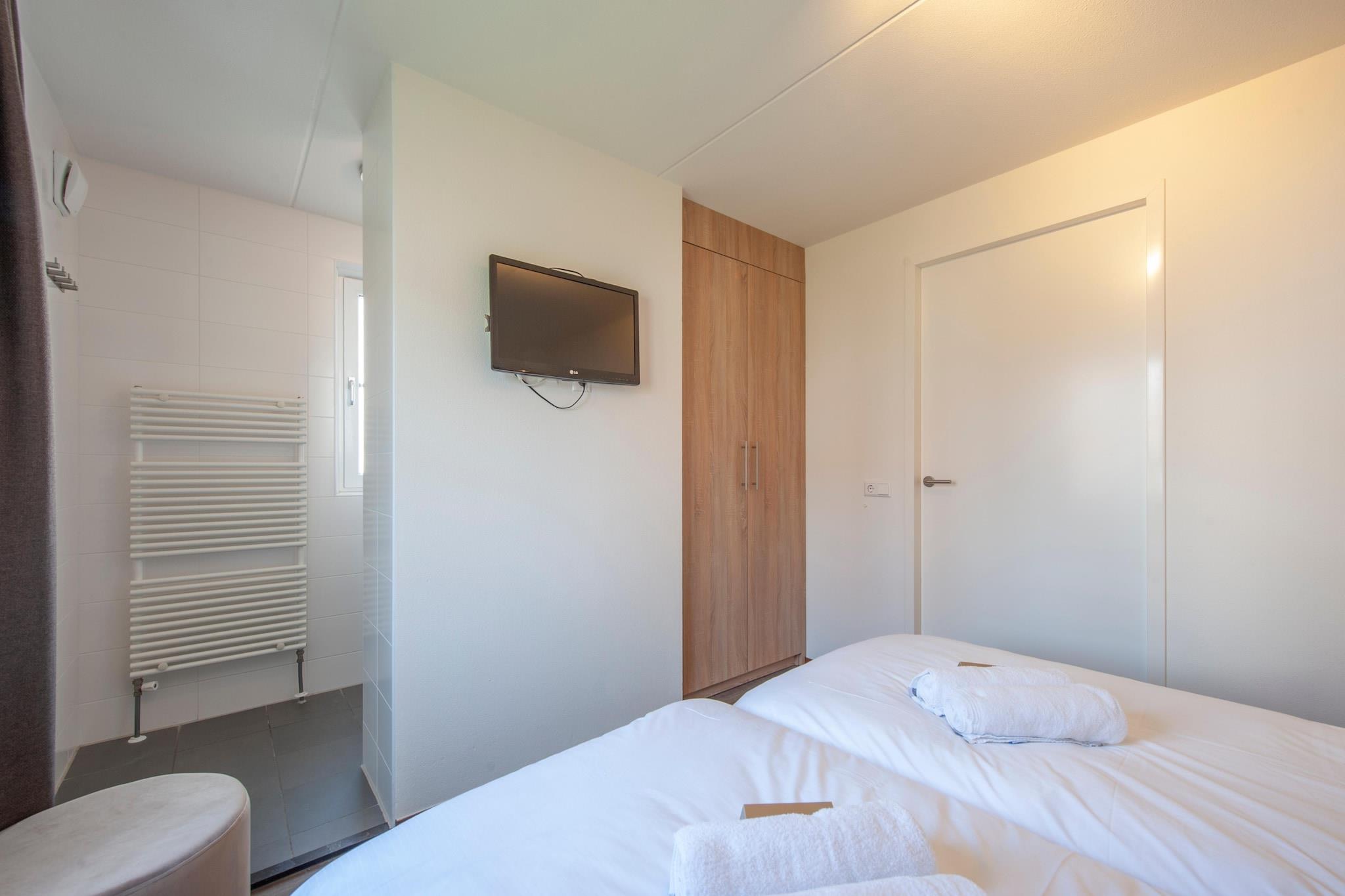 Denne nyrenoverede villa, som er fritliggende og ligger ved vandet, findes i ferieparken Noordzee Résidence Cadzand-Bad. Den ligger kun 400 m fra stranden ved Nordsøen og kun 13 km fra den berømte og charmerende belgiske badeby Knokke. Villaen er fuldt og komfortabelt møbleret og strækker sig over to etager. I stueetagen finder du en stue med tv med streamingfunktion og et åbent køkken med blandt andet mikrobølgeovn og opvaskemaskine. Der er også et soveværelse med dobbeltseng og eget badeværelse med bruser. I gangen har du et separat toilet til din rådighed. På første sal finder du tre dobbeltværelser, hver med to enkeltsenge med boxmadras, uanset om de er i en 2-personers konfiguration eller ej. Der er også et badeværelse med bruser og en dejlig infrarød sauna. Perfekt til fuldstændig afslapning. Der er et andet separat toilet på reposen. En vaskemaskine i opbevaringsrummet fuldender faciliteterne. Gennem terrassedørene kommer du til den lukkede have ved vandet med en overdækket terrasse med varme og havemøbler. Der er også to liggestole. Ved vandet finder du en privat anløbsbro med en robåd; sjov for både store og små! Der er parkering til to biler ved villaen. På Noordzee Résidence Cadzand-Bad er der forskellige villaer til leje for fire til seksten personer. Bemærk: Ovenstående indretning kan variere fra feriebolig til feriebolig.