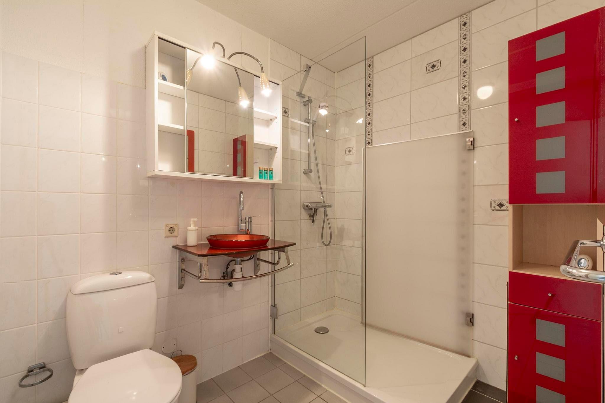På 1. etage: (Stue(Fjernsyn, sofahjørne, radio), åbent køkken(spisebord, kogeplade(Komfur med fire kogeplader, induktion), elkedel, brødrister, emhætte, kaffemaskine(kaffetragt, kaffepude), combi-mikroovn, opvaskemaskine , køleskab, (), ()), soveværelse(dobbeltseng(180 x 200 cm)), badeværelse(bruser, håndvask, toilet)) Internetadgang, balkon, varme(central), cykelopbevaring, havemøbler, parkering, trampolin, Parasol, elevator, tørreskab