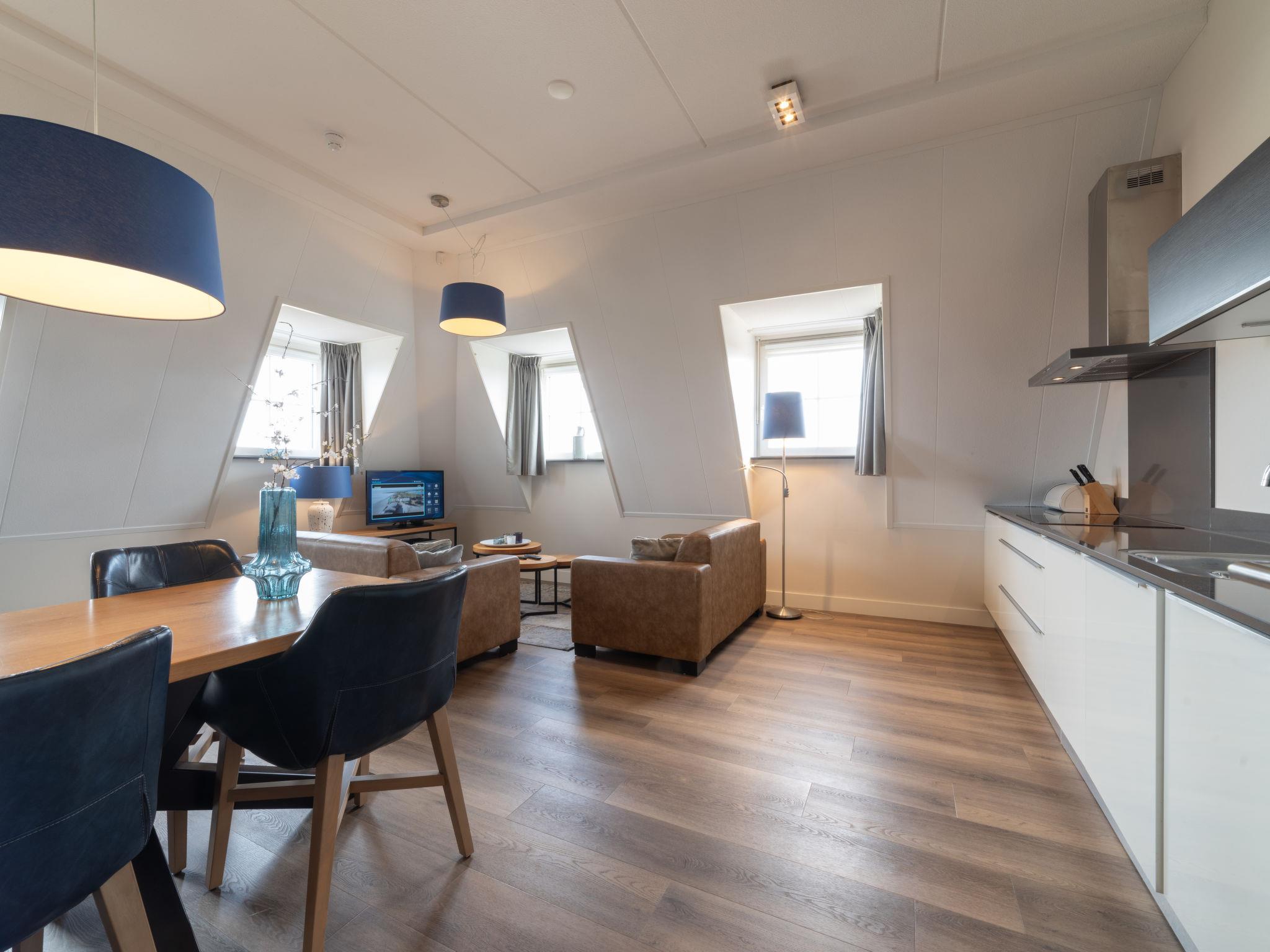 "Raadhuis", 3-room apartment 66 m2. Comfortable furnishings: entrance hall with separate WC. Open living/dining room with dining table and flat screen. Exit to the balcony. 2 double bedrooms, each room with 2 beds (90 cm, length 210 cm), TV (flat screen). Open kitchen (oven, dishwasher, 4 induction hot plates, kettle, microwave, electric coffee machine, Capsules for coffee machine (Nespresso-not incl.)). Shower/WC, hydro massage bath, Sauna. Underfloor heating. Balcony. Balcony furniture, box-room. Facilities: hair dryer. Internet (WiFi, free). Parking (2 cars). Please note: non-smoking house. Smoke alarm. The apartments have underfloor heating. Pet on request.
