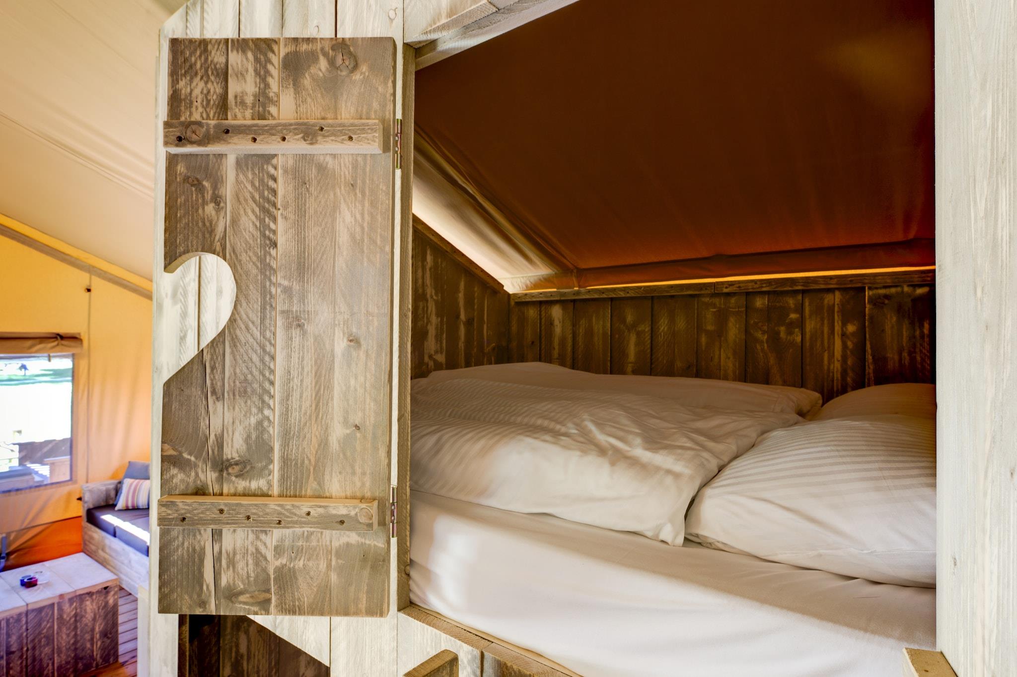 Træd ind i en glamping-oplevelse, hvor naturens charme smelter sammen med moderne komfort. Beliggende i rolige parkmiljøer i Dalfsen tilbyder denne rummelige teltlodge den perfekte balance mellem udendørsliv og indendørs bekvemmelighed. Med en hyggelig stue, et fuldt udstyret tekøkken, et pillefyr til kølige aftener og plyssenge - inklusive en unik dobbeltseng - er det dit hjem væk fra hjemmet, bare med et lærredstag og fuglesang morgener. Uanset om du er samlet omkring tv'et indenfor eller slapper af udenfor på den møblerede veranda, indbyder hvert øjeblik her til afslapning. Beliggende i det grønne hjerte af Overijssel byder Dalfsen på fred og nærhed. Parken er et roligt tilflugtssted, mens du i nærheden finder dejlige naturstier, der er ideelle til at gå eller cykle. Udforsk Vecht-flodbredderne, besøg det maleriske centrum af Dalfsen, eller oplev nærliggende godser som Rechteren Slot. Ved dagens afslutning kan du nyde al fresco-måltider ved dit picnicbord eller begive dig ud til lokale favoritter som Grand Café De Fabriek eller Herberg de Witte Gans for hollandske delikatesser. Dine lodne ledsagere er mere end velkomne her! Dalfsen og den omkringliggende Vechtdal-region tilbyder kæledyrsvenlige vandreruter, skovstier og endda lejlighedsvise hundevenlige begivenheder som den årlige "Doggy Walk" i nærliggende Ommen. Uanset om du slentrer langs de grønne stier eller slapper af på verandaen med dit kæledyr ved din side, sørger denne glamping lodge for, at intet familiemedlem bliver efterladt.