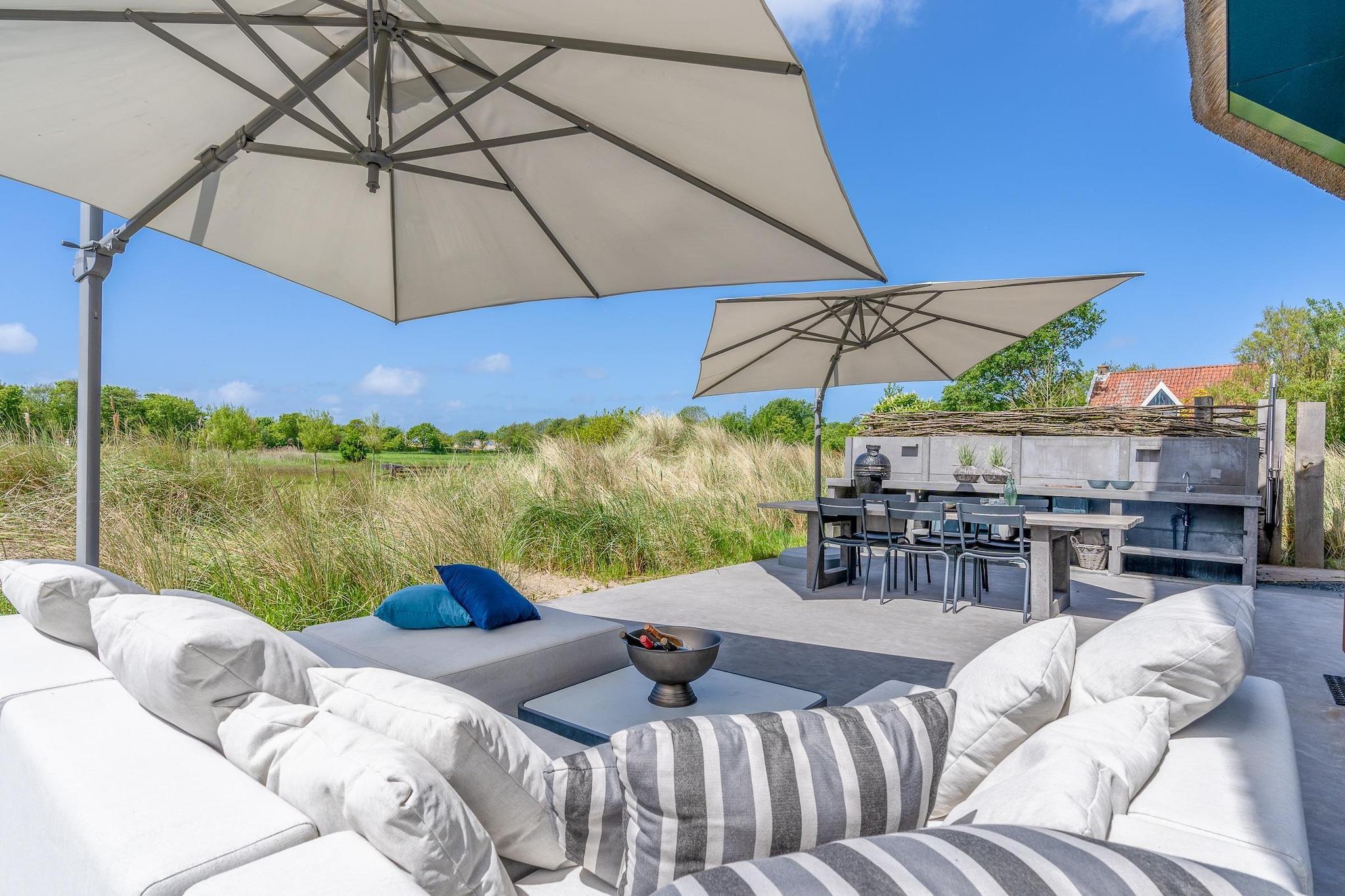 Denne luksusvilla ligger i udkanten af badebyen De Koog, nær stranden og skoven. Inspireret af den typiske Texel-fårefold tilbyder villaen en vidunderlig udsigt over den sydvendte have. Dette er et absolut topmoderne hus med et unikt og smagfuldt interiør. Den rummelige stue har et opholdsområde med pejs, smart-tv og musikanlæg. Der er en spiseplads med et stort spisebord til seks personer. Det åbne køkken er fuldt udstyret med forskellige indbyggede apparater, herunder en kombinationsmikrobølgeovn, dampovn, opvaskemaskine, Quooker og kaffemaskine. Der er et soveværelse i stueetagen med eget badeværelse med bruseniche med to regnbrusere og en dobbelt håndvask. Ovenpå er der to soveværelser med eget badeværelse. Disse badeværelser har en rummelig bruseniche og badekar. Alle soveværelser i huset har komfortable boxmadrassenge, og soveværelserne på første sal har et tv. Sengene er redt som standard, og håndklæder er inkluderet. Opholdsstuen åbner direkte ud til terrassen via skydedøre. Den sydvendte terrasse er udstyret med havemøbler. Der er en trampolin til børnene. Der er et fuldt udstyret udendørskøkken med The Bastard BBQ. Det brændefyrede spabad er tilgængeligt året rundt. Nyd de vidunderlige dufte, naturens lyde, den flammende brændeild og stjernerne på himlen. Haven er indhegnet, delvist af en port og delvist af en naturlig "Texel-havemur".