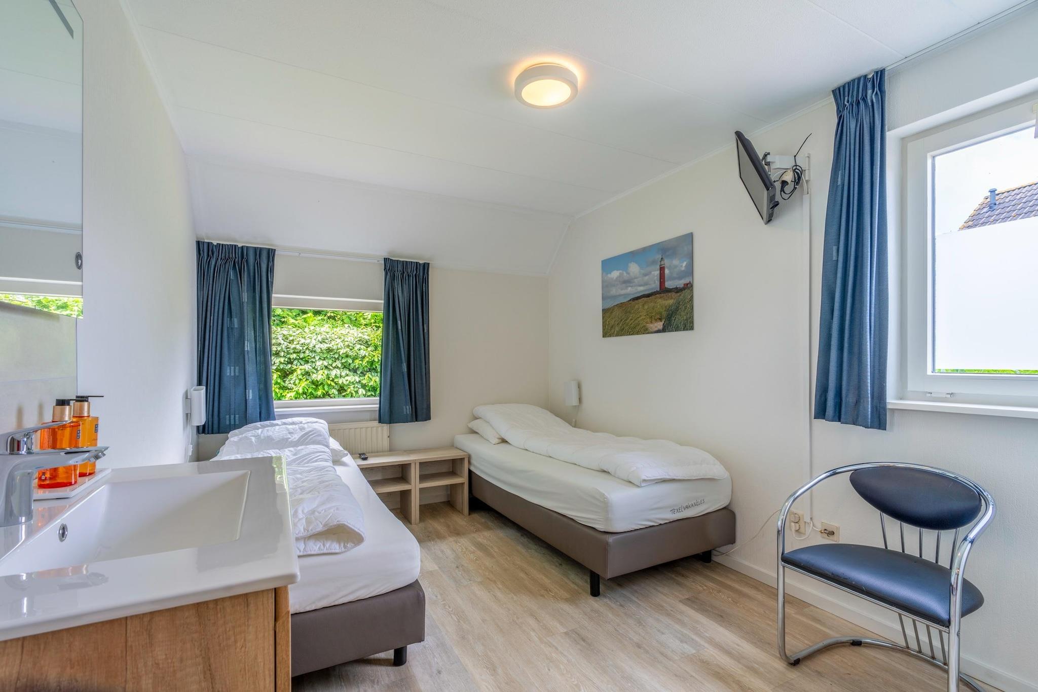 Denne charmerende villa til seks personer har et soveværelse med eget badeværelse i stueetagen. Villaen ligger i gåafstand fra De Koog og stranden. Den rummelige, lyse stue er et vidunderligt sted at slappe af. Det åbne køkken er fuldt udstyret. Der er tre soveværelser, hver med tv. Det ene ligger i stueetagen og har to enkeltsenge med boxmadras og et eget brusebad med walk-in regnbruser og håndvask. På første sal er der to soveværelser, hver med to enkeltsenge med boxmadras og et tv. Det store badeværelse er udstyret med bruser, badekar, spabad og sauna. Fra stuen åbner franske døre ud til terrassen og den dejlige have. Terrassen er møbleret med havemøbler. For børnene er der en fælles legeplads med forskellige legeredskaber i nærheden af villaen. To private parkeringspladser er til rådighed. Dette feriehus ligger på Villapark Kamperfoelie, en rummelig, lille og intim femstjernet park i udkanten af badebyen De Koog. Denne park byder på luksuriøse villaer, der tilbyder rigelig privatliv og komfort. De ligger 5 minutters gang fra den charmerende landsbymidte og mindre end 15 minutter fra stranden. Kort sagt: et perfekt sted at opdage fred, plads og ø-følelsen.