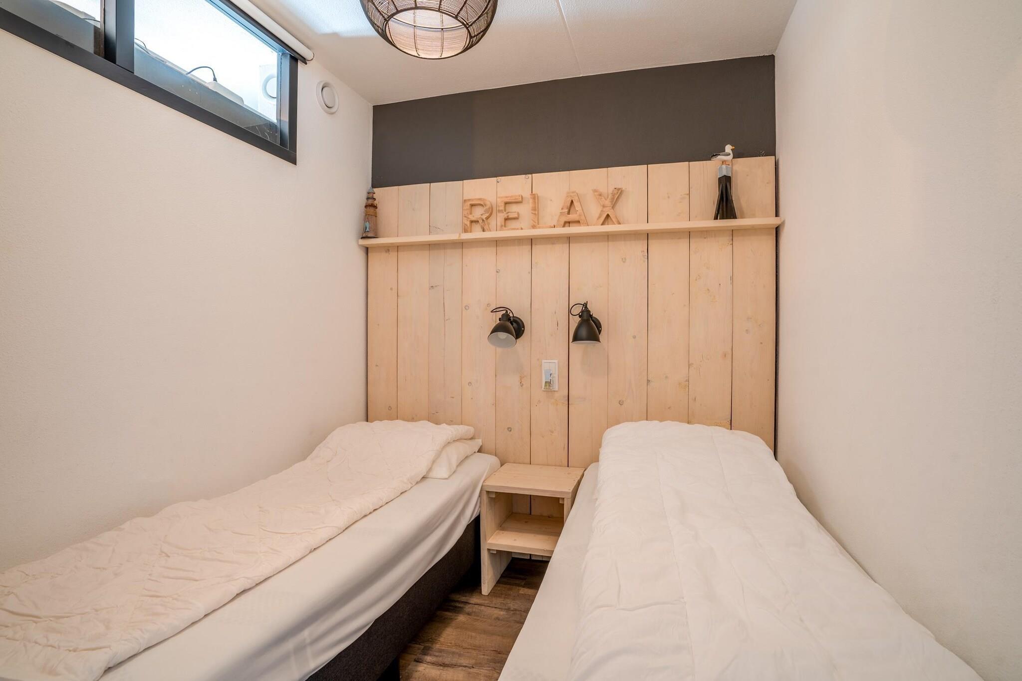 Moderne lejlighed til fire personer med sydvendt terrasse med udsigt over badebyen De Koog, klitterne og Vesterhavet. Den hyggelige stue har et opholdsområde med tv. Det pæne åbne køkken er fuldt udstyret med opvaskemaskine, køleskab med fryser, kombineret mikrobølgeovn og forskellige kaffemaskiner. Spiseområdet med spisebord til fire personer er også placeret her. Der er to soveværelser, hvoraf det ene har en dobbelt boxmadras og et tv. Det andet soveværelse har to enkeltsenge med boxmadras. Dette soveværelse er placeret midt i lejligheden og har derfor ikke et vindue med udsigt udad. Det renoverede badeværelse har bruseniche med regnbruser og dobbelt håndvask. Toilettet er placeret separat. Den sydvendte balkon tilbyder udsigt over badebyen De Koog, klitterne og Vesterhavet. Havemøbler er til rådighed. Et vaskerum er tilgængeligt i komplekset mod et gebyr. Børnemøbler er tilgængelige efter anmodning og mod et gebyr. Wi-Fi er tilgængelig. Rygning er ikke tilladt. Hver indkvartering har én privat parkeringsplads på stedet.