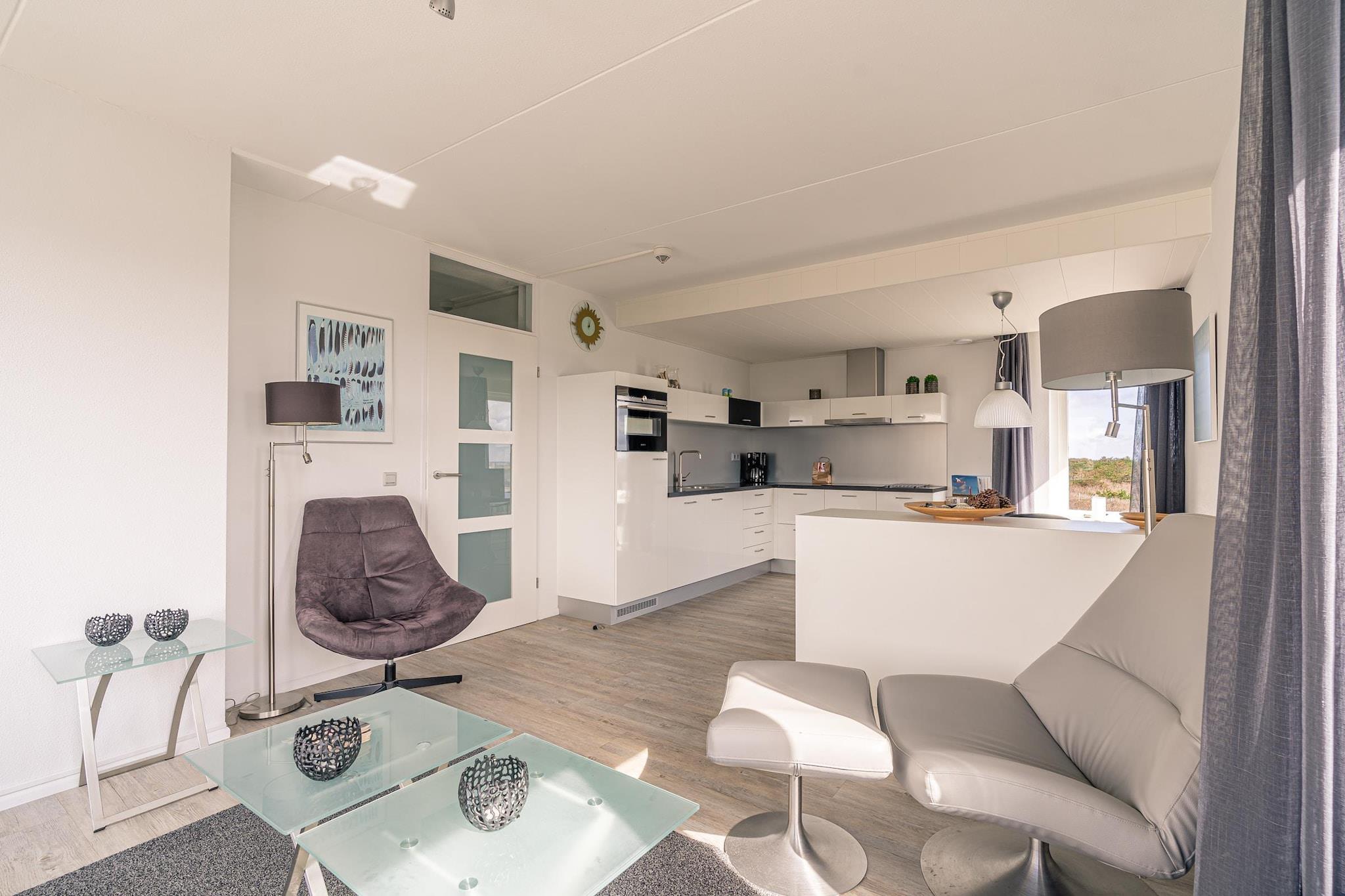 Charmerende 4-personers lejlighed på anden sal med udsigt over badebyen De Koog, klitterne og Vesterhavet. Stue med siddeområde, pejs, smart-tv og spiseplads. Det åbne køkken er udstyret med opvaskemaskine, køleskab med fryser, kombineret mikrobølgeovn og forskellige kaffemaskiner. Der er to soveværelser, et med en dobbeltseng og to enkeltmadrasser, og det andet med to enkeltsenge med boxmadras. Det mindste soveværelse ligger i midten af lejligheden og har derfor ikke et vindue med udsigt udad. Lille soveværelse: senge 70x200 cm. Badeværelset har badekar, bruser og håndvask. Toilettet er separat. Balkonen er udstyret med havemøbler og tilbyder udsigt over De Koog, klitterne og Vesterhavet. Et vaskerum er tilgængeligt i komplekset mod et gebyr. Børnemøbler er tilgængelige efter anmodning og mod et gebyr. Gratis Wi-Fi er tilgængelig. Hver bolig har én parkeringsplads på stedet. Rygning er ikke tilladt.