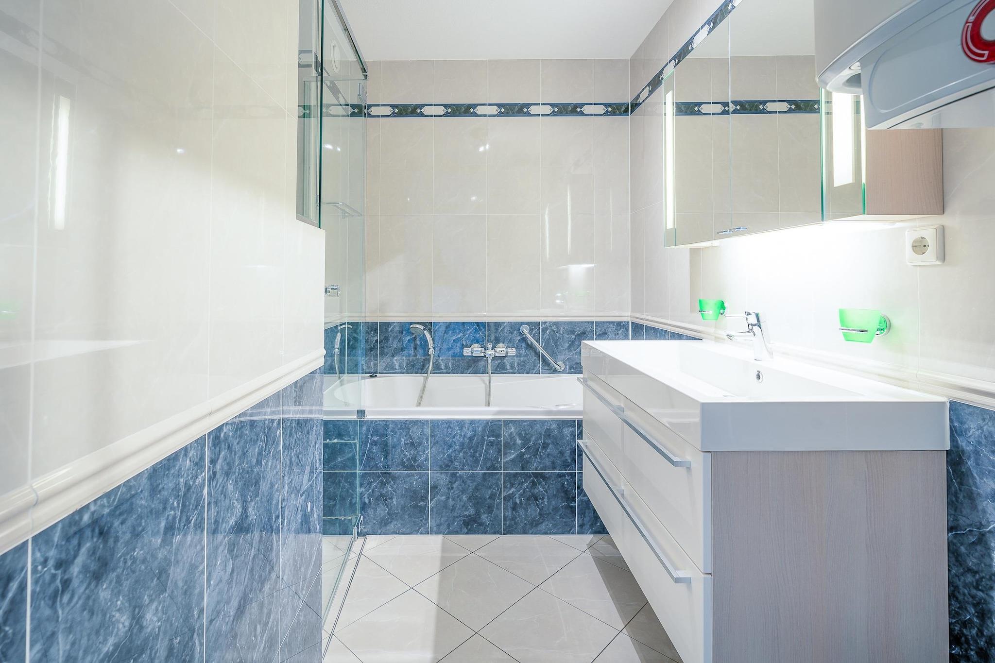 Stueetage: (Stue(Fjernsyn, spisebord, sofahjørne), åbent køkken(elkedel, brødrister, kaffemaskine(kaffetragt, kaffepude), combi-mikroovn, opvaskemaskine , køle-fryseskab, Saftpresser, elektriske kogeplader), soveværelse(dobbeltseng(boxmadras), Fjernsyn), badeværelse(badekar, bruser, sauna, håndvask, toilet, føntørrer)) balkon, cykelopbevaring, havemøbler, Parasol, elevator, Solcreme, Ladestation til el-biler