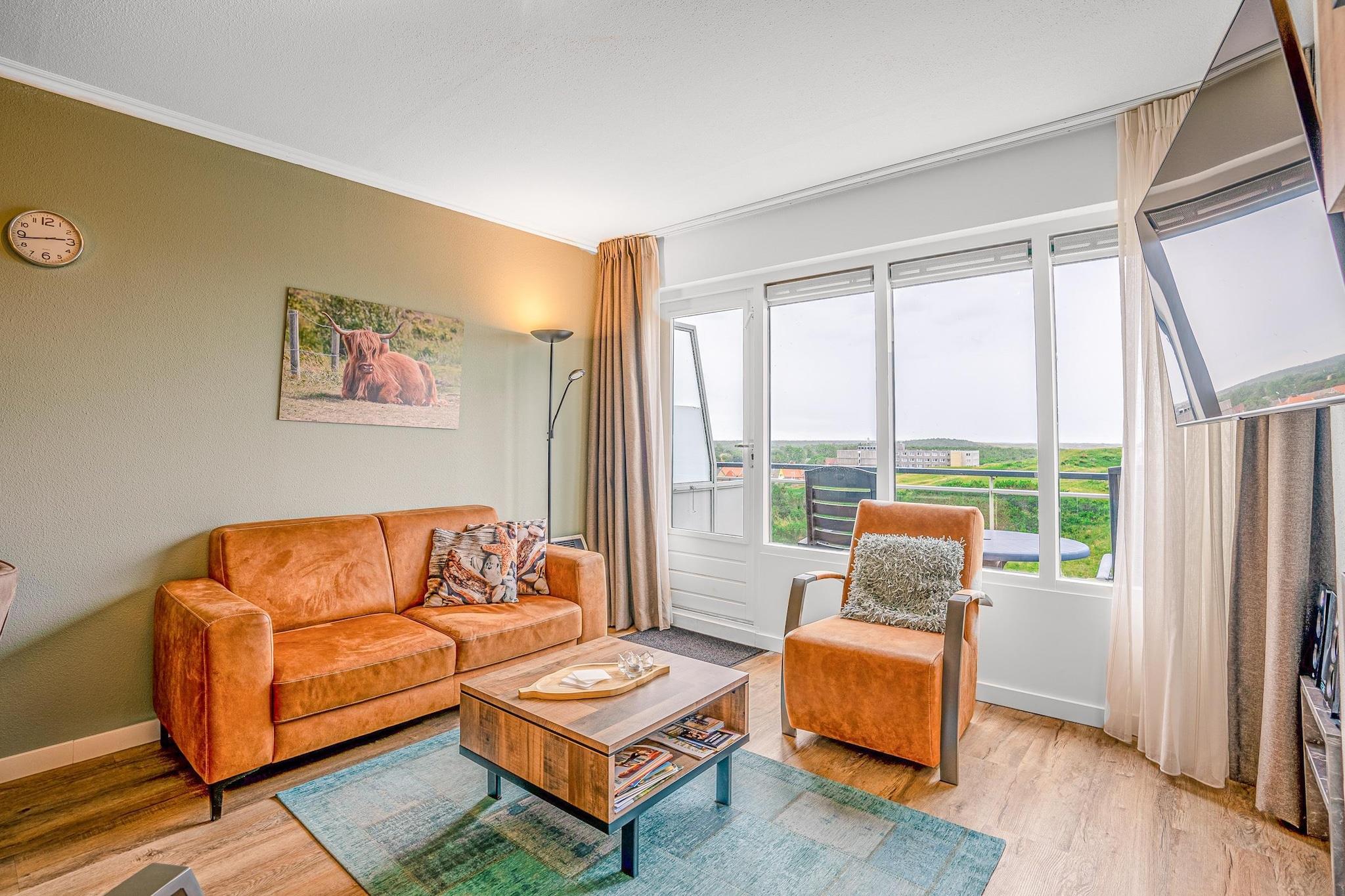 Moderne møbleret 2-personers lejlighed med havudsigt på anden sal med sauna. Balkon med udsigt over Texel, klitterne og Vesterhavet. Stue med siddeområde, spisebord, TV og stereoanlæg. Det åbne køkken er udstyret med opvaskemaskine, kombineret mikrobølgeovn, køleskab med fryser og forskellige kaffemaskiner. Soveværelset har en komfortabel dobbeltseng med boxmadras og TV. Badeværelset har badekar med spabadfunktion, bruser og håndvask. Toilettet er separat. Lejligheden har også en finsk sauna. Balkonen er udstyret med havemøbler og tilbyder udsigt over klitterne og Vesterhavet. Vaskerifaciliteter er tilgængelige på stedet. Børnemøbler er tilgængelige efter anmodning og mod et gebyr. Gratis Wi-Fi. Rygning er ikke tilladt. Der er én parkeringsplads til rådighed pr. indkvartering på stedet.