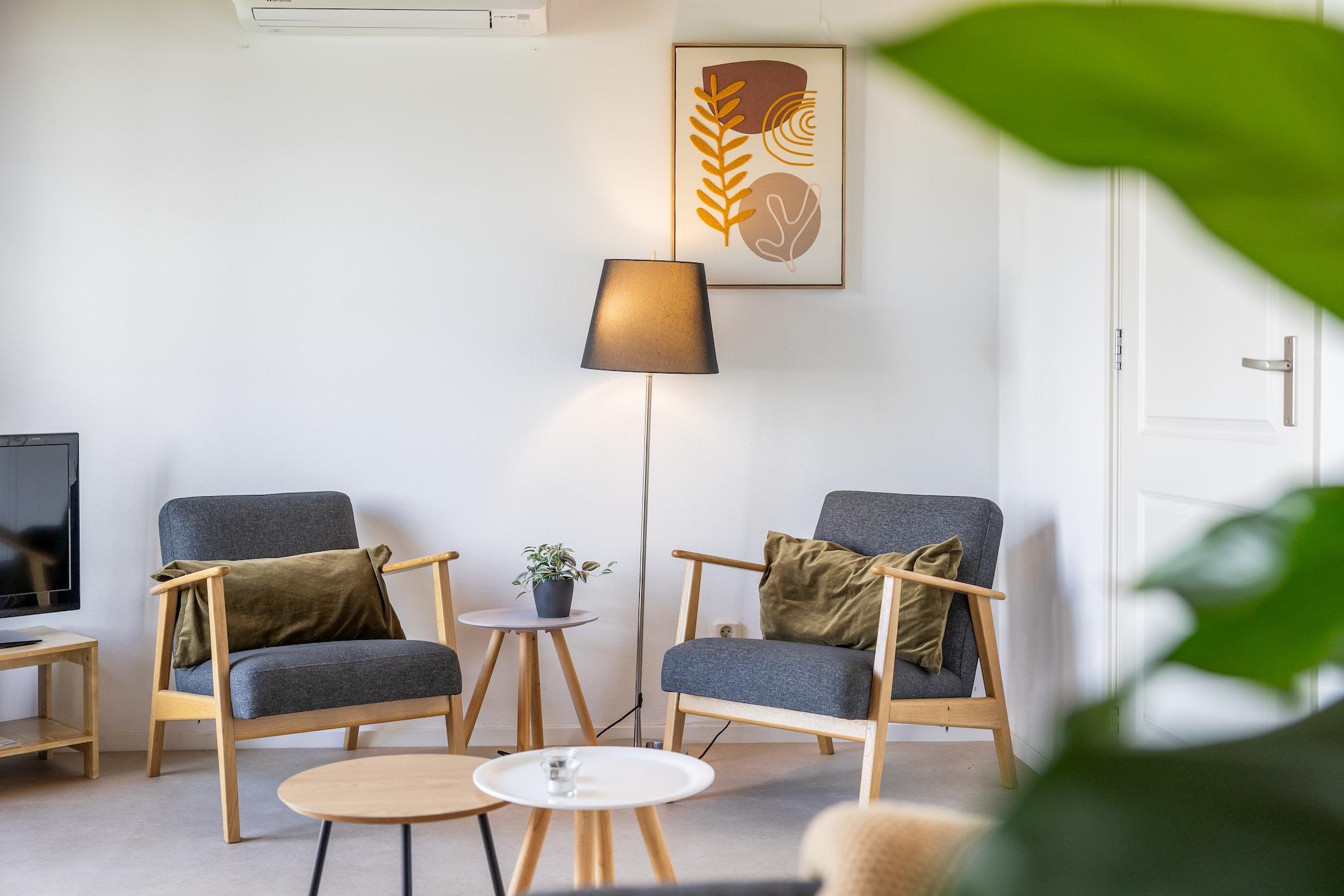 Stueetage: (Køkken(elkedel, komfur(elektrisk), kaffemaskine(kopper), ovn, køle-fryseskab), stue / spisestue(Fjernsyn(digital, Tyske TV-kanaler), spisebord, sofahjørne), soveværelse(dobbeltseng), soveværelse(køjeseng), badeværelse(bruser, håndvask, toilet), klimaanlæg, ) veranda, varme(elektrisk), havemøbler, legeredskaber(deles med andre gæster)
