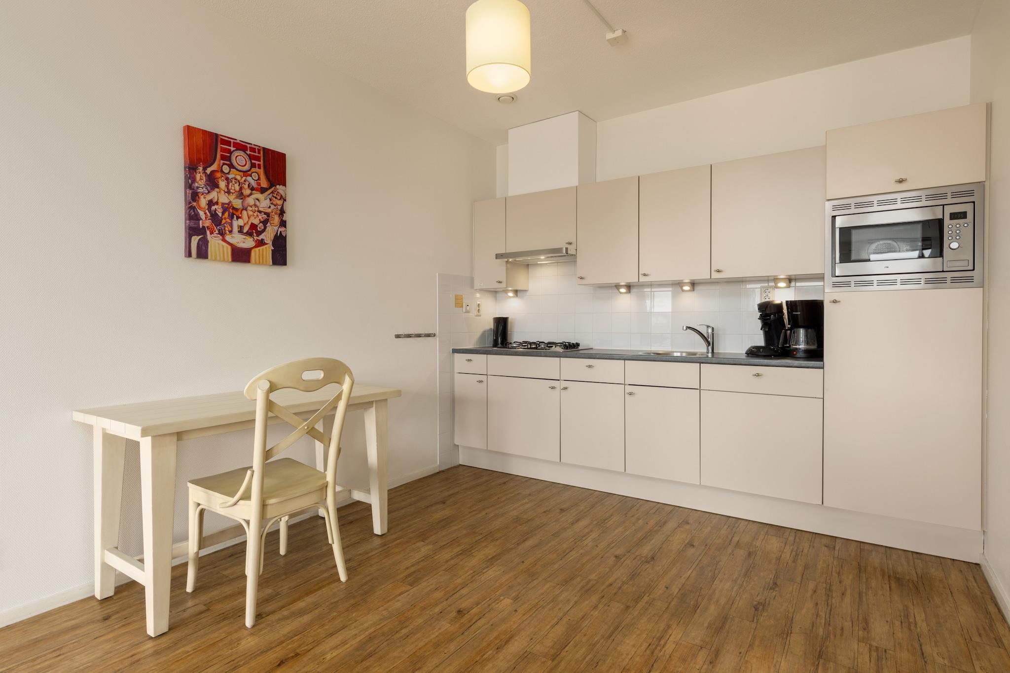 Chik kystkomfort med udsigt Slå dig ned i ro ved havet i denne moderne lejlighed i et plan i Nautisch Centrum Scheveningen. Beliggende lige ved den maleriske havn og kun 500 meter fra det livlige strandresorts centrum, er denne lyse og stilfulde lejlighed den perfekte tilflugtssted for par eller solorejsende. Indenfor finder du en hyggelig stue med et tv og et åbent køkken udstyret med alt det nødvendige - inklusive en opvaskemaskine og mikroovn. Det afslappende soveværelse har to boksmadrasser (konfigureret som en dobbeltseng eller to enkeltsenge), mens badeværelset og separat toilet tilføjer ekstra bekvemmelighed til dit ophold. Afslapning med udsigt over havnen eller havet Træd ud på din private, møblerede altan og nyd udsigten over sejlbåde eller Nordsøens fjerne bølger. Uanset om du nyder en fredelig morgenkaffe eller et gyldent timeglas vin, bringer dette udendørsområde havnens charme lige til dit dørtrin. Lejlighedens fredelige, kæledyrsfrie omgivelser sikrer et rent, roligt ophold - perfekt for dem, der søger hvile, frisk luft og nem adgang til alt, hvad Scheveningen har at tilbyde. Spisestue ved havet og nem udforskning Fra din hoveddør er du kun få minutter væk fra stranden, den travle boulevard og en række fremragende spisemuligheder. Nyd frisk fisk og skaldyr på havnens berømte "Catch by Simonis", nyd cocktails med udsigt til "Zeezicht", eller slentre ned til molen for underholdning ved havet.