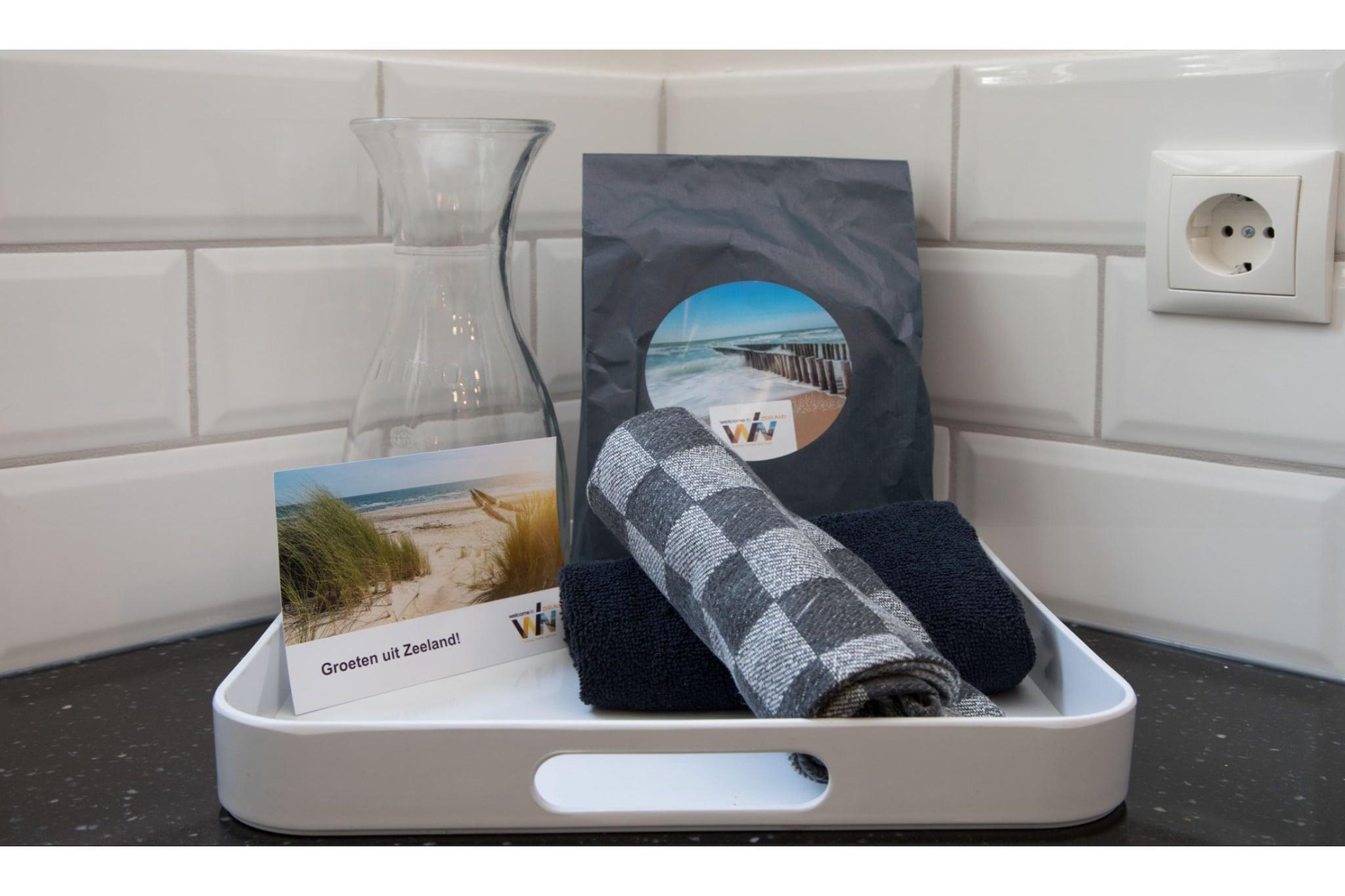 Nyd et fritliggende feriehus i skoven med masser af privatliv, kun 3 minutters gang fra klitterne og stranden i Dishoek. Vågn op om morgenen til fuglesang og gå en tur gennem klitområdet. Sådan skal en ferie være! Dette feriehus ligger beskyttet blandt træerne. Alle værelser i denne moderne bolig ligger i stueetagen, hvilket gør dem let tilgængelige. Feriehusets opholdsstue har et hyggeligt åbent opholdsområde med hjørnesofa og smart-tv. Under dit ophold kan du benytte WiFi. Det store runde spisebord er centralt placeret i rummet og forbinder opholdsstuen og det åbne køkken. Køkkenet har ovn, brødrister, opvaskemaskine, køleskab med lille fryserum samt både en filterkaffemaskine og en Nespresso-kaffemaskine. Denne bolig har to soveværelser. Det store soveværelse har en dobbeltseng med boxmadras (160x200 cm), og det andet soveværelse har to enkeltsenge med boxmadras (90x200 cm). De komfortable senge og mørklægningsgardiner sikrer en god nats søvn. Til de små er der en sammenklappelig barneseng (60x120 cm) og en højstol til rådighed. Du kan friske dig op i det moderne badeværelse, der er udstyret med brusekabine, to håndvaske, håndklædetørrer og vaskemaskine. Gennem franske døre kommer du ud i haven med en stor græsplæne og masser af grønne omgivelser med buske og træer. På terrassen finder du liggestole og en solseng samt et havebord med stole til udendørs spisning. I skuret er der en stor parasol og forskellige (strand)spil, som du kan bruge. Der er parkering ved huset til to biler og cykelopbevaring. Et kæledyr er tilladt.