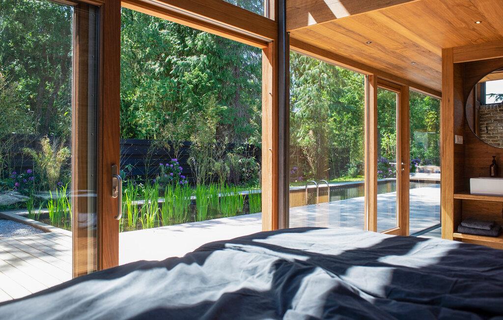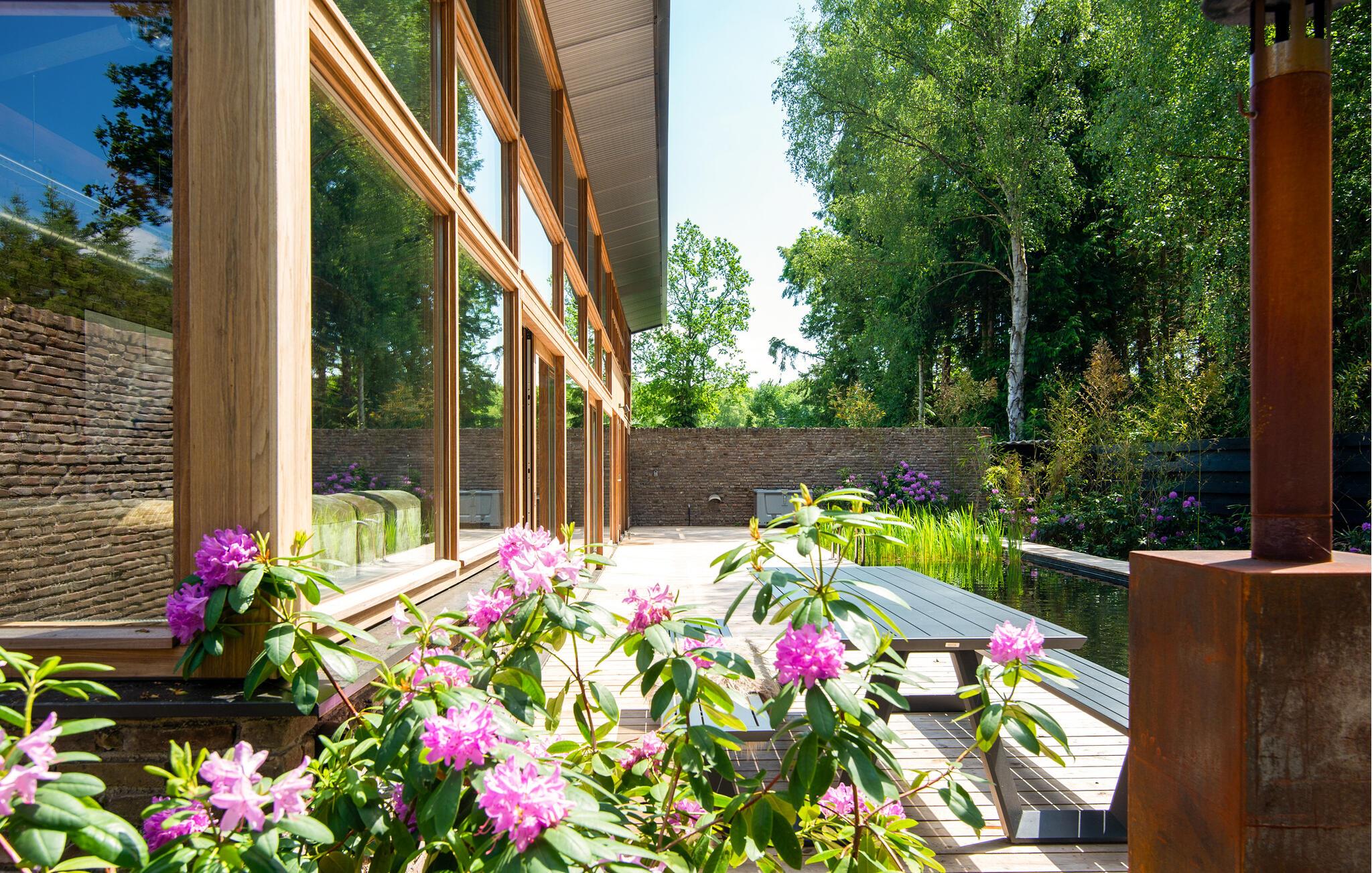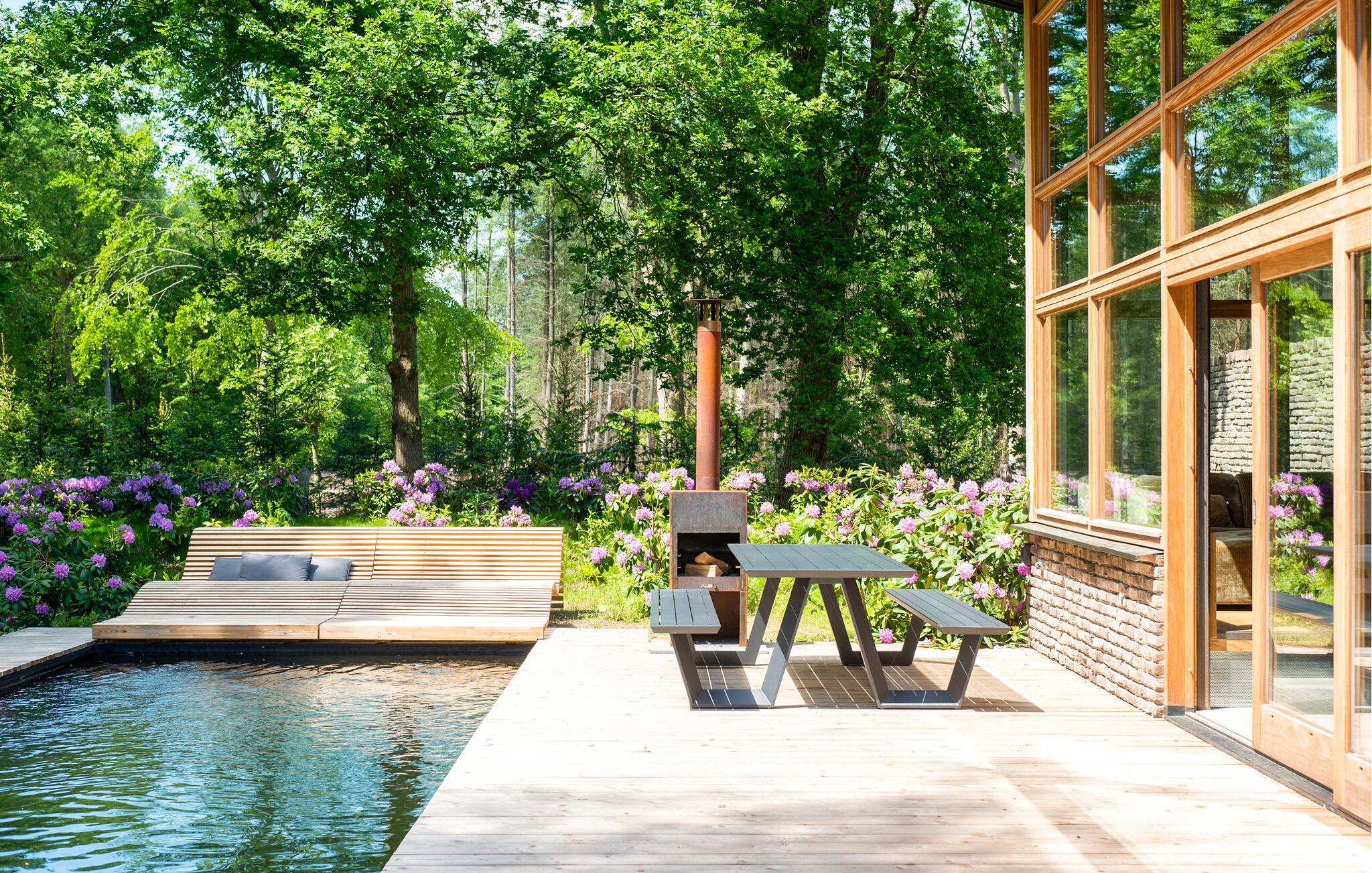 Udenfor kan I nyde solen på den moderne terrasse. Find en plads på soldækket eller slap af ved vandet på en liggestol for at afslutte dagen. Den frodige landskabspleje og den høje naturstensmur skaber en privat atmosfære, ideel til rolige øjeblikke udendørs.