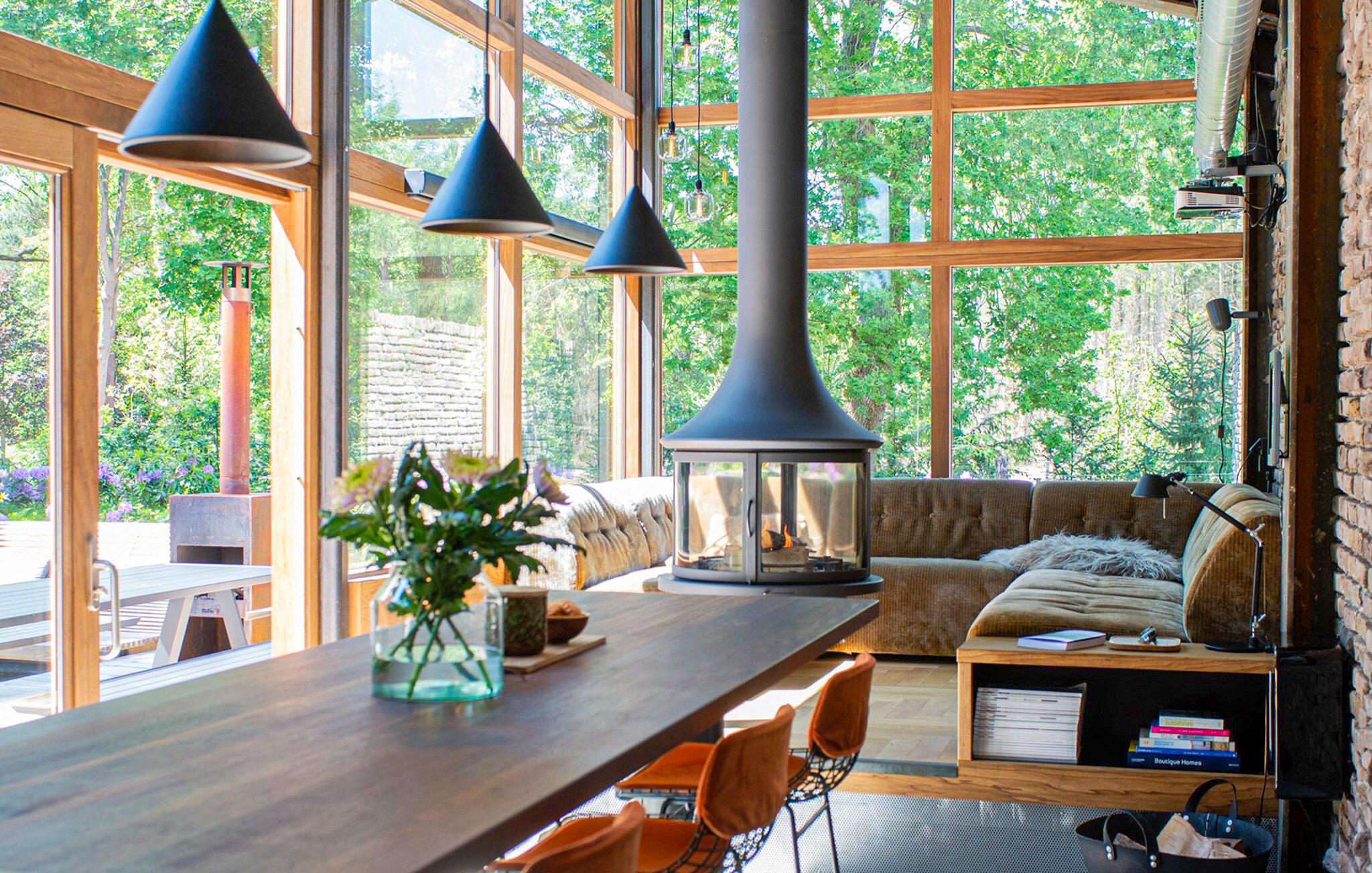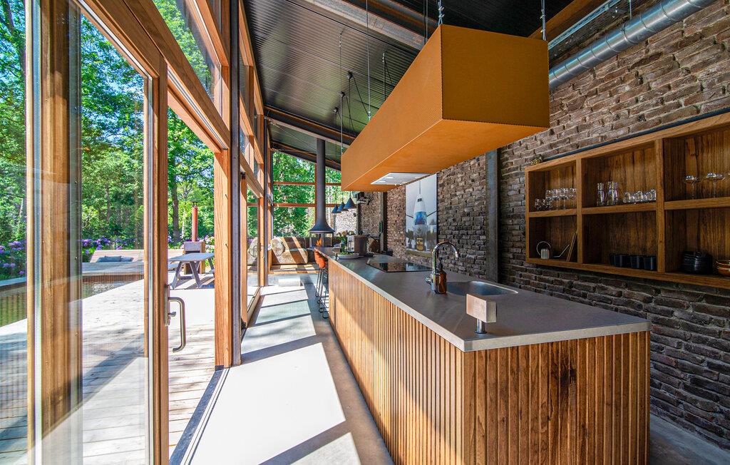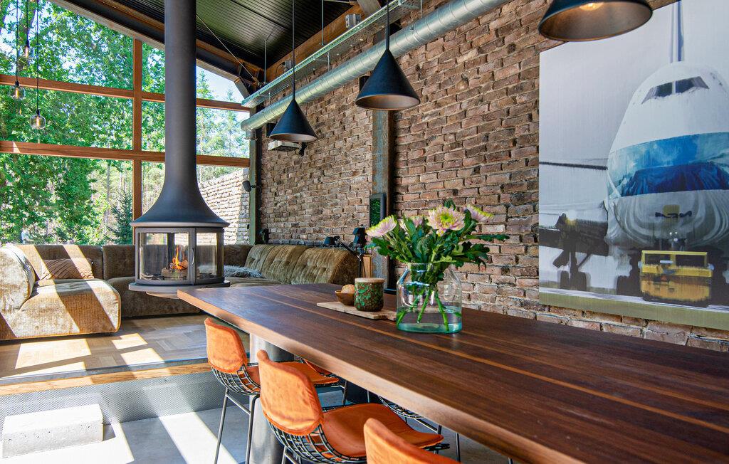 Nyd jeres ophold i dette exceptionelle hus, der på imponerende vis kombinerer moderne arkitektur med rolige, naturlige omgivelser. find jer til rette i den brede sofa i stuen, der er placeret lige foran gulv til loft-vinduerne. Tilbring hyggelige aftener ved den centralt placerede pejs og nyd dens behagelige varme. Tilbered jeres måltider i det stilfulde køkkens lange arbejdsflade eller find sammen omkring det store træbord til et måltid sammen.