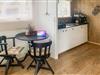 Dette moderne hus er lyst og smagfuldt indrettet. Her kan I tage jeres hund med på ferie. Ud over det store soveværelse rummer huset et køkken, badeværelse og en stue. I stuen er der en fin brændeovn.