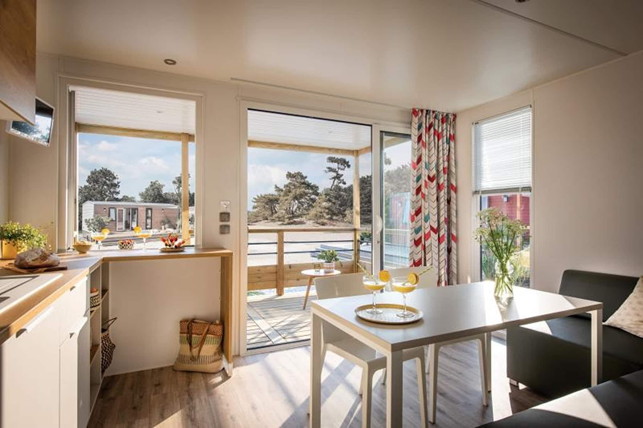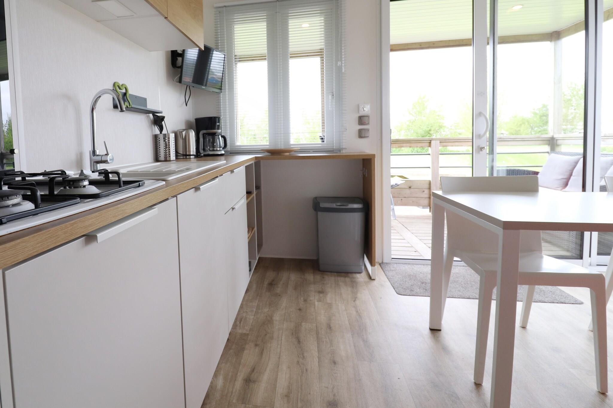 Beliggende på en indbydende familiecampingplads lige ved Hegermeers rolige vand, tilbyder denne moderne terrassehytte en dejlig oase for både naturelskere og familier. Den overdækkede, oplyste terrasse giver et indbydende udendørsområde til at nyde aftensmaden eller slappe af under stjernerne og skabe perfekte minder. Indenfor har det lyse og komfortable interiør en smart planløsning, hvor begge soveværelser åbner ud til et stilfuldt badeværelse. Det ene soveværelse har et legende højsengsområde, ideelt til børn, hvor de kan nyde deres eget særlige rum, mens et separat toilet og et fuldt udstyret køkken sikrer bekvemmelighed og komfort under dit ophold. Hyttens interiør er designet til afslapning med et tv til underholdning og elektrisk opvarmning i både stuen og badeværelset for at holde dig hyggelig. Vinduerne er udstyret med myggenet og mørklægningsgardiner, hvilket giver fredelige nætter og frisk luft. Det gennemtænkte design gør det nemt at slå sig ned og nyde de naturlige omgivelser, uanset om du er inde eller ude på terrassen. Beliggende direkte ved Hegermeer tilbyder ejendommen direkte adgang til søens charmerende havn, hvor du kan leje en slup eller sejlbåd på stedet eller tage en forfriskende svømmetur. En afslappet gåtur ind til den nærliggende landsby Heeg kan varmt anbefales, hvor hyggelige terrasser ved vandet og butikker venter. Selve campingpladsen har et opholdsrum med bordfodbold og andre spil samt en legeplads for børn, der sikrer sjove dage for alle aldre. Denne hytte tilbyder den perfekte blanding af udendørs eventyr og afslappende komfort i naturskønne omgivelser ved søen.