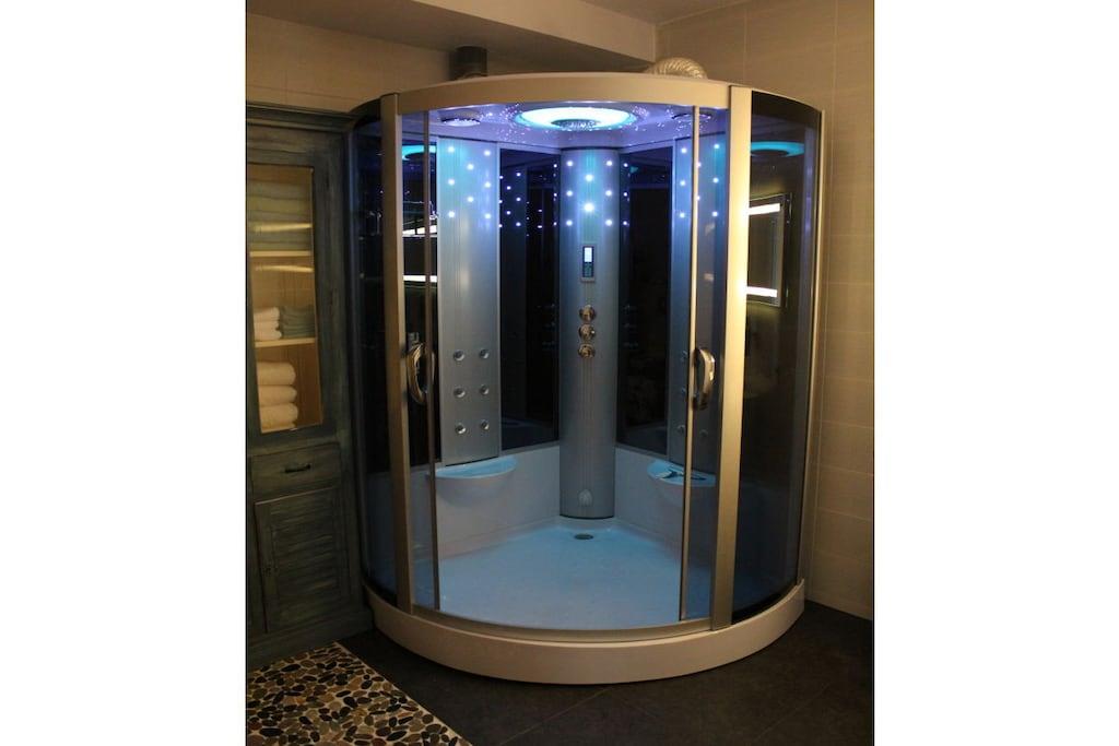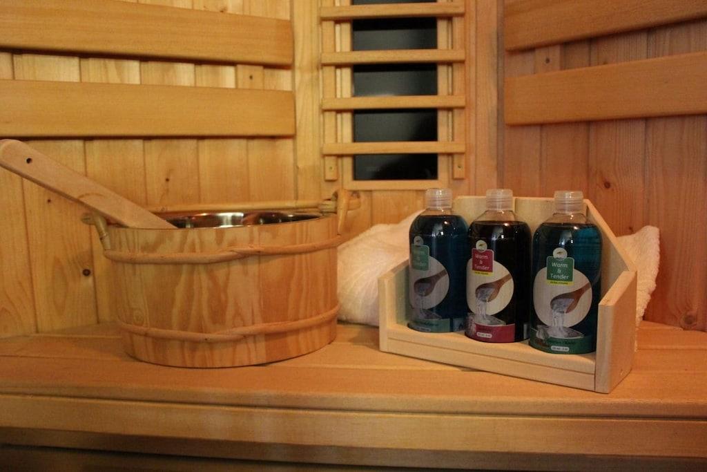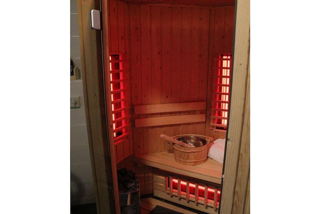 Stueetage: (Stue/soveværelse(, , , toilet, dobbeltseng, Fjernsyn, varme), badeværelse(, Hytte, toilet, sauna, Tyrkisk bad, bruser, håndvask, varme)) , , , åbent køkken(, spisebord, kogeplade, elkedel, brødrister, kaffemaskine, ovn, mikrobølgeovn, opvaskemaskine , køleskab, fryser, varme), Internetadgang, tørretumbler, vaskemaskine, varme, terrasse(grill, havemøbler, solstole), parkering