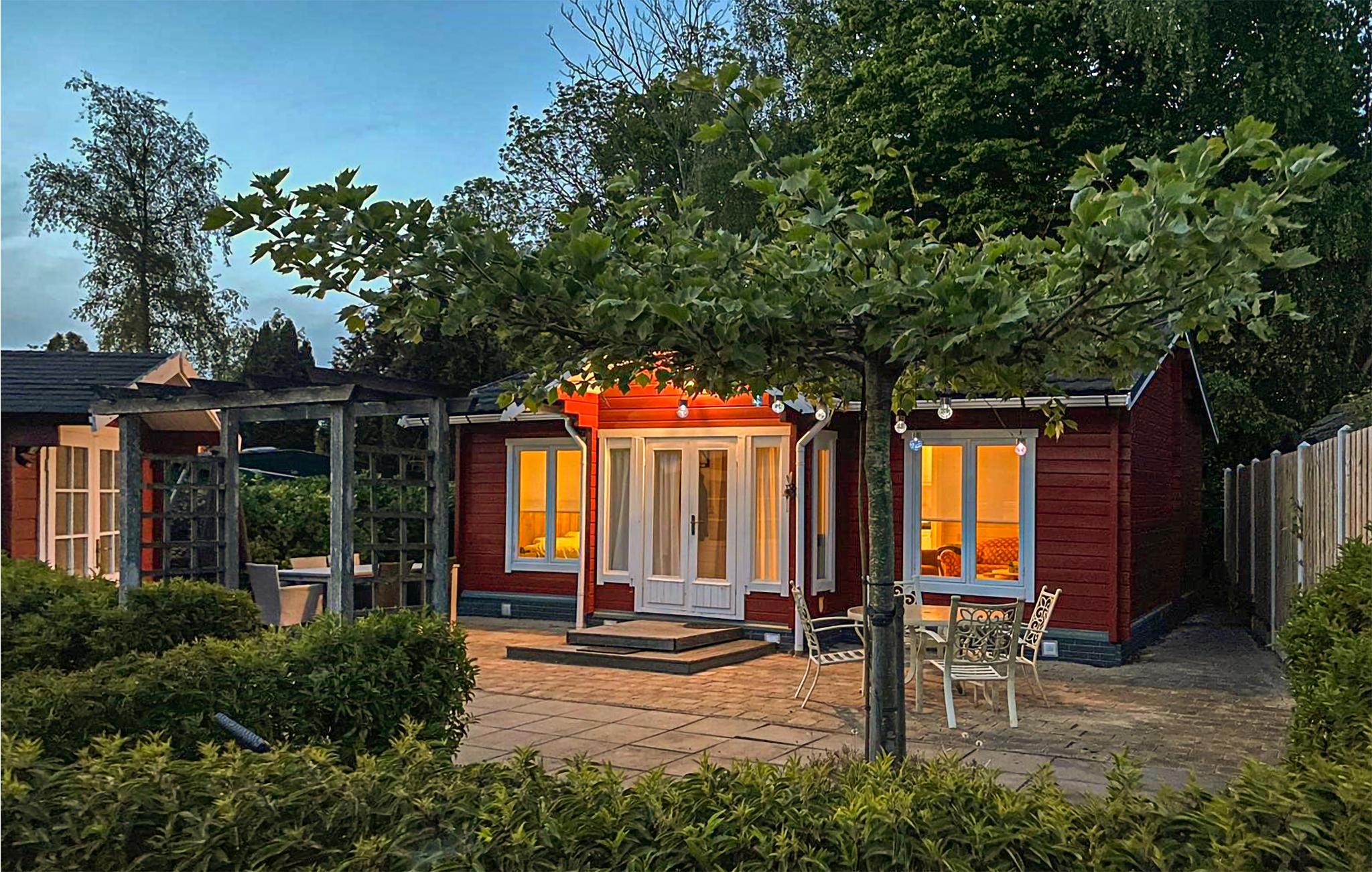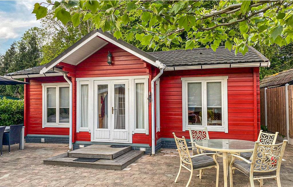 Hyggeligt rødmalet feriehus i en feriepark lige ved søen Stelleplas.