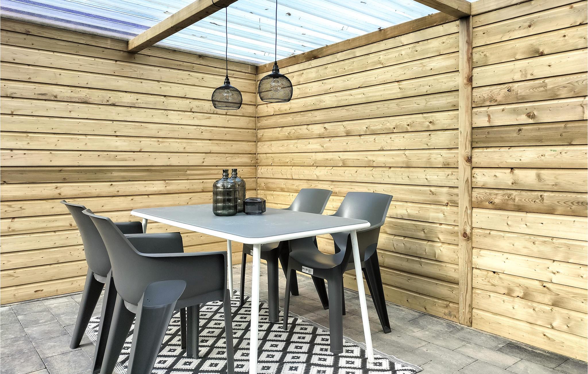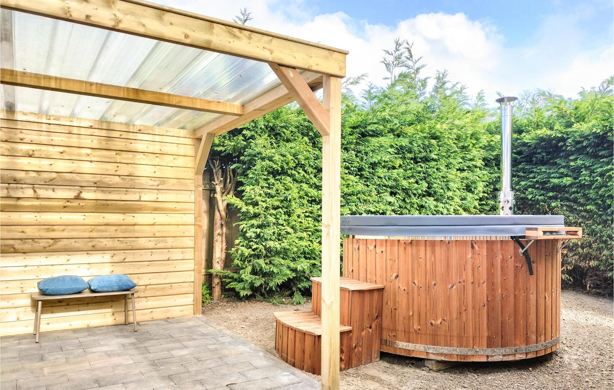 Udenfor venter en overdækket terrasse, hvor I kan begynde dagene med morgenmad og grille med vin og stearinlys i skæret. Benyt jer af den opvarmede udendørs pool med vandrutsjebane, børnepool og solbadeplæne. I kan slappe helt af i vildmarksbadet. Der er en pose brænde i huset, mere brænde kan købes i den nærliggende butik, I bedes selv fylde og opvarme vildmarksbadet.