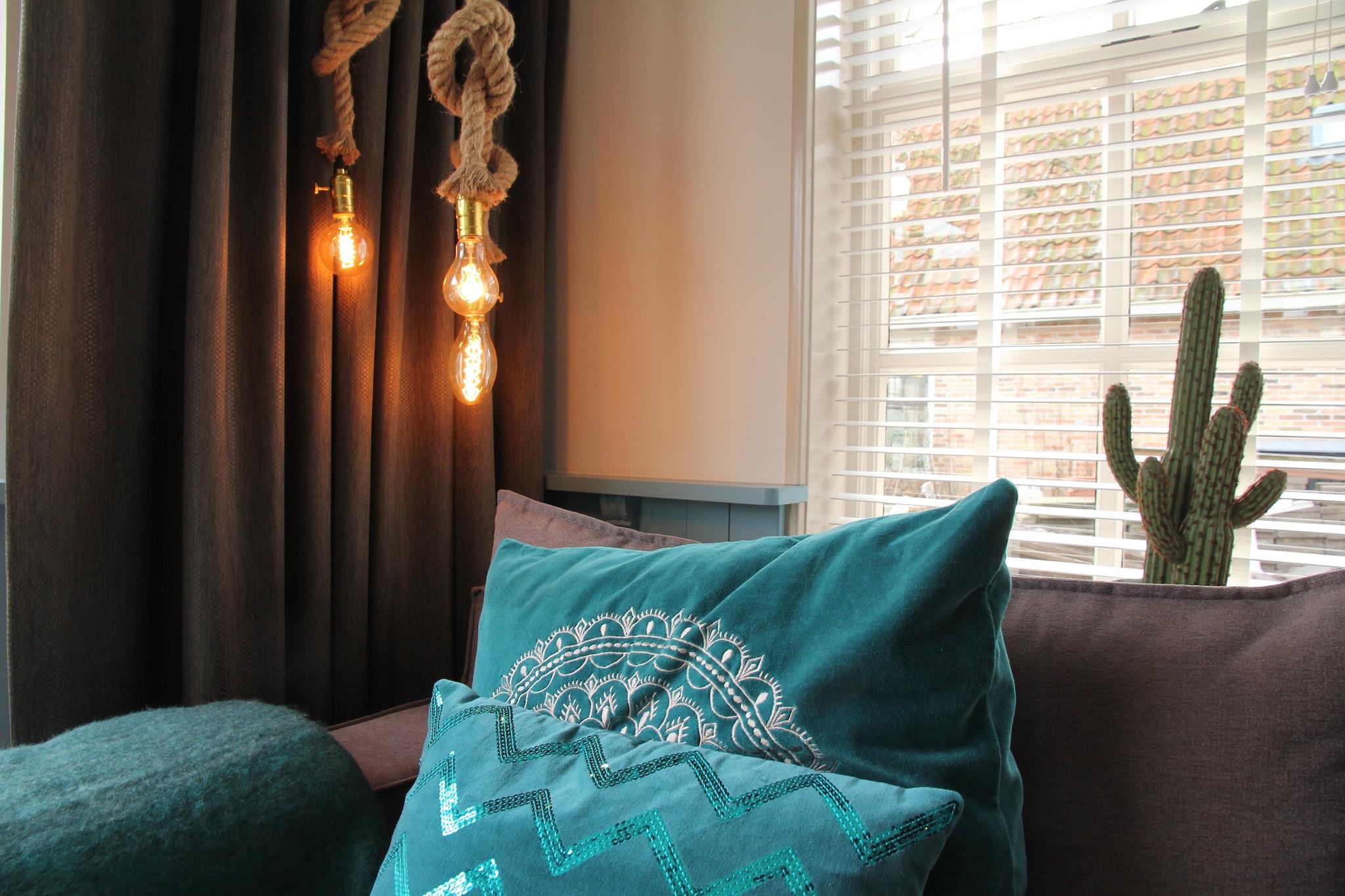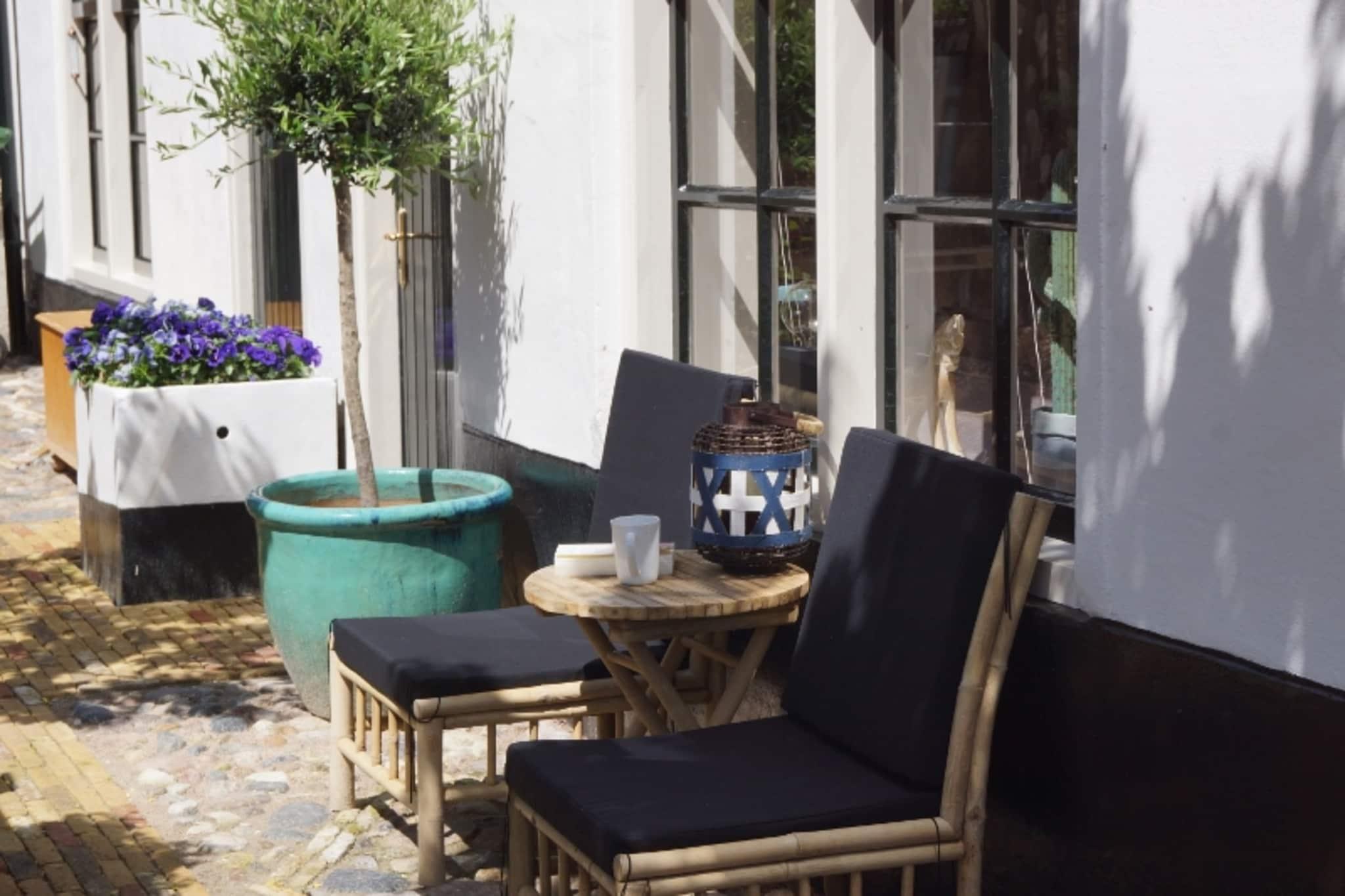 Stueetage: (åbent køkken(elkedel, komfur(gas), kaffemaskine(kaffetragt), ovn, opvaskemaskine , køle-fryseskab), stue / spisestue(Fjernsyn(digital, Hollandske TV-kanaler, Tyske TV-kanaler), spisebord(4 personer), kakkelovn(træ), sofahjørne(4 personer)), toilet) På 1. etage: (soveværelse(2x enkeltseng(dynebetræk)), soveværelse(dobbeltseng(to enkeltdyner)), badeværelse(bruser, 2x håndvask, toilet)) havedøre, varme(central), have, havemøbler, grill, liggestole, cykler til rådighed(betalt, på anmodning)