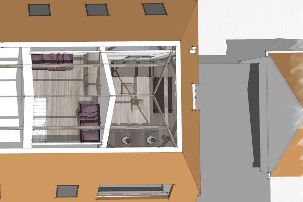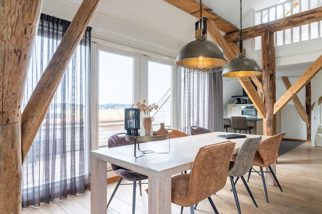 Denne lejlighed har to soveværelser i stueetagen, hvoraf det ene har eget badeværelse. I stueetagen er der også et separat toilet og et andet badeværelse med spabad, dobbelt håndvask og bruser. Ovenpå finder du en rummelig stue med smukke, autentiske detaljer. Det er et vidunderligt sted at slappe af ved pejsen, en følelse der forstærkes af den dejlige udsigt udenfor. Det rummelige køkken er fuldt udstyret. Der er også et separat toilet på denne etage. En fast trappe fører op til mezzaninen, som har plads til to enkeltsenge (90 x 200 cm).