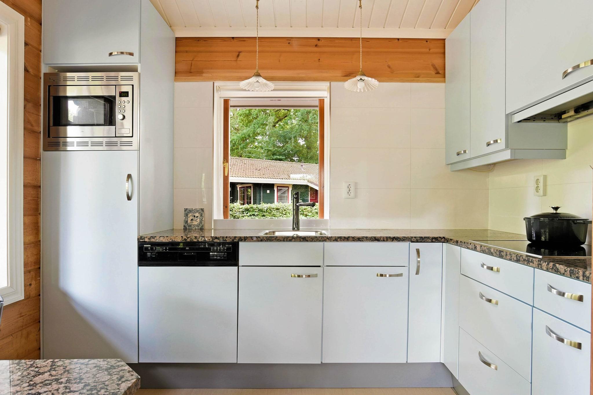 Stueetage: (Køkken(elkedel, komfur, kaffemaskine, mikrobølgeovn, opvaskemaskine ), stue / spisestue(Fjernsyn, spisebord, sofahjørne), soveværelse(dobbeltseng), soveværelse(enkeltseng, feltseng), badeværelse(badekar med bruser, håndvask, toilet), toilet, sauna) vaskemaskine, terrasse, have(privat), havemøbler, grill