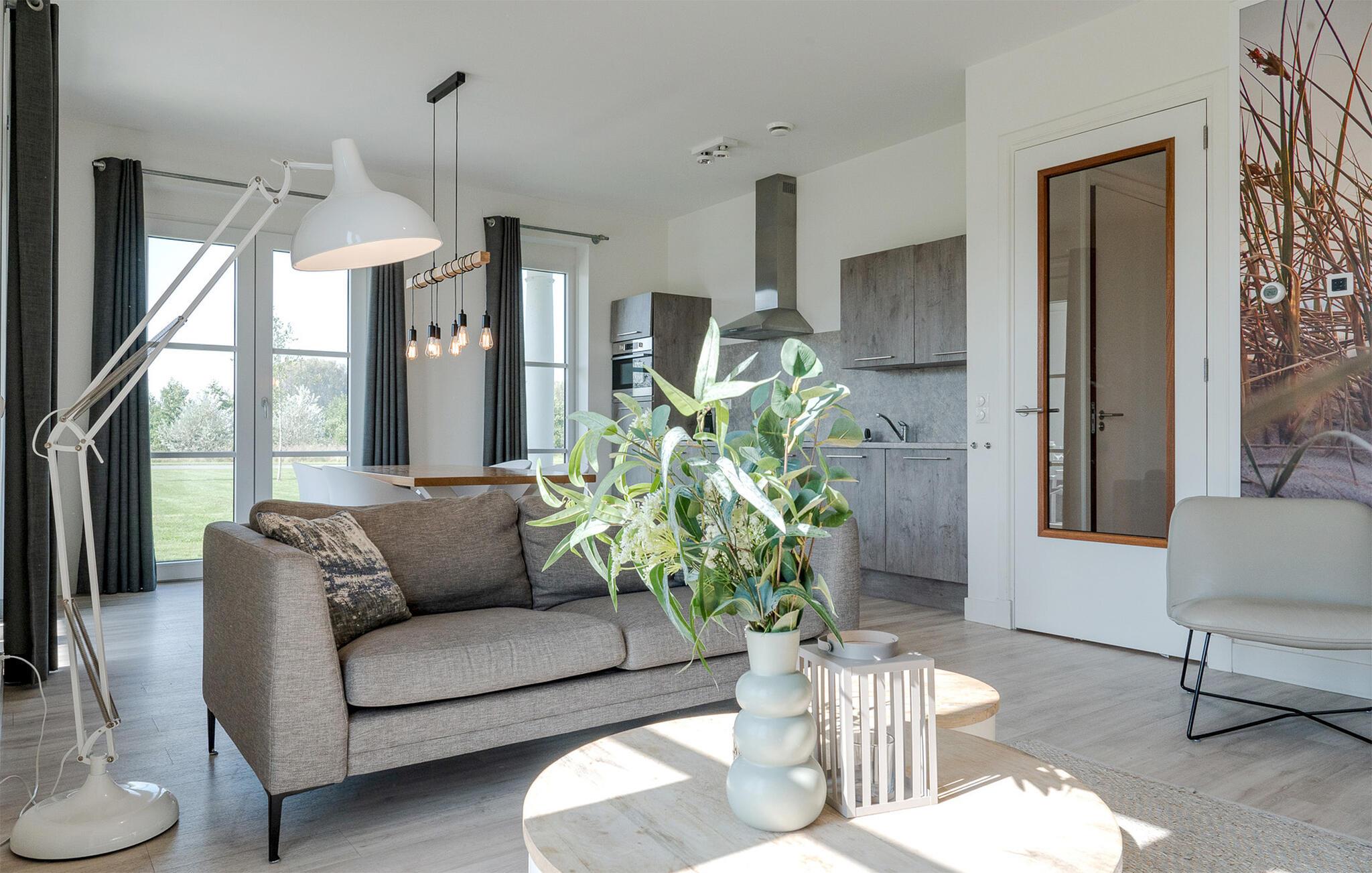 Denne moderne og luksuriøse ferielejlighed i en elegant lejlighedsbygning giver jer det perfekte sted at slappe af. De stilfulde møbler og den lyse, maritime atmosfære skaber en rolig og indbydende atmosfære. Her har I masser af plads til at finde jer godt til rette med familien eller venner. Mød hinanden i det åbne opholdsrum, der succesfuldt kombinerer køkken, spisestue og opholdsstue og lægger op til at lave mad, spise eller slappe af sammen.