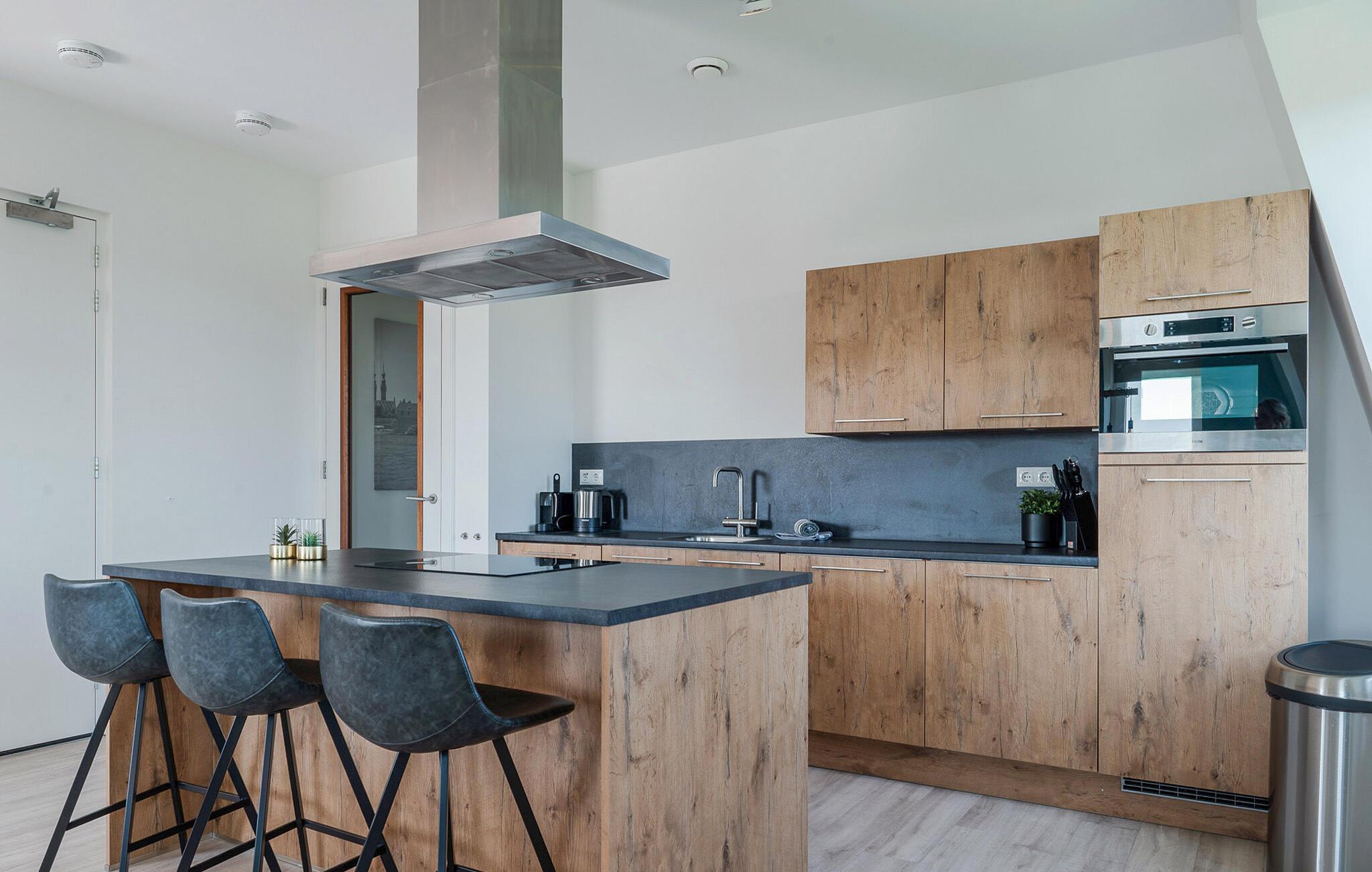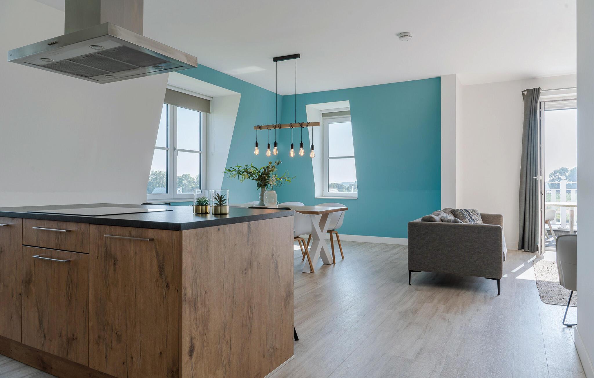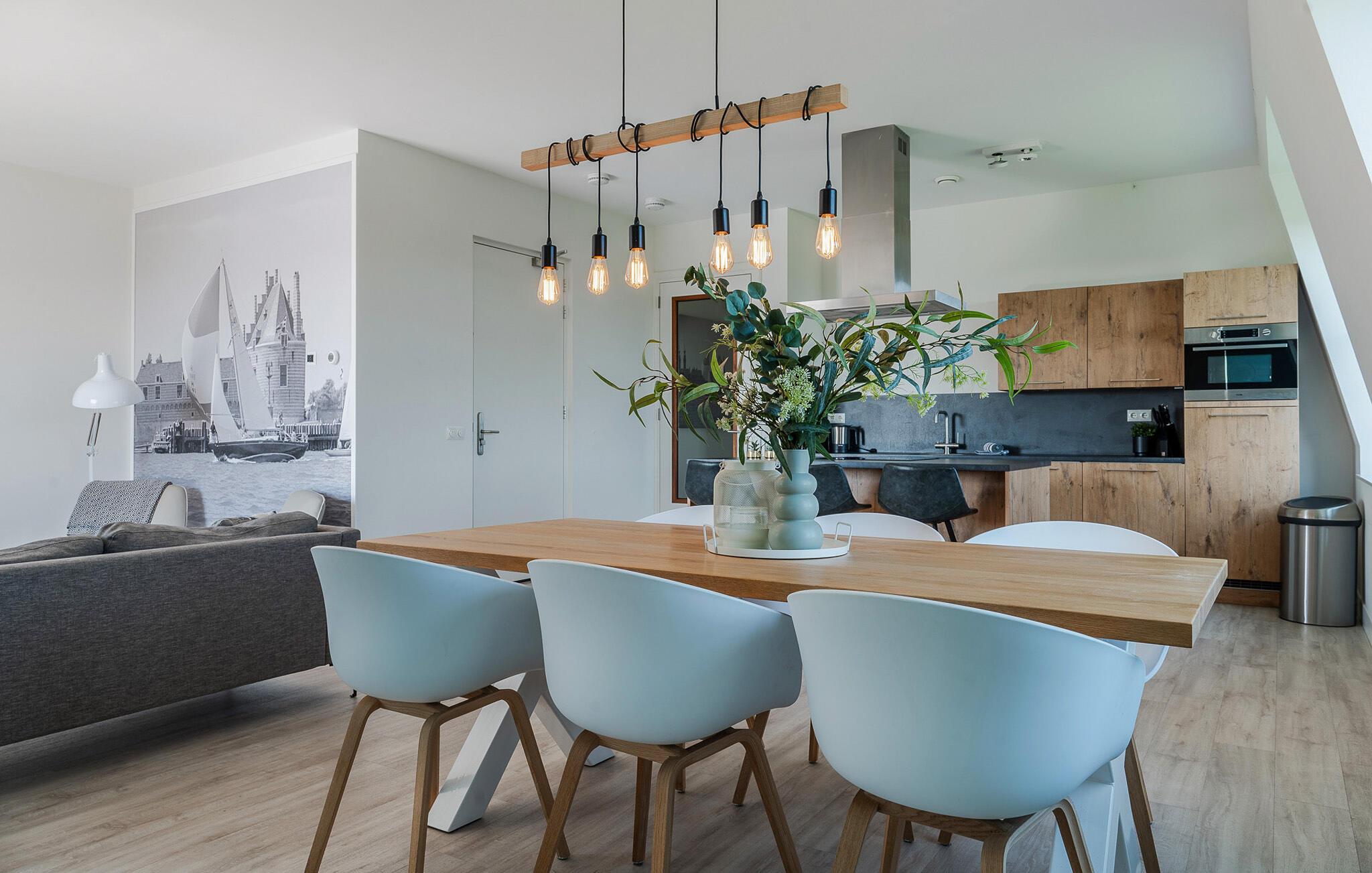 Denne moderne og luksuriøse ferielejlighed i en elegant lejlighedsbygning giver jer det perfekte sted at slappe af. De stilfulde møbler og den lyse, maritime atmosfære skaber en rolig og indbydende atmosfære. Her har I masser af plads til at finde jer godt til rette med familien eller venner. Mød hinanden i det åbne opholdsrum, der succesfuldt kombinerer køkken, spisestue og opholdsstue og lægger op til at lave mad, spise eller slappe af sammen.