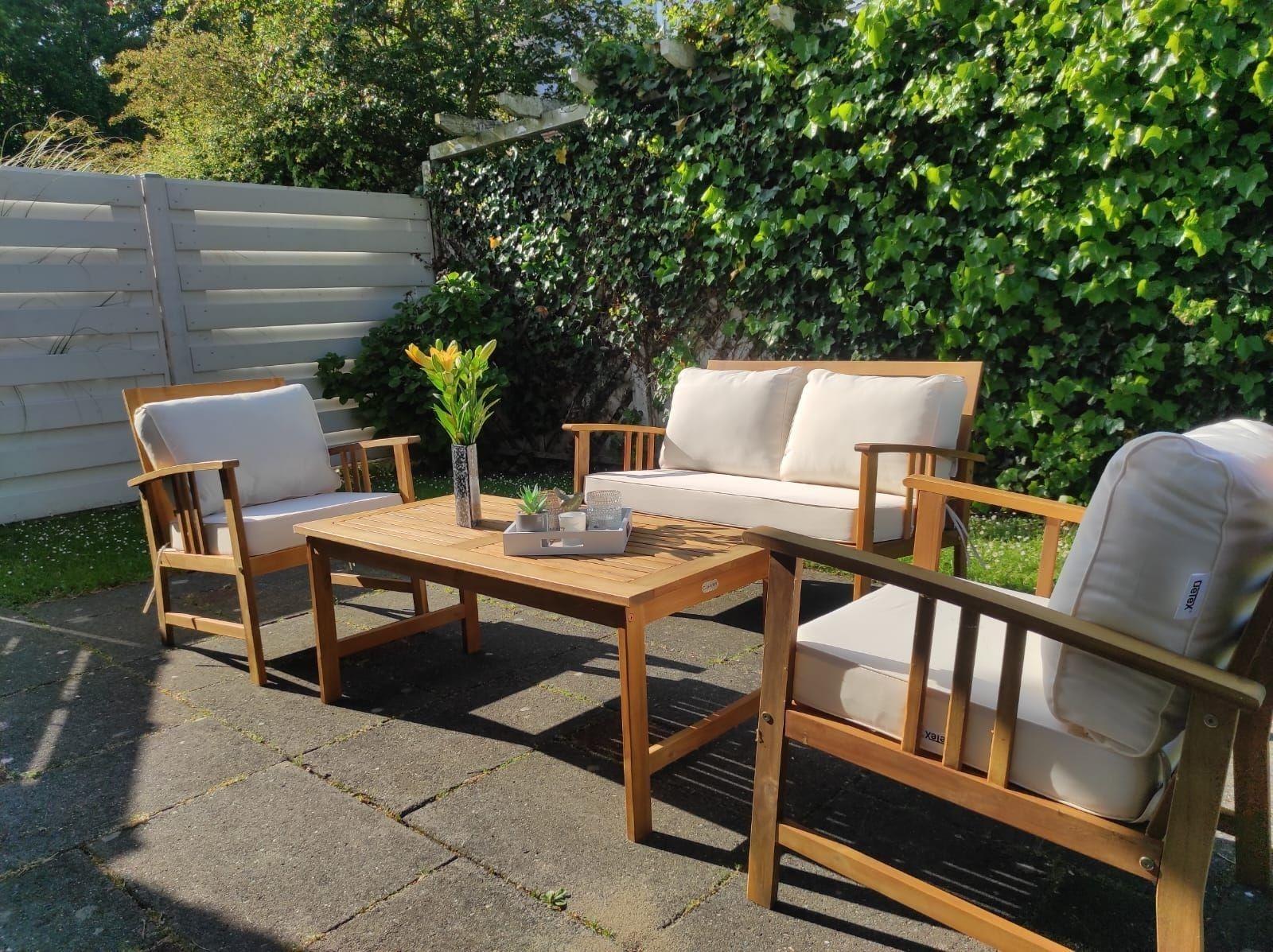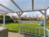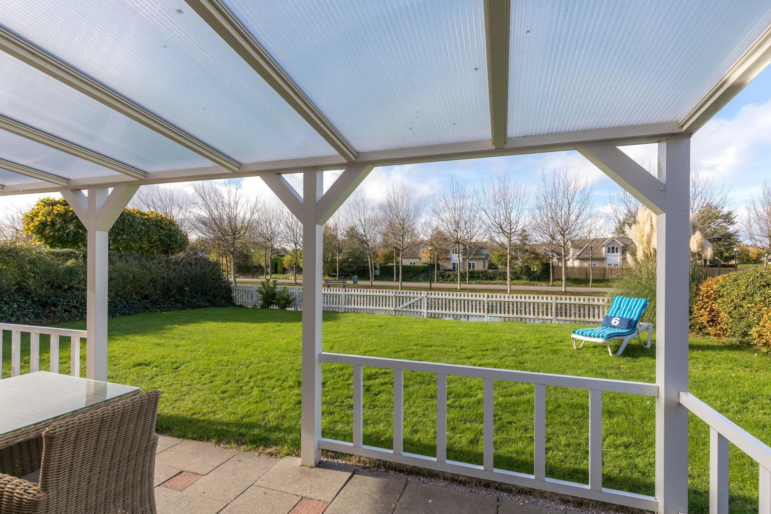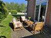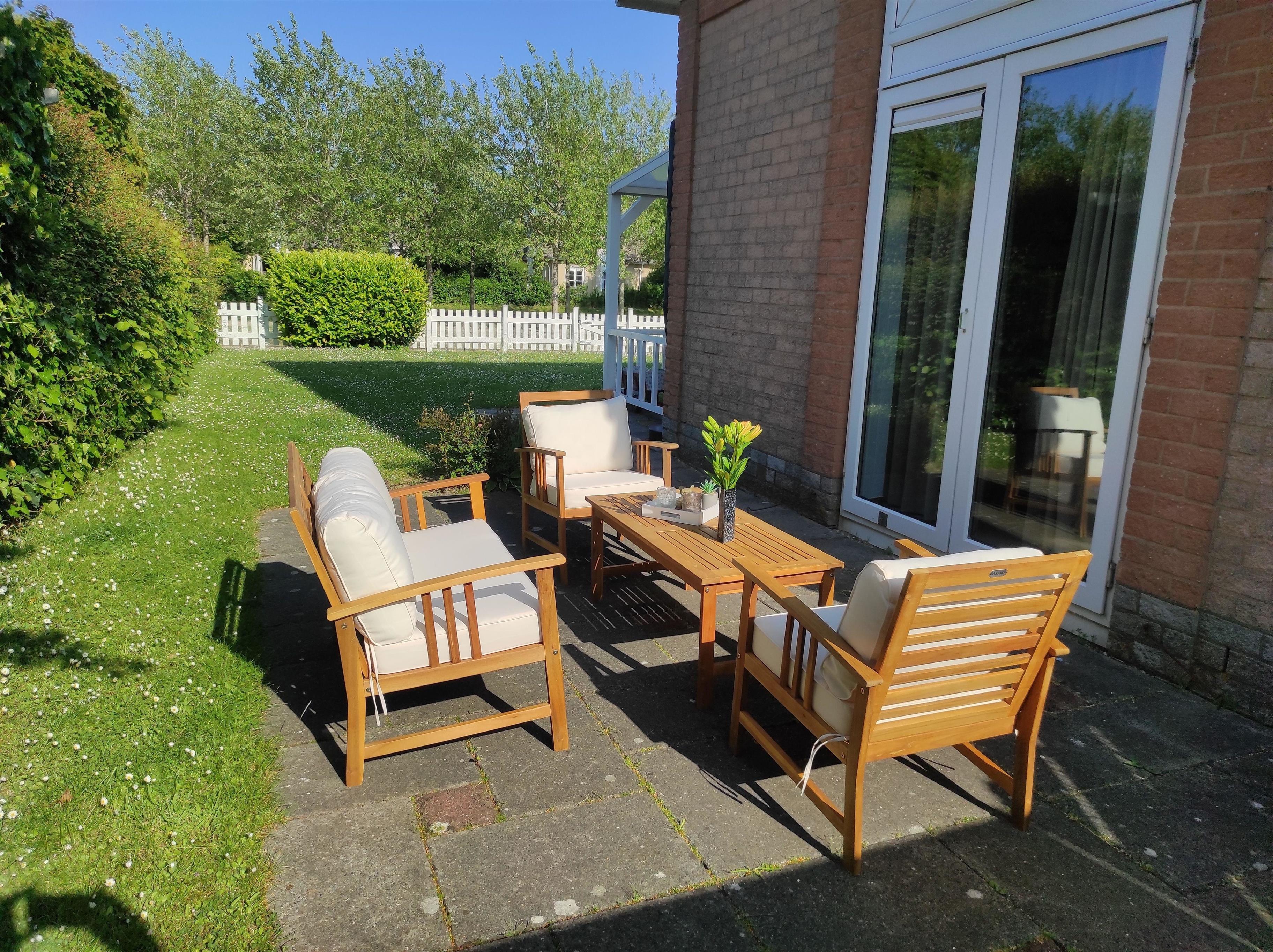 Vom Wohnbereich gelangt man auf die große überdachte Terrasse mit gemütlichen Gartensesseln und großem Tisch sowie zu einer weiteren kleineren Terrasse mit einer kleiner Lounge. Ein Kohlegrill ist vorhanden. Der ca. 300m² große Garten ist eingezäunt und direkt am Wasser, einem kleinen Kanal, gelegen. Vor dem Haus befinden sich zwei private PKW Stellplätze.