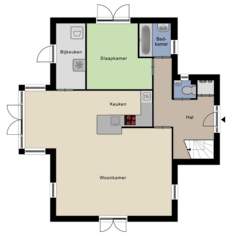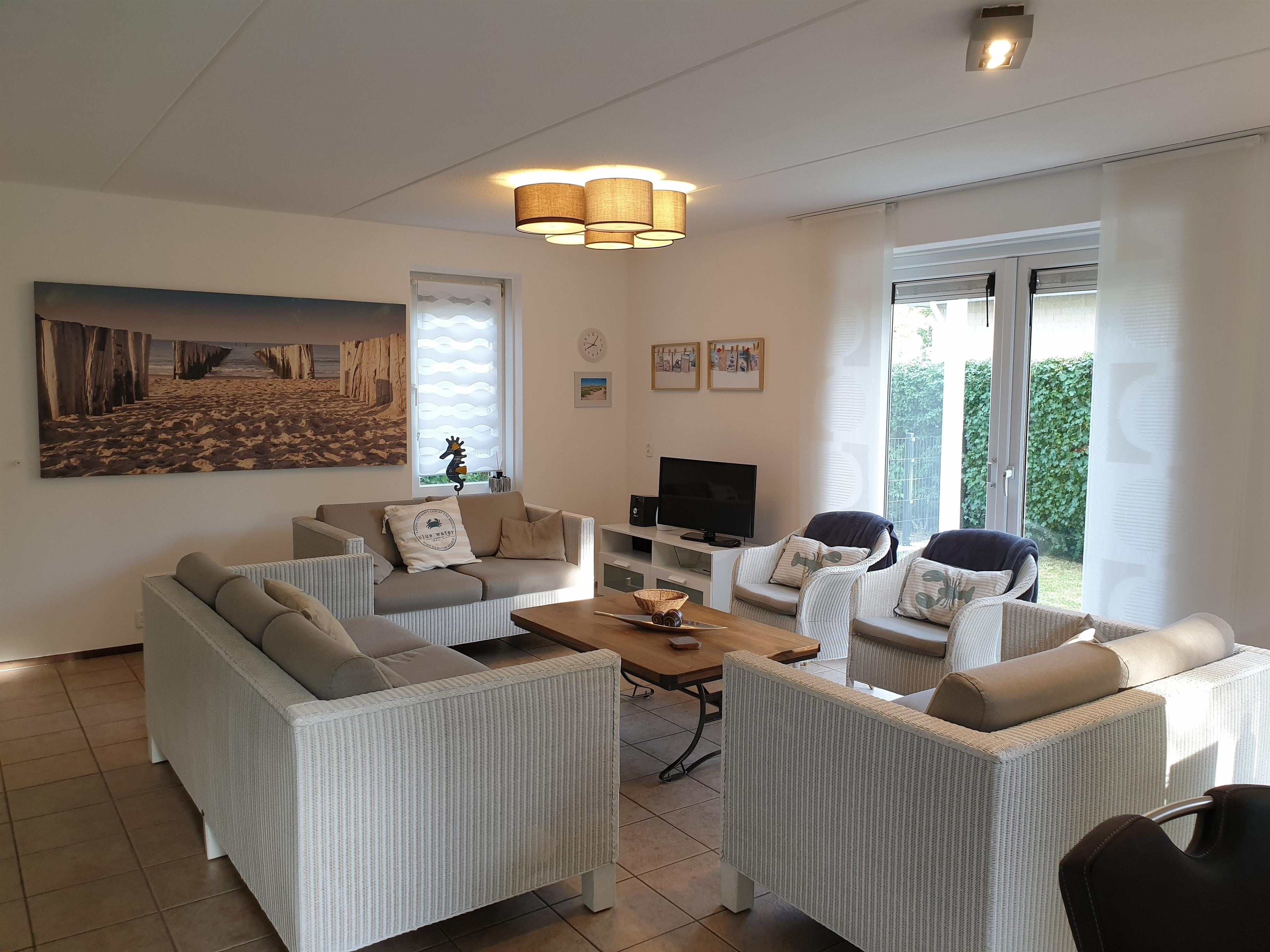 Das Ferienhaus verfügt im Erdgeschoss über einen geräumigen Wohn-/Essbereich mit TV und W-Lan, eine Küche mit Induktionskochfeld, Kühlschrank, Backofen und Spülmaschine, ein Badezimmer mit separater Toilette, ein Schlafzimmer sowie einen Hauswirtschaftsraum mit Waschmaschine, Trockner, Mikrowelle und Kühl-/Gefrierkombination.