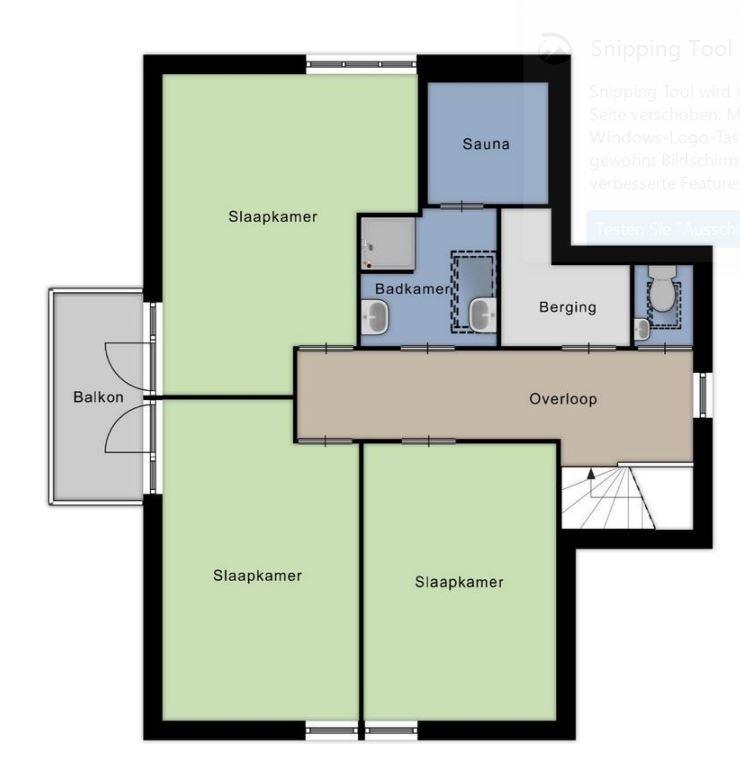 Im Obergeschoss befinden sich drei weitere Schlafzimmer, ein Badezimmer mit Sauna sowie eine Toilette. Ein Balkon ist von zwei Schlafzimmern begehbar.