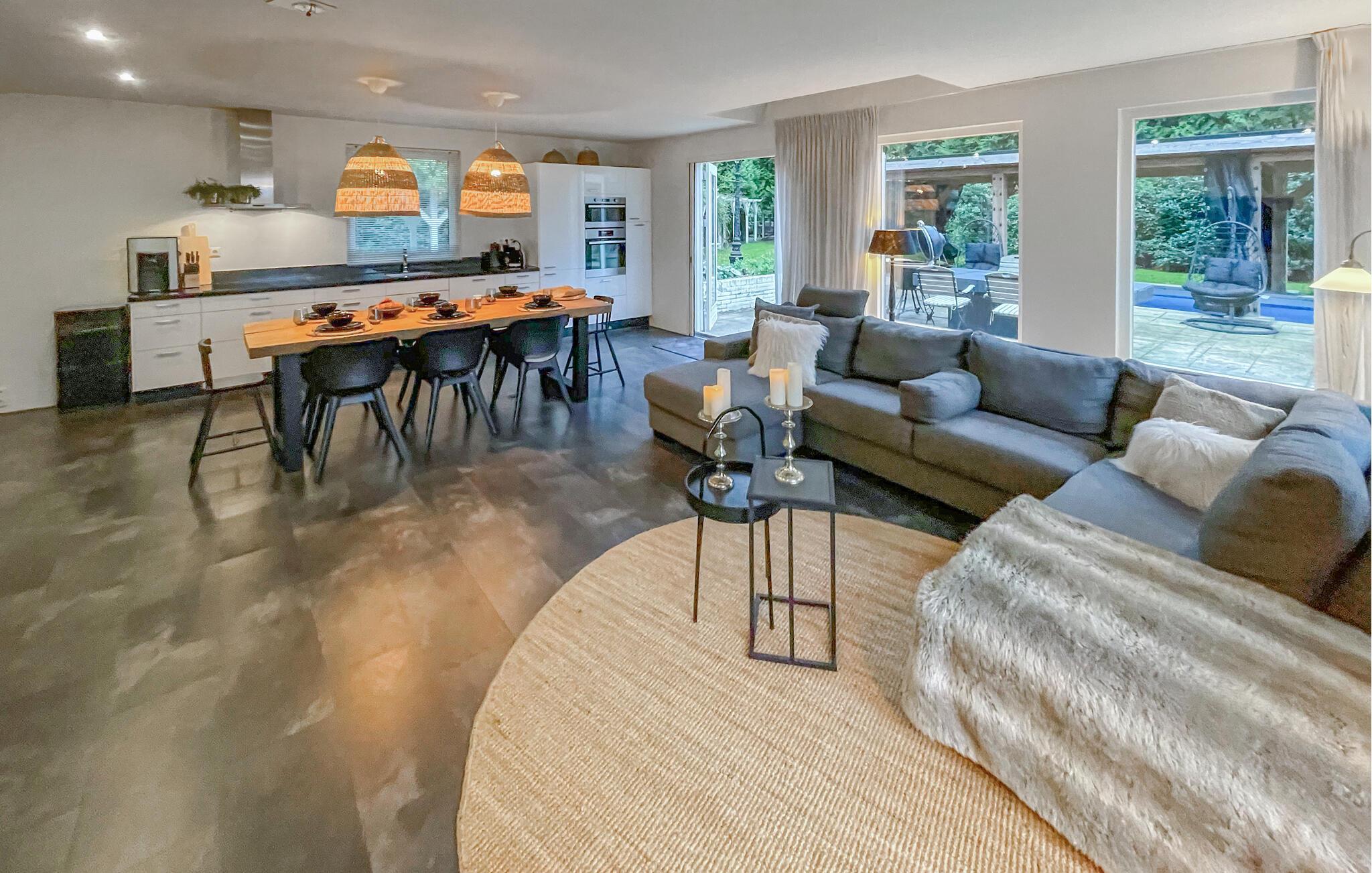 Jeres feriehus nær Rhuinen er ideelt for familier eller grupper. Indenfor finder I et åbent opholdsområde med komfortable sofaer og et stort spisebord, det ideelle sted til fælles måltider. Hyg jer i udestuen med de stilfulde siddepladser, og nyd udsigten over den velholdte have.