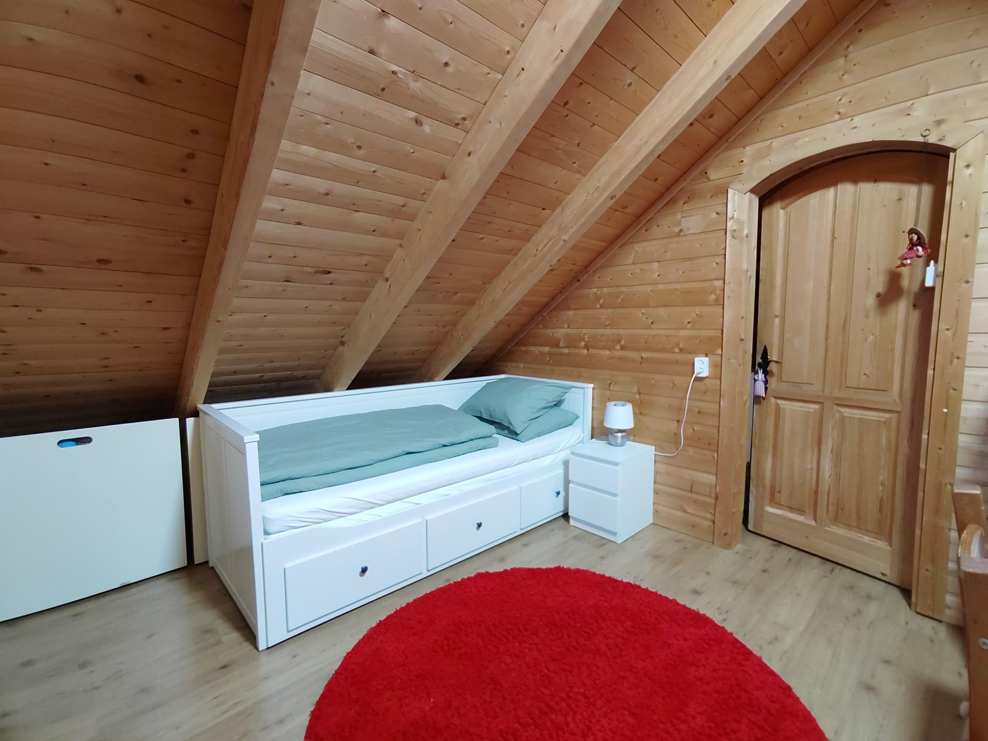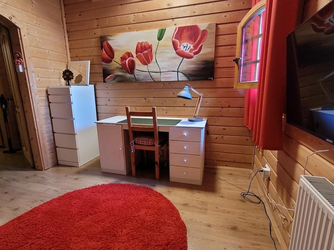 1x kleines Doppelbett in 140x200m, 1 Kommode und Stauraum in den Bettschubladen.