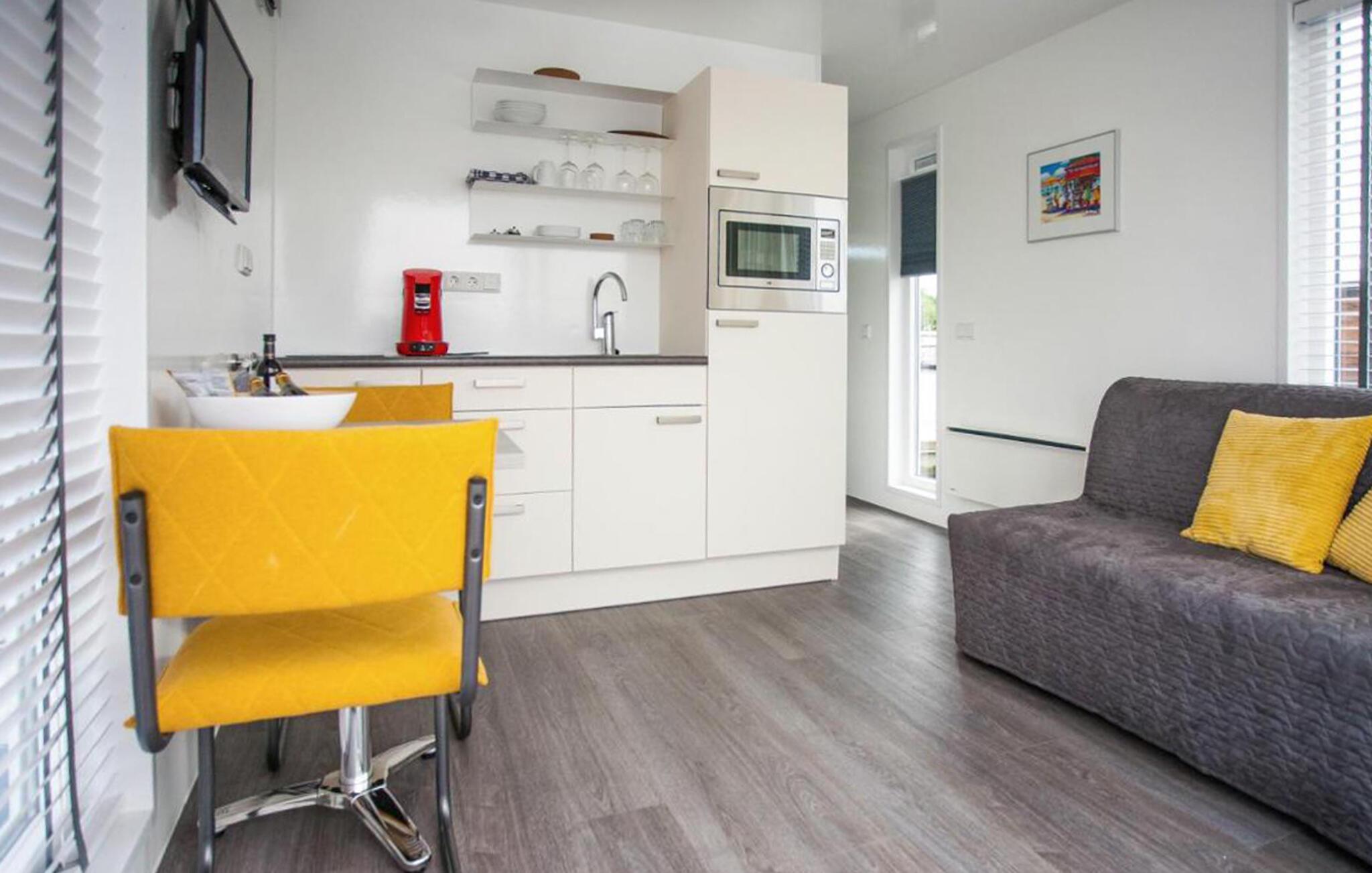 Denne husbåd ligger fortøjet på en dejlig lystbådehavn med masser af faciliteter og en fantastisk restaurant i gåafstand. Som par kan I se frem til en afslappende stund i denne husbåd, som har moderne og farvekoordineret indretning og udstyr. Nyd den lyse stue, hvor I kan lave mad sammen eller bare slappe af i sofaen. Begynd jeres dag med en dejlig morgenmad på den overdækkede terrasse og planlæg jeres næste aktiviteter.